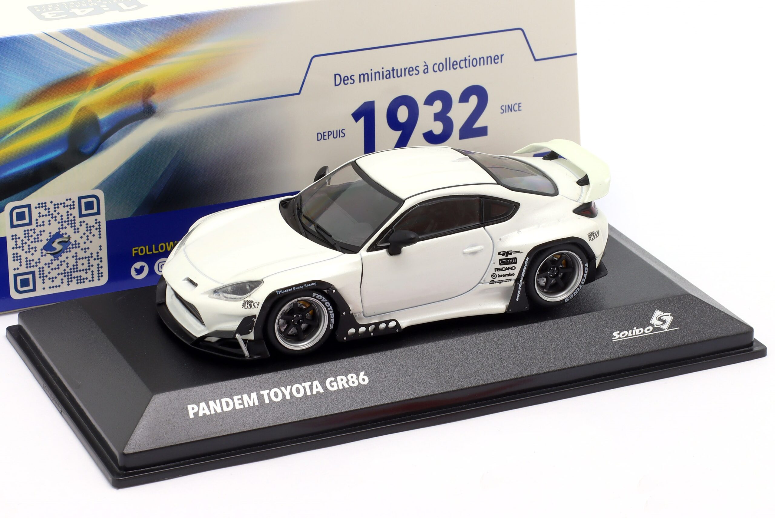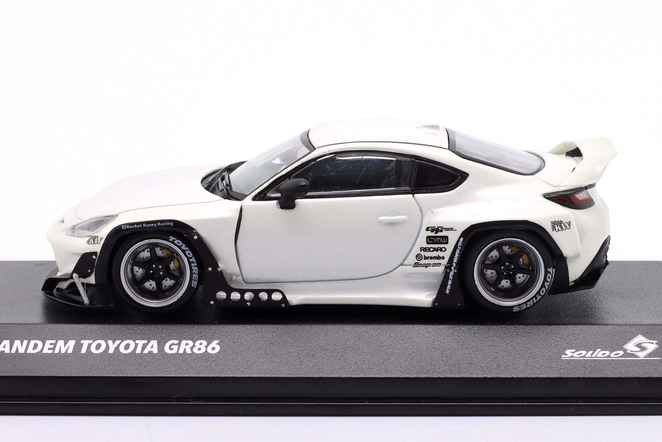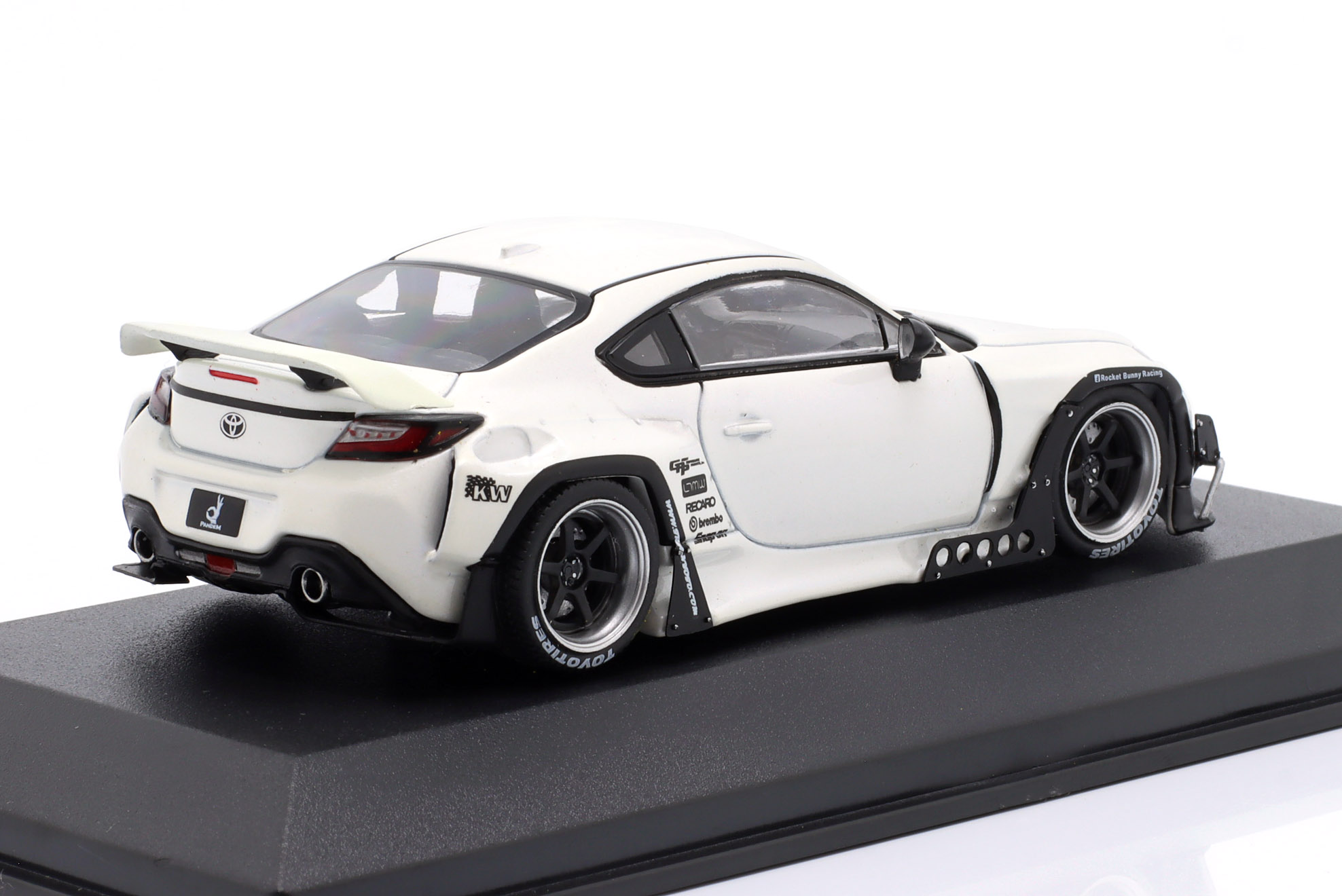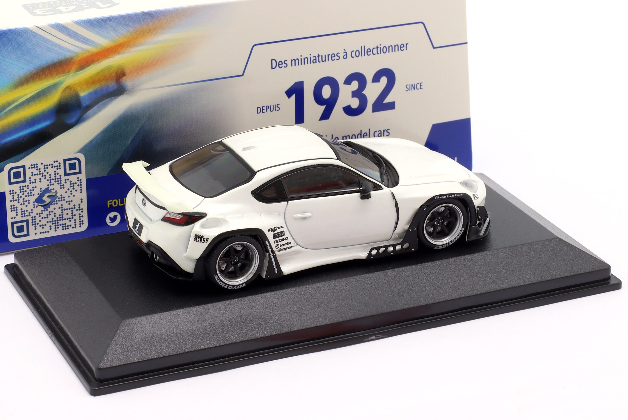 Kolekcjonerski model metalowy z elementami plastikowymi samochodu TOYOTA GR86 Pandem Rocket Bunny z roku 2002 w kolorze Białym.Model na podstawce,posiada akrylową gablotkę ekspozycyjną.