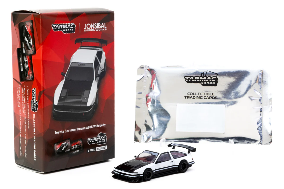 Kolekcjonerski model metalowy z elementami plastikowymi samochodu TOYOTA SPRINTER TRUENO AE86 Widebody Jonsibal w kolorze Biały/Czarny.Model zapakowany w kartonowe pudełko.W zestawie 2 karty kolekcjonerskie.