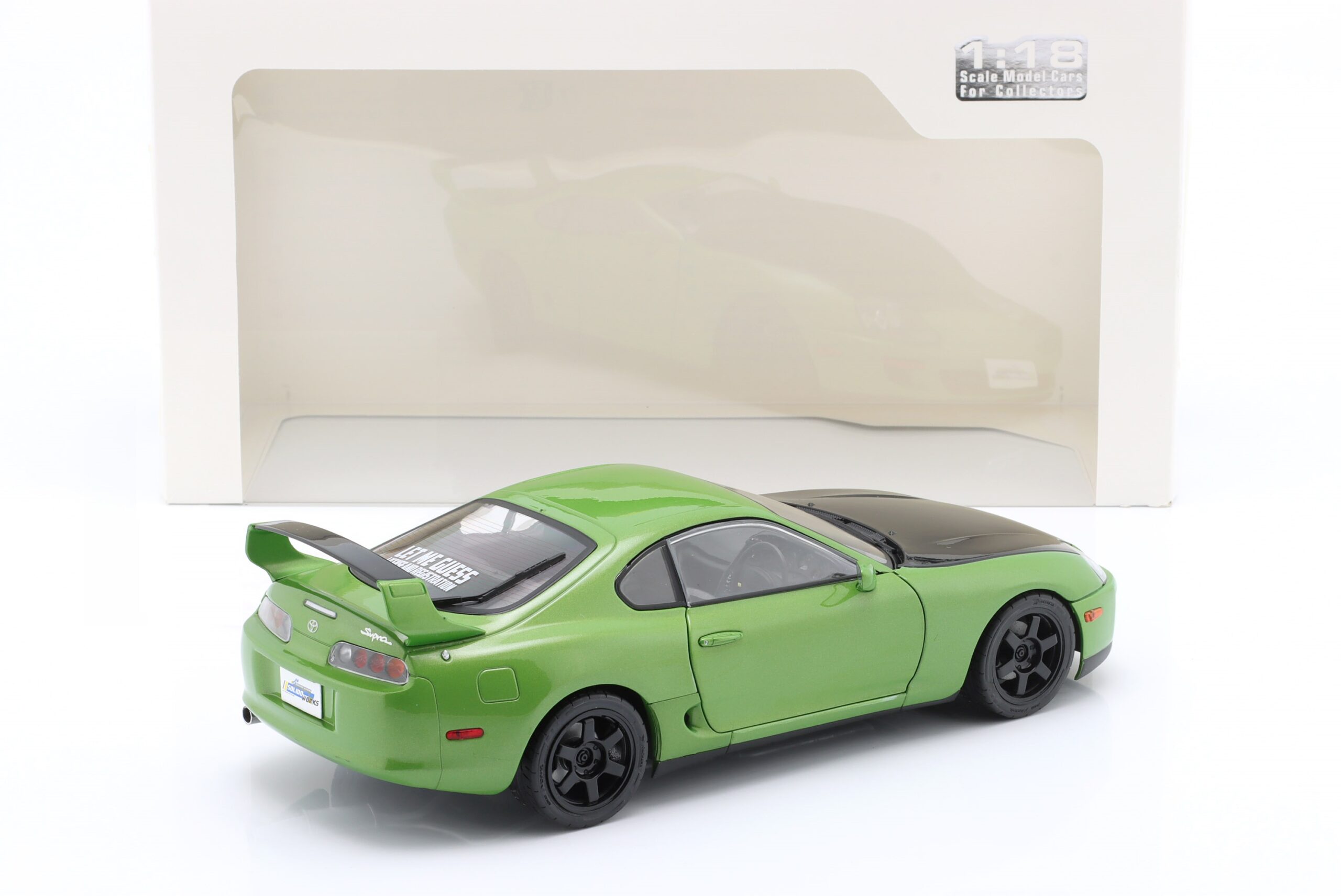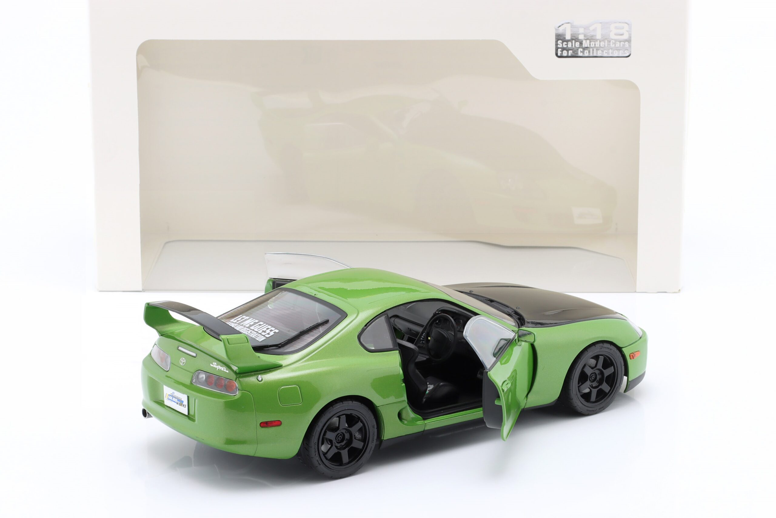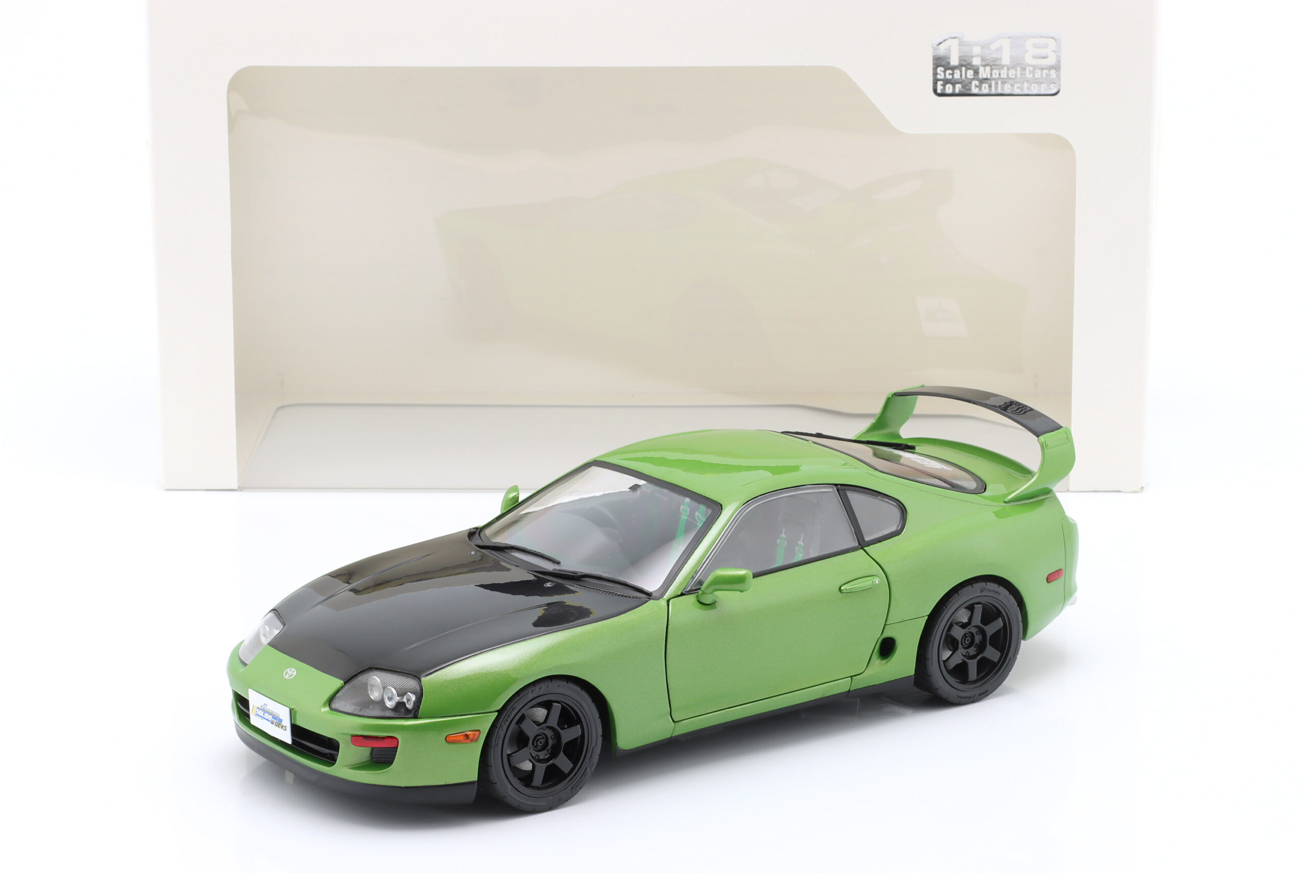 Kolekcjonerski model metalowy z elementami plastikowymi samochodu TOYOTA SUPRA MK4 (A80) z roku 1993 w kolorze Zielony metallic z czarną pokrywą silnika.Model posiada otwierane drzwi.