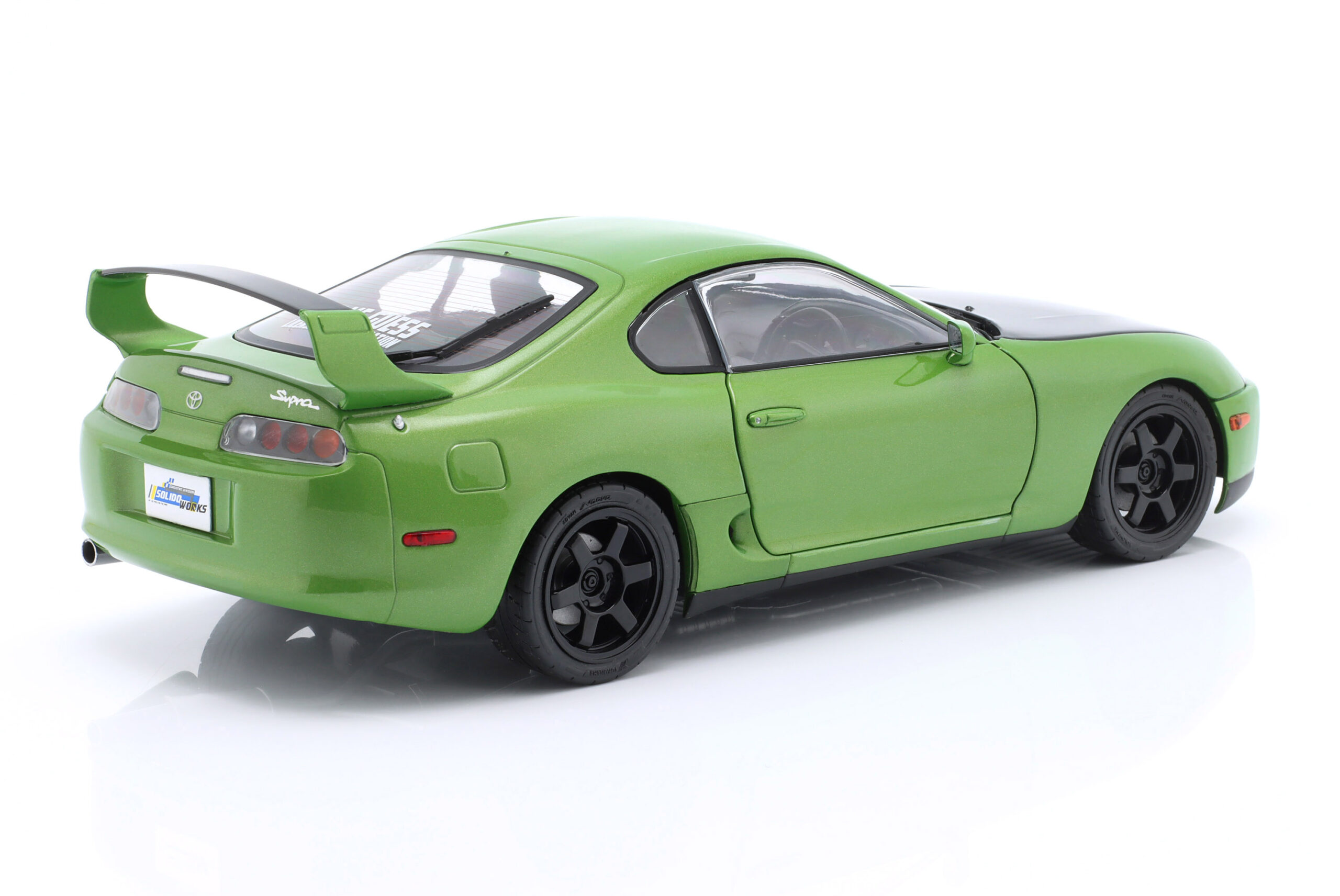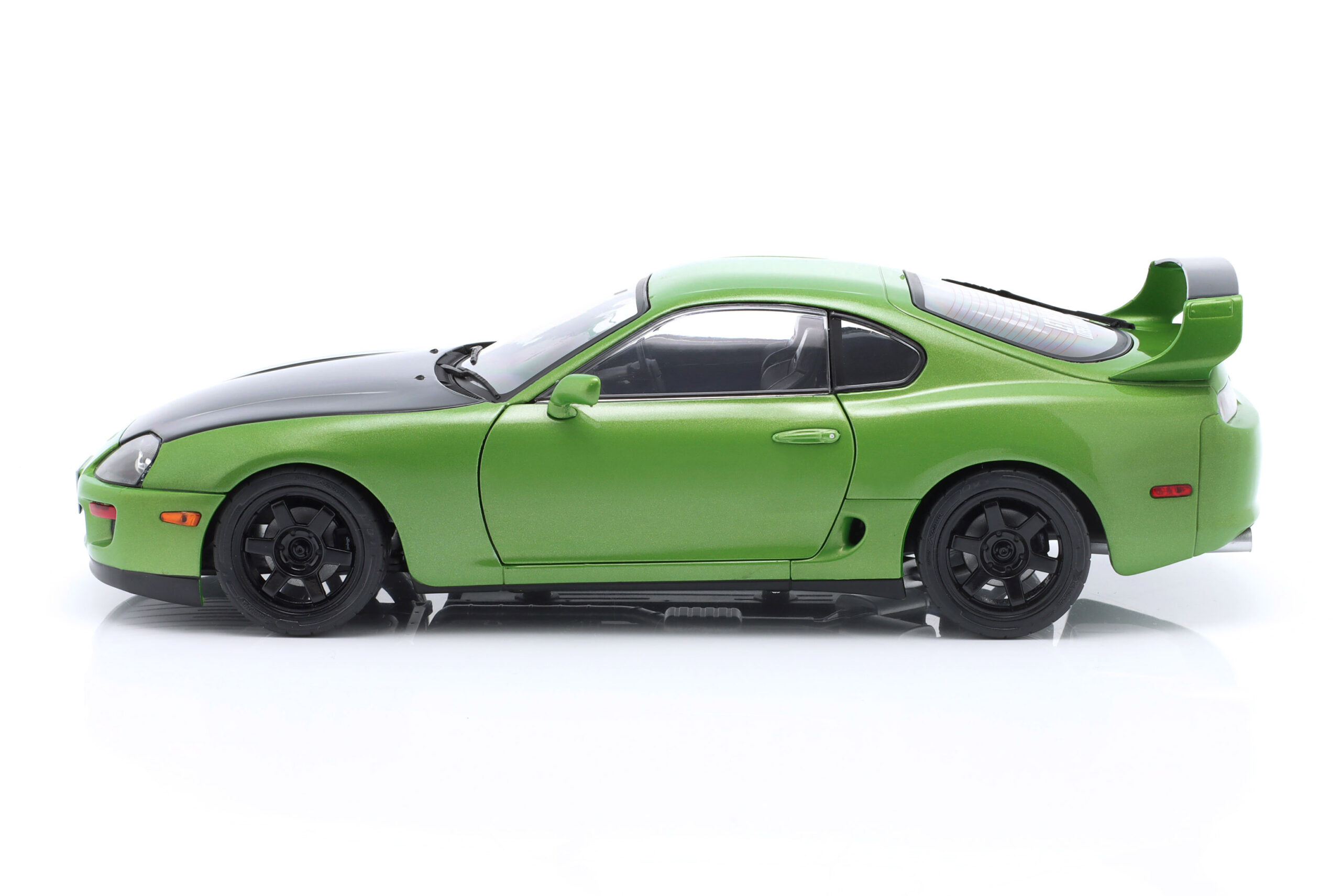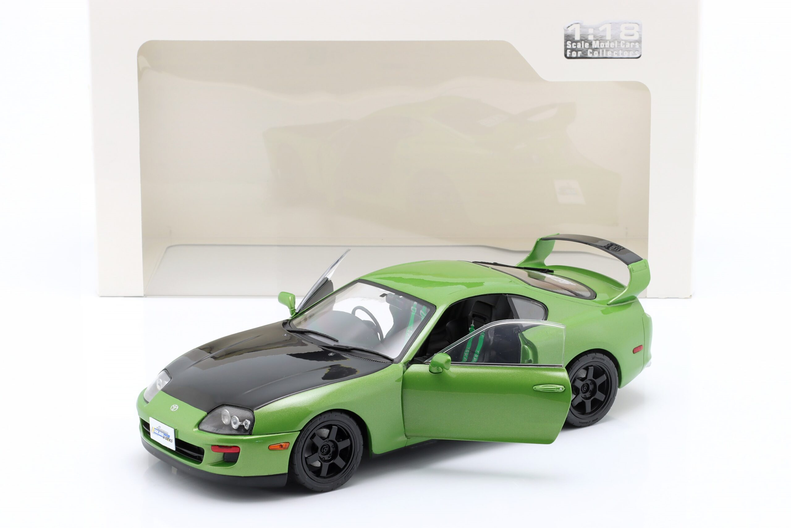 Kolekcjonerski model metalowy z elementami plastikowymi samochodu TOYOTA SUPRA MK4 (A80) z roku 1993 w kolorze Zielony metallic z czarną pokrywą silnika.Model posiada otwierane drzwi.