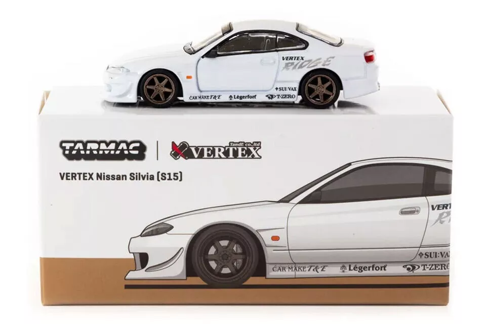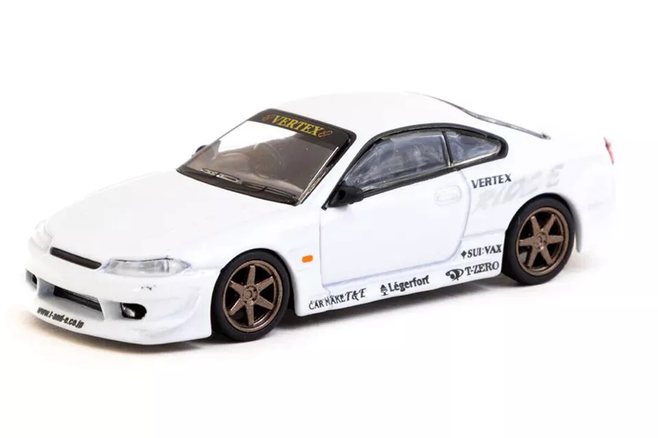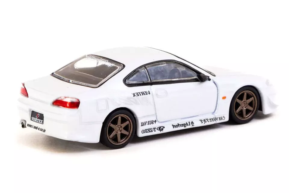 Kolekcjonerski model metalowy z elementami plastikowymi samochodu VERTEX NISSAN SILVIA S15 w kolorze Biały metallic.