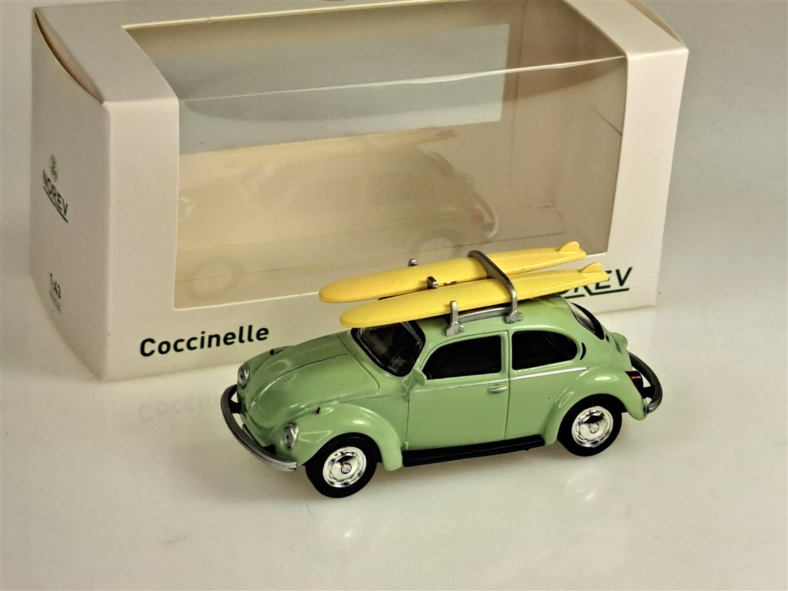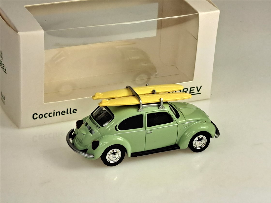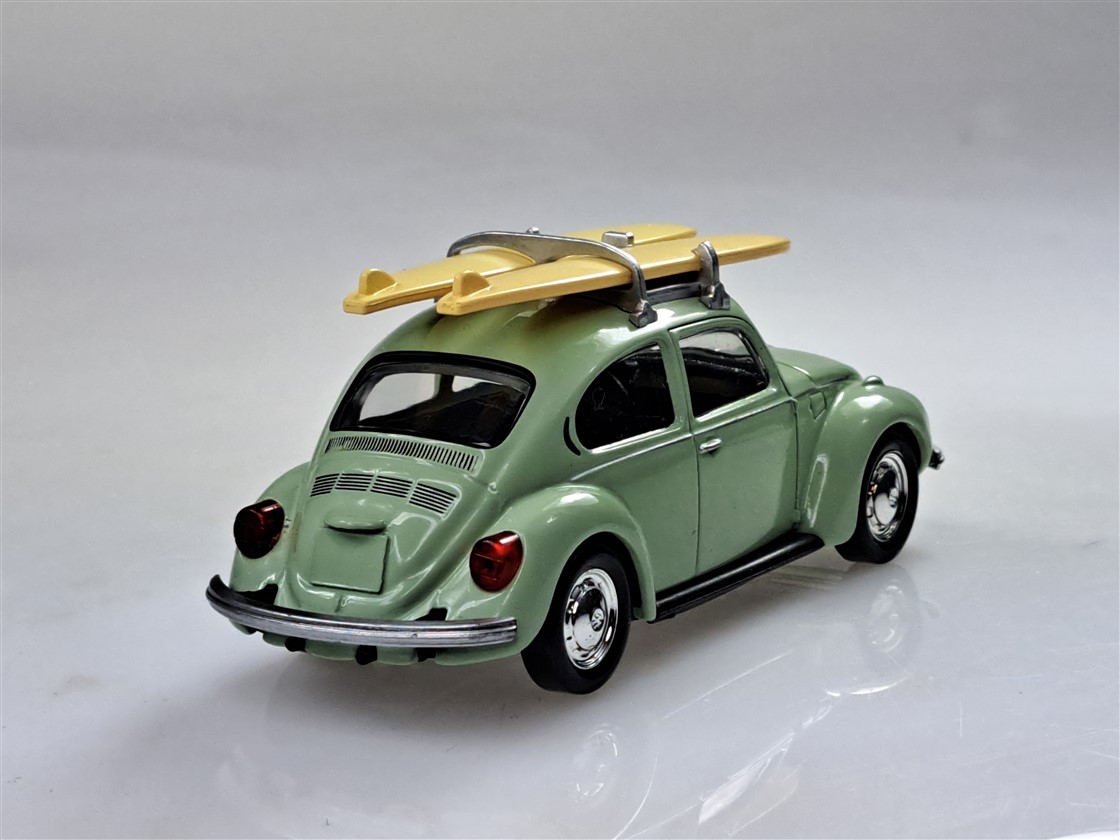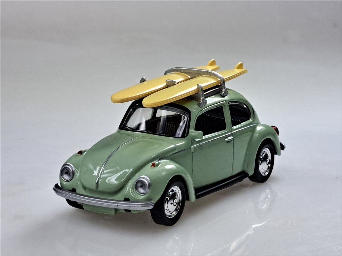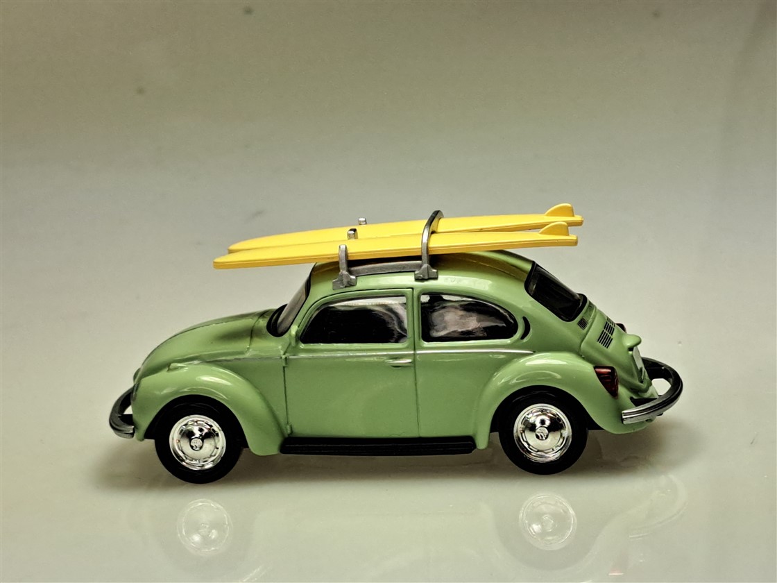 Kolekcjonerski model metalowy z elementami plastikowymi samochodu VOLKSWAGEN BEETLE 1303 z deskami surfingowymi na dachu z roku 1973 w kolorze Zielonym.