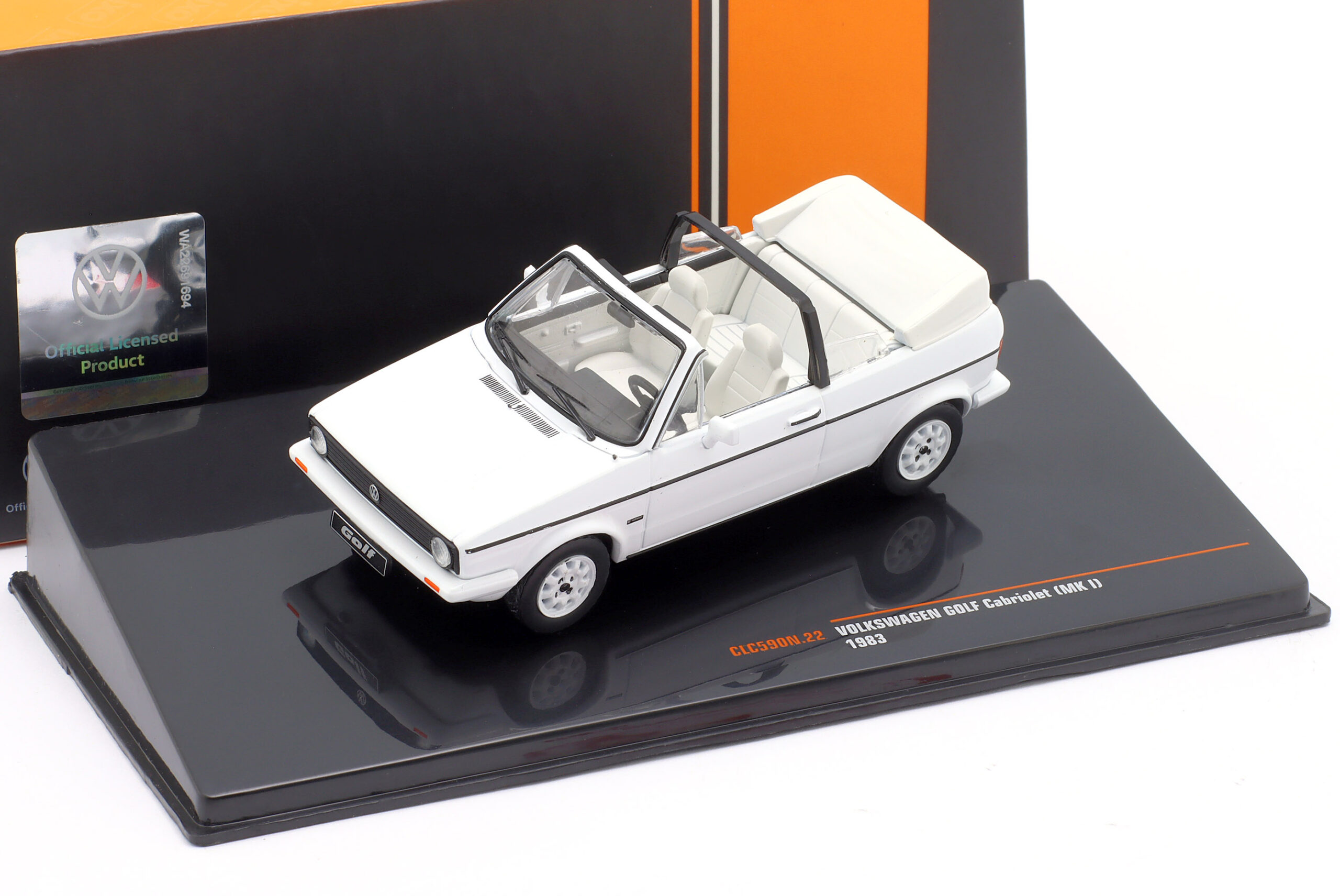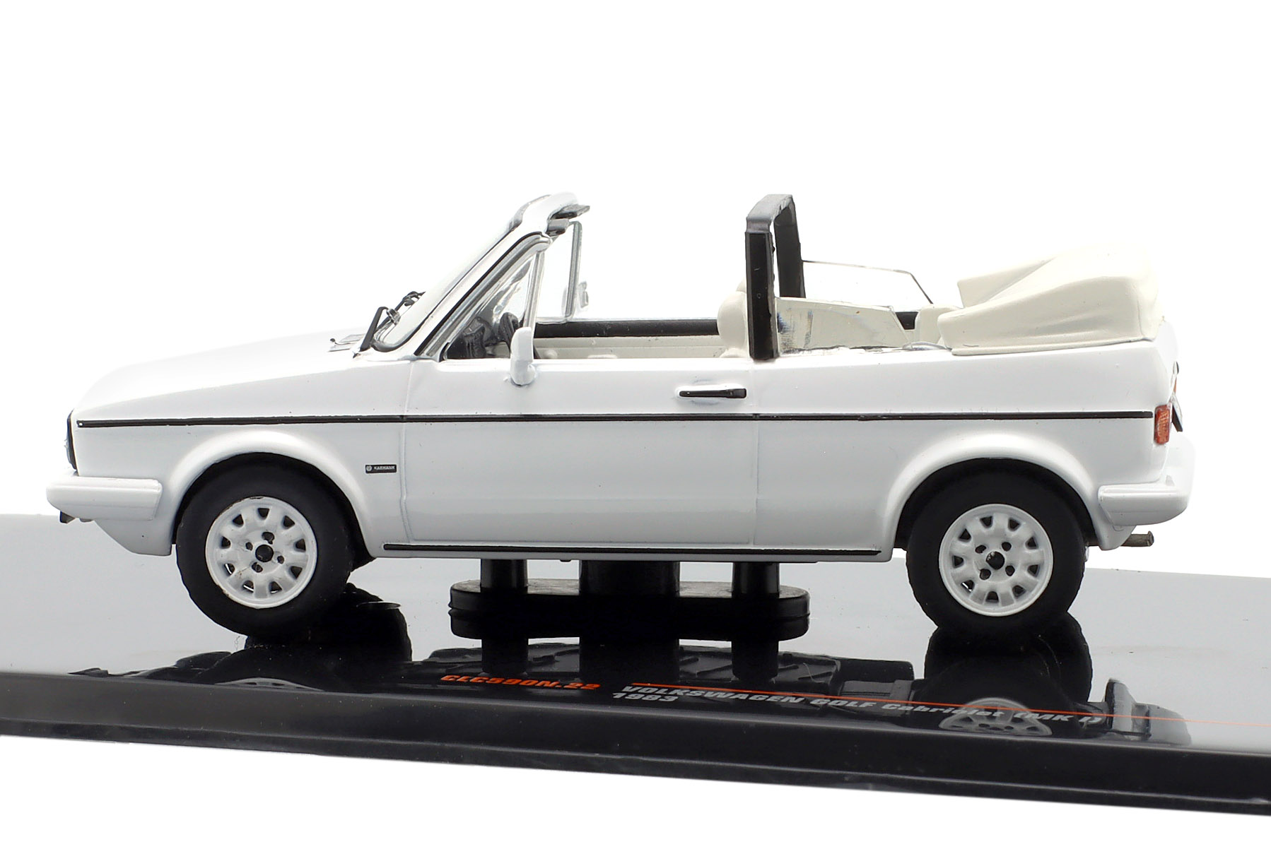 Kolekcjonerski model metalowy z elementami plastikowymi samochodu VOLKSWAGEN GOLF Cabriolet z roku 1983 w kolorze Białym.Model na podstawce,posiada akrylową gablotkę ekspozycyjną,nie posiada otwieranych elementów.