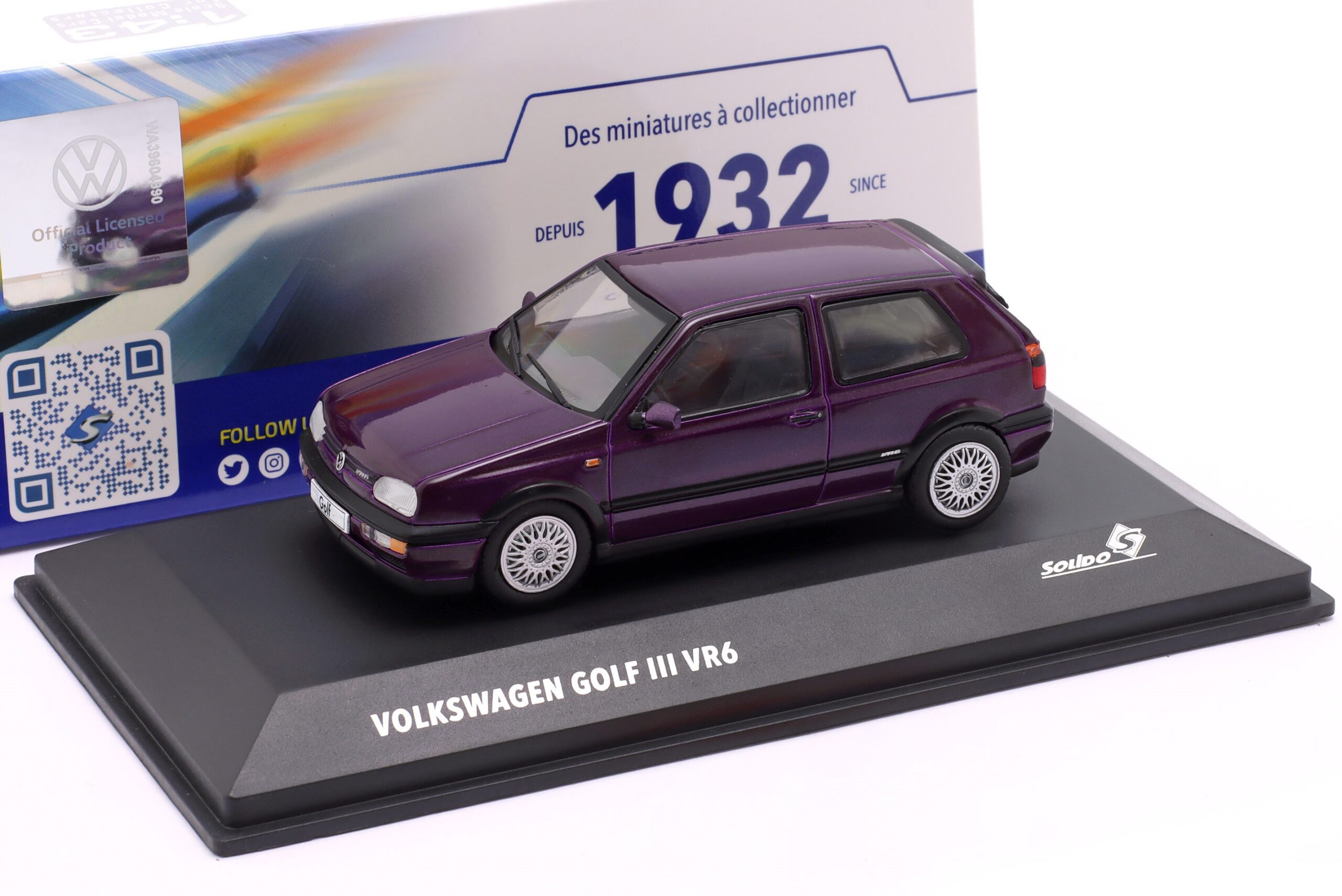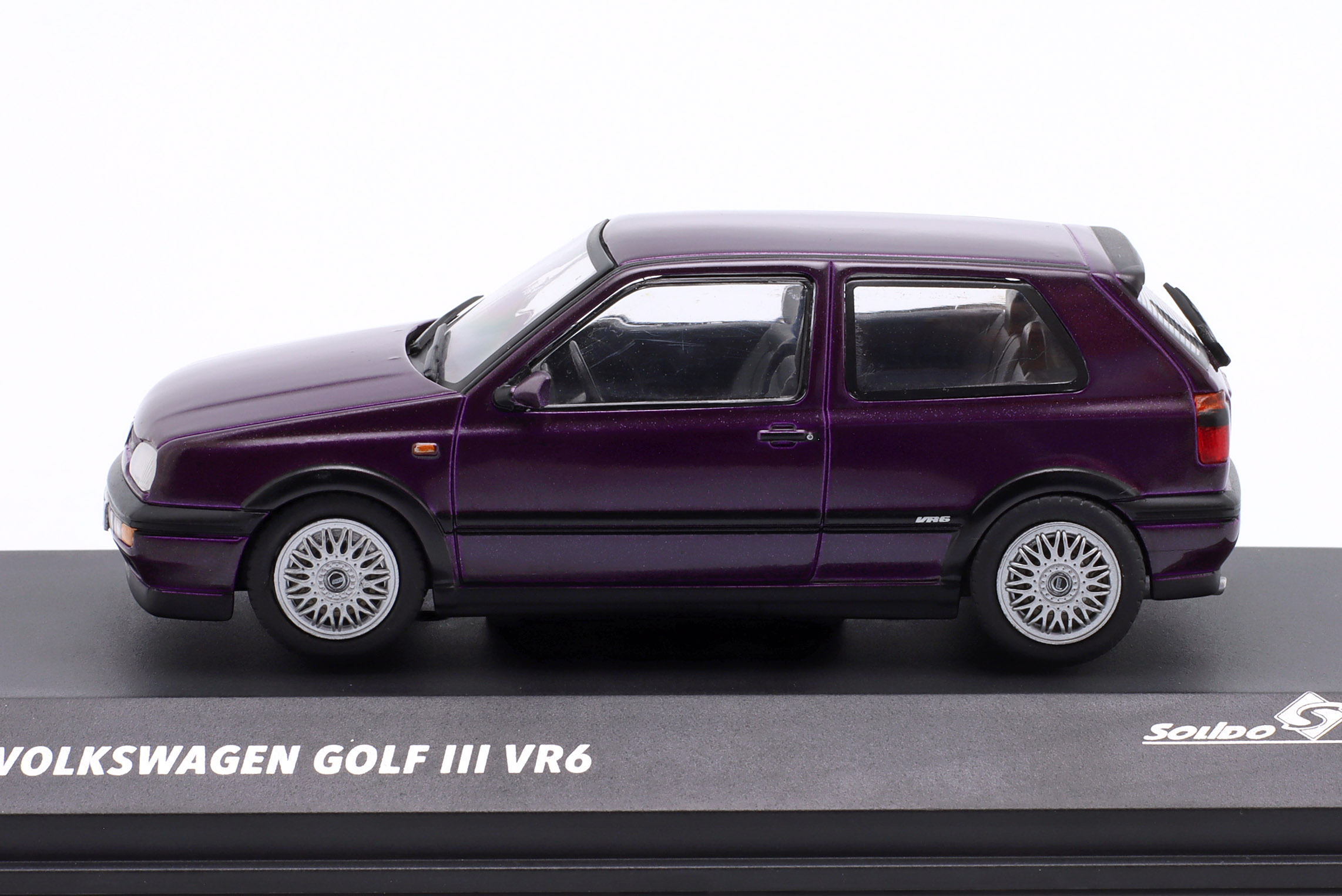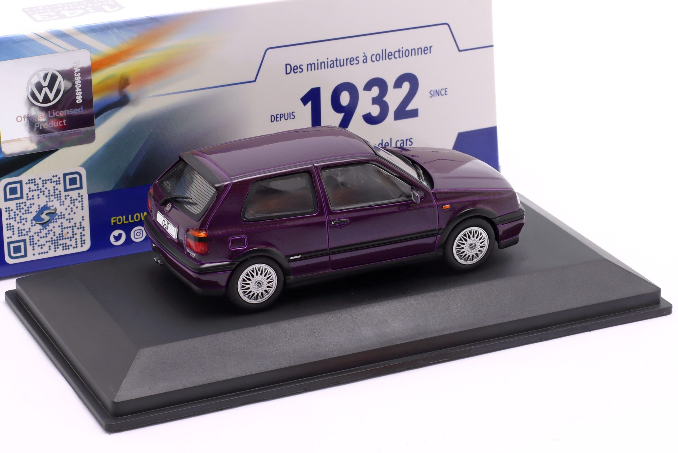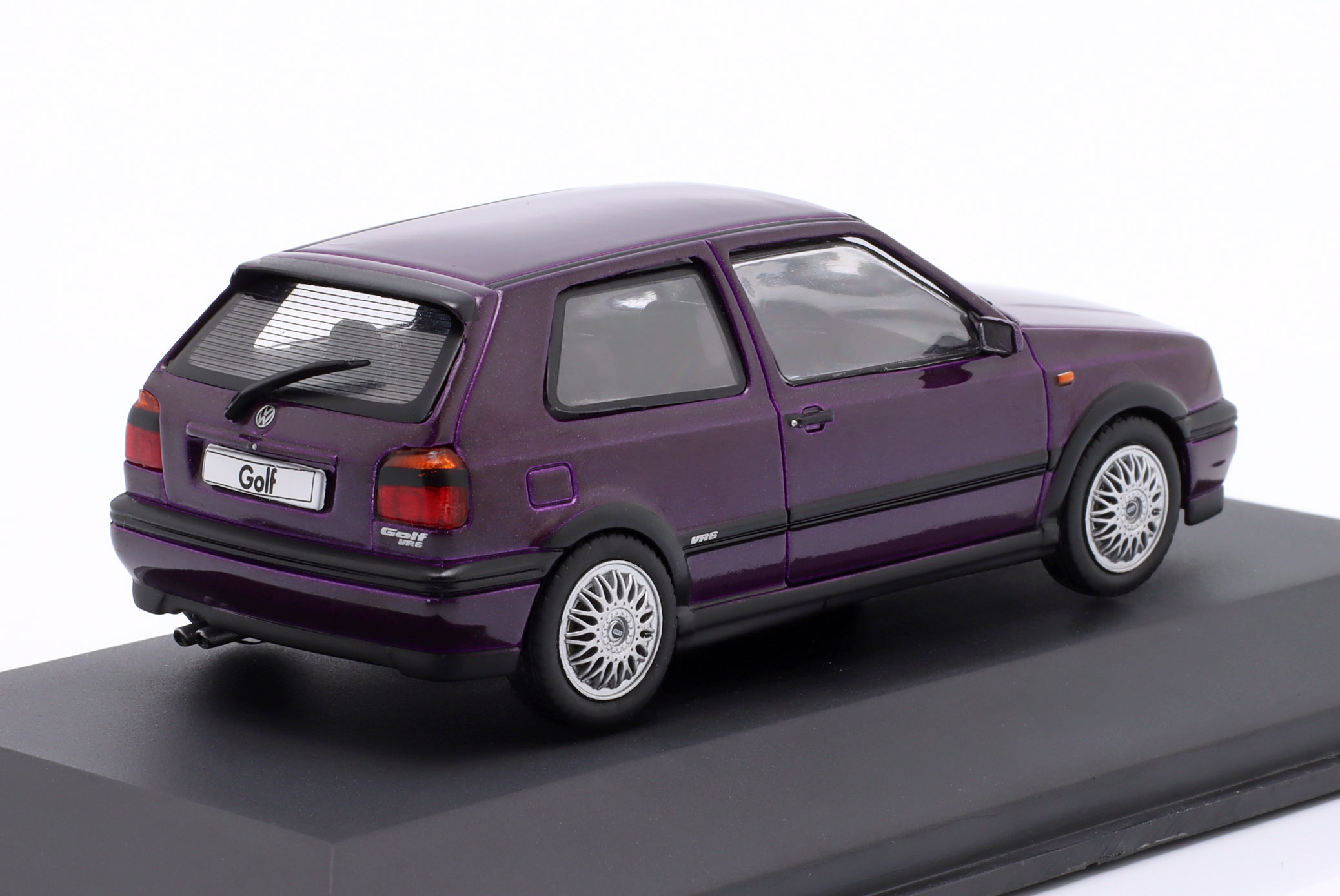 Kolekcjonerski model metalowy z elementami plastikowymi samochodu VOLKSWAGEN GOLF III VR6 z roku 1994 w kolorze Lila metallic.Model na podstawce,posiada akrylową gablotkę ekspozycyjną.