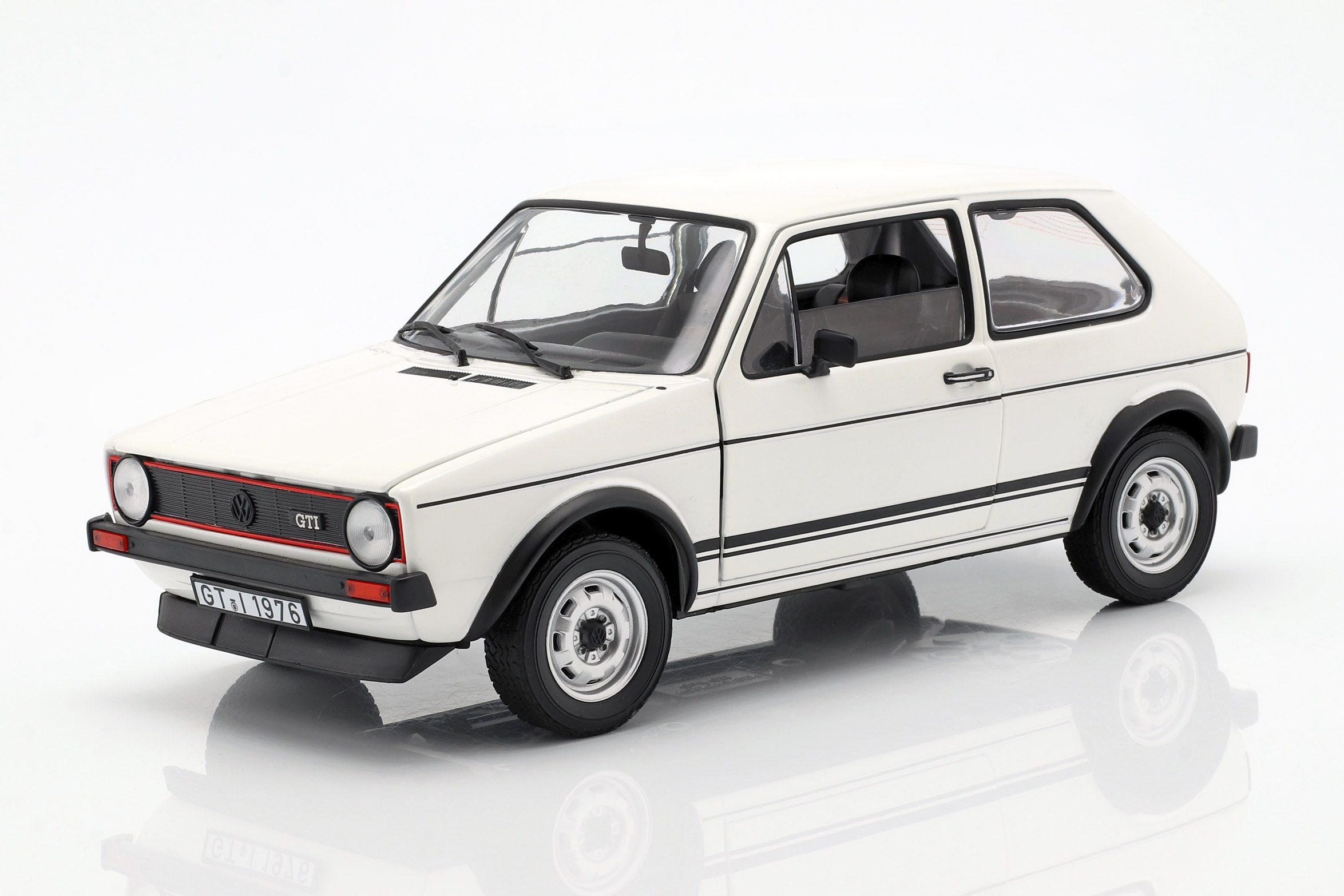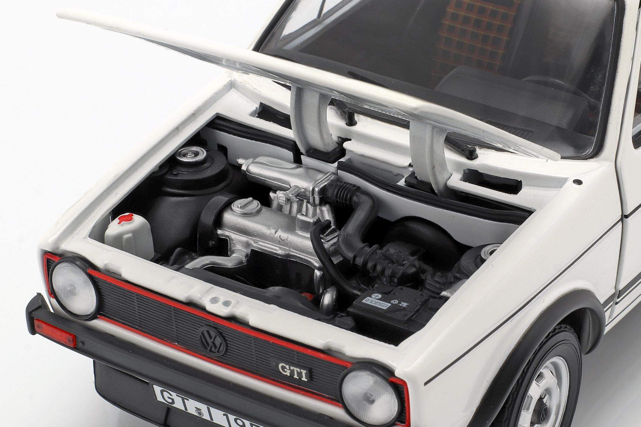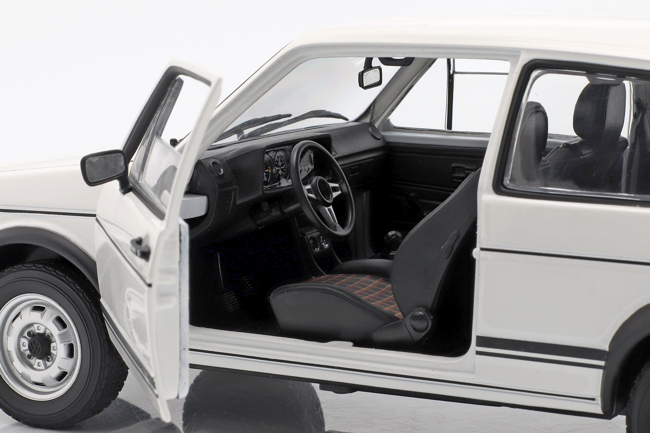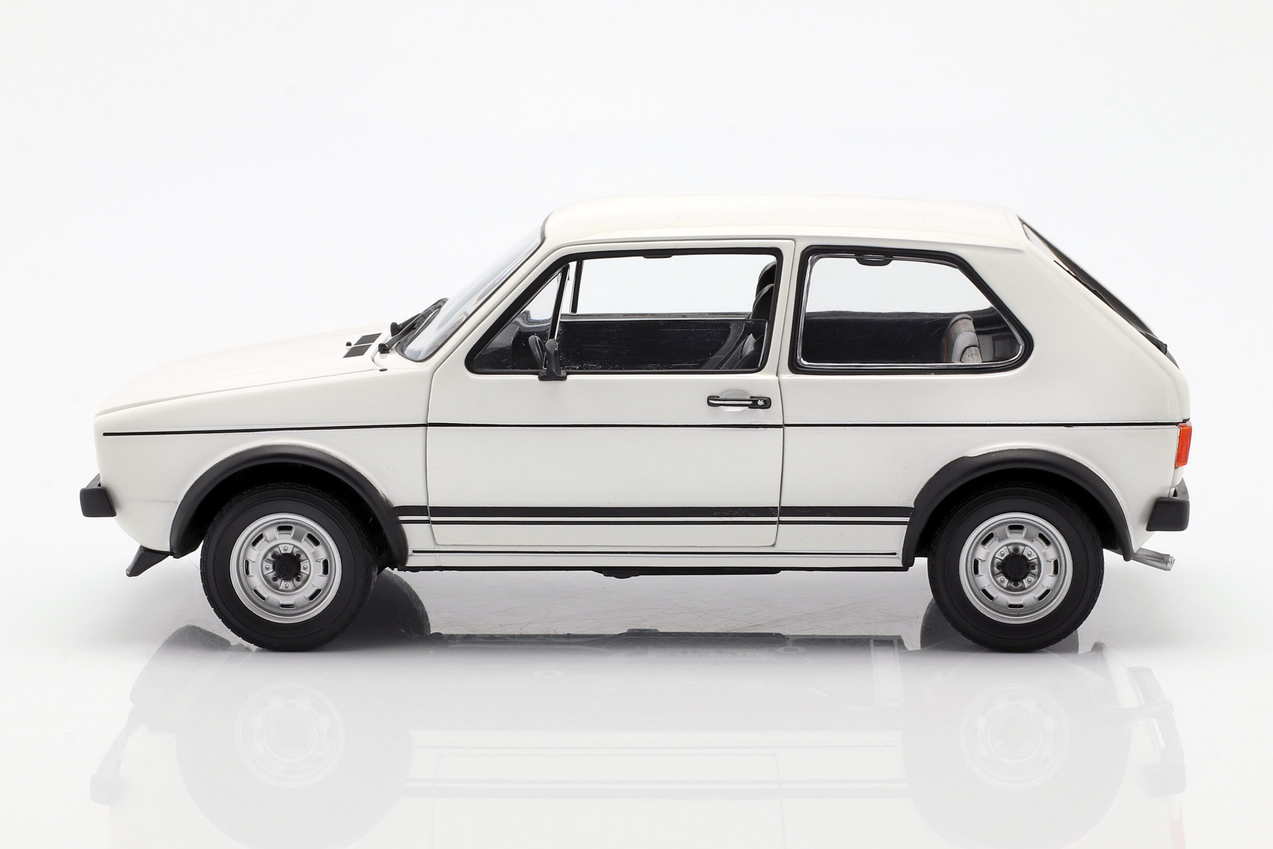 Kolekcjonerski model metalowy z elementami plastikowymi samochodu VOLKSWAGEN GOLF MkI GTI z roku 1976 w kolorze Alpine White.