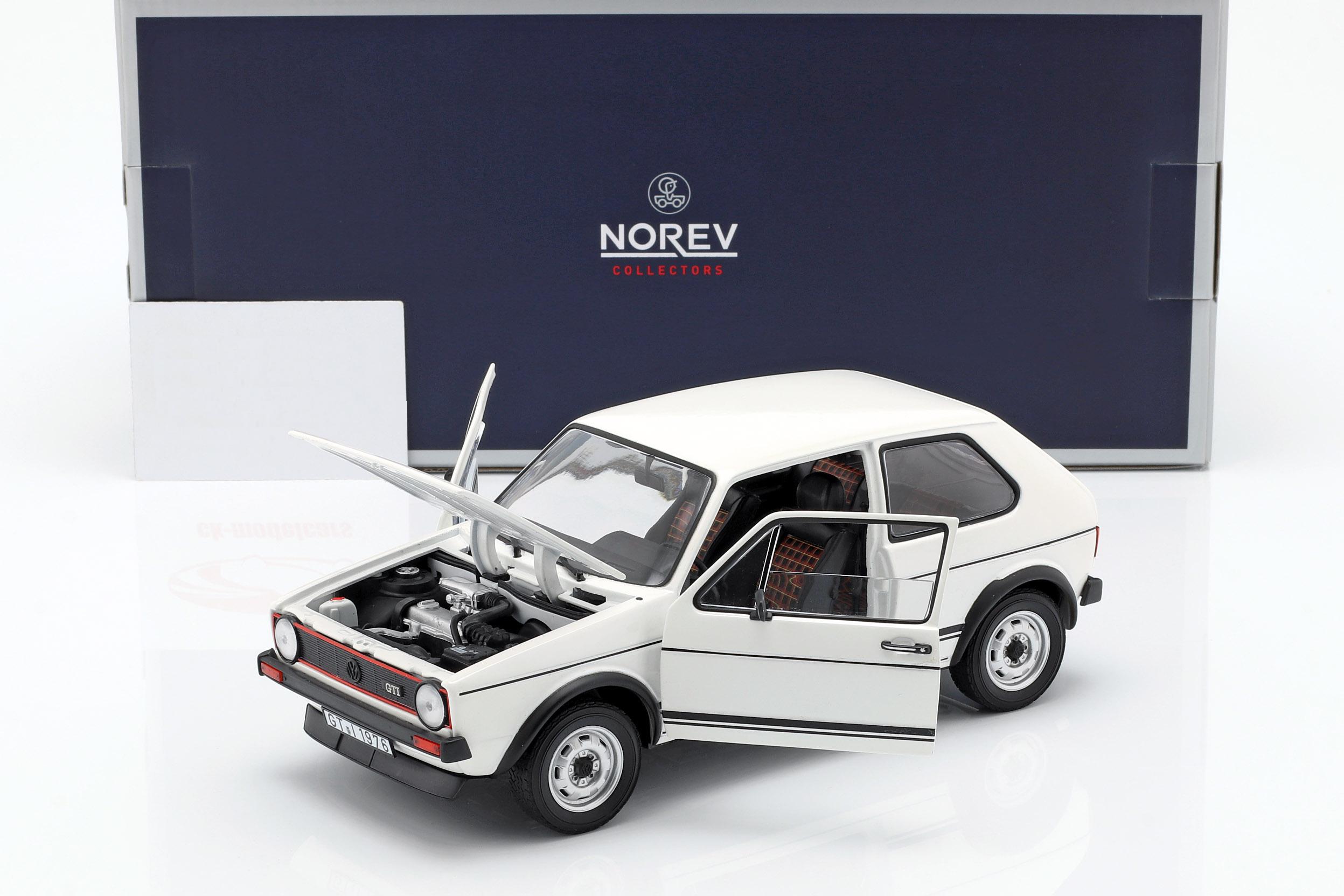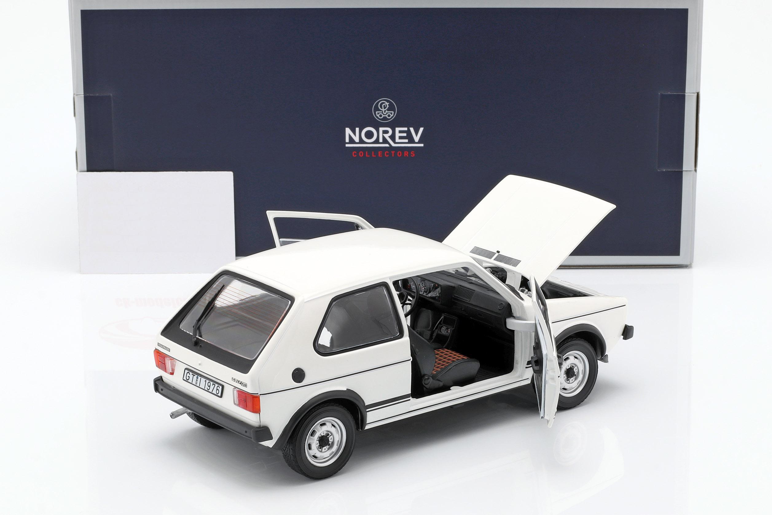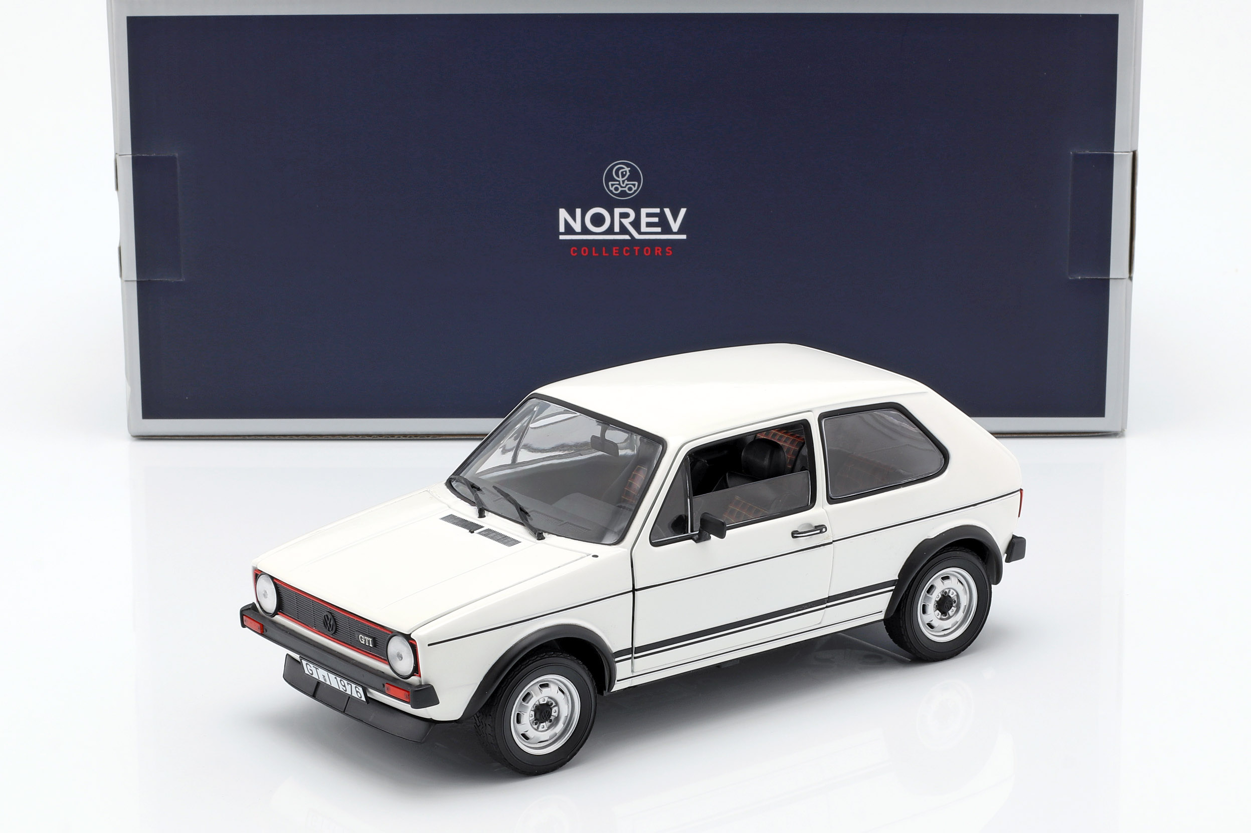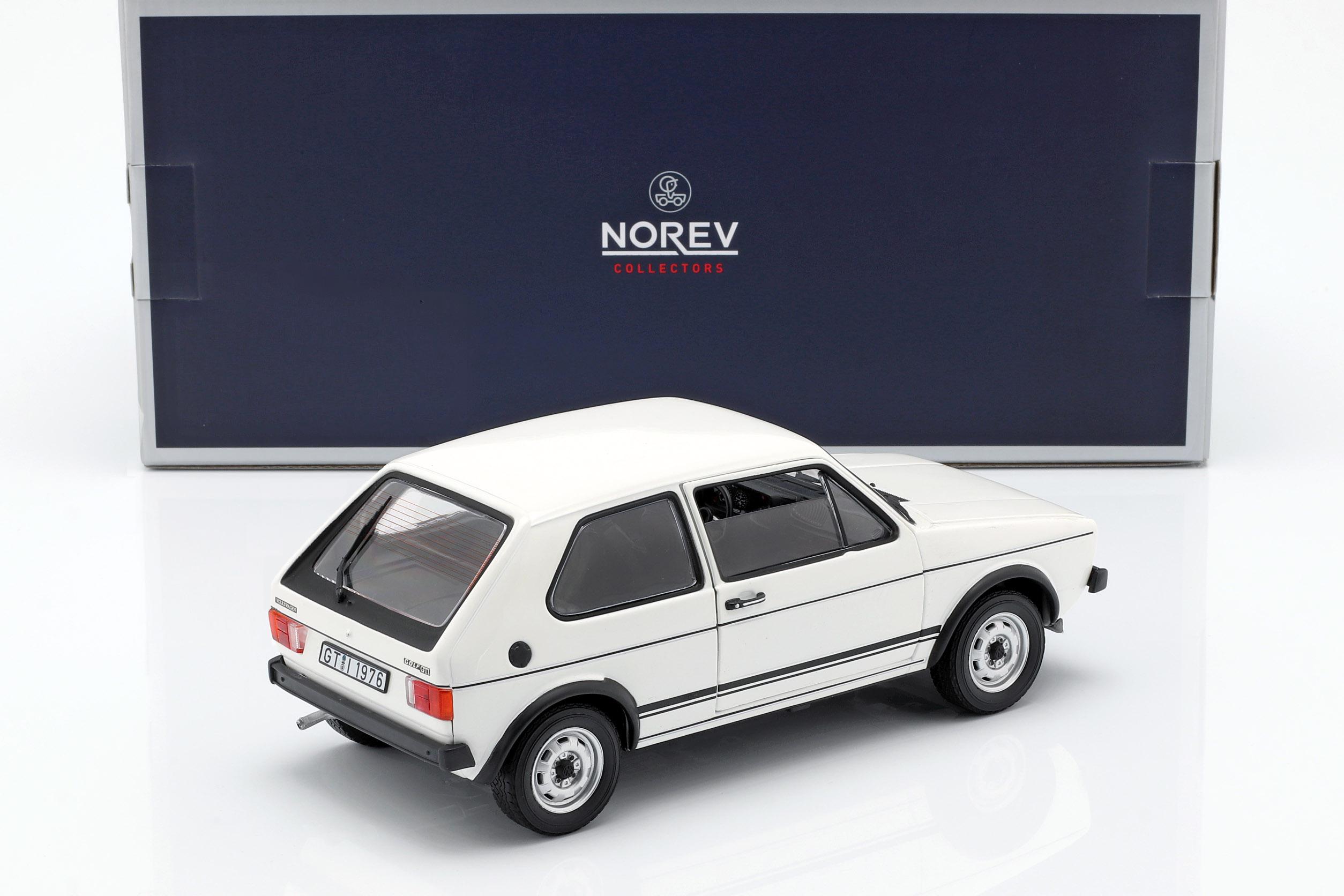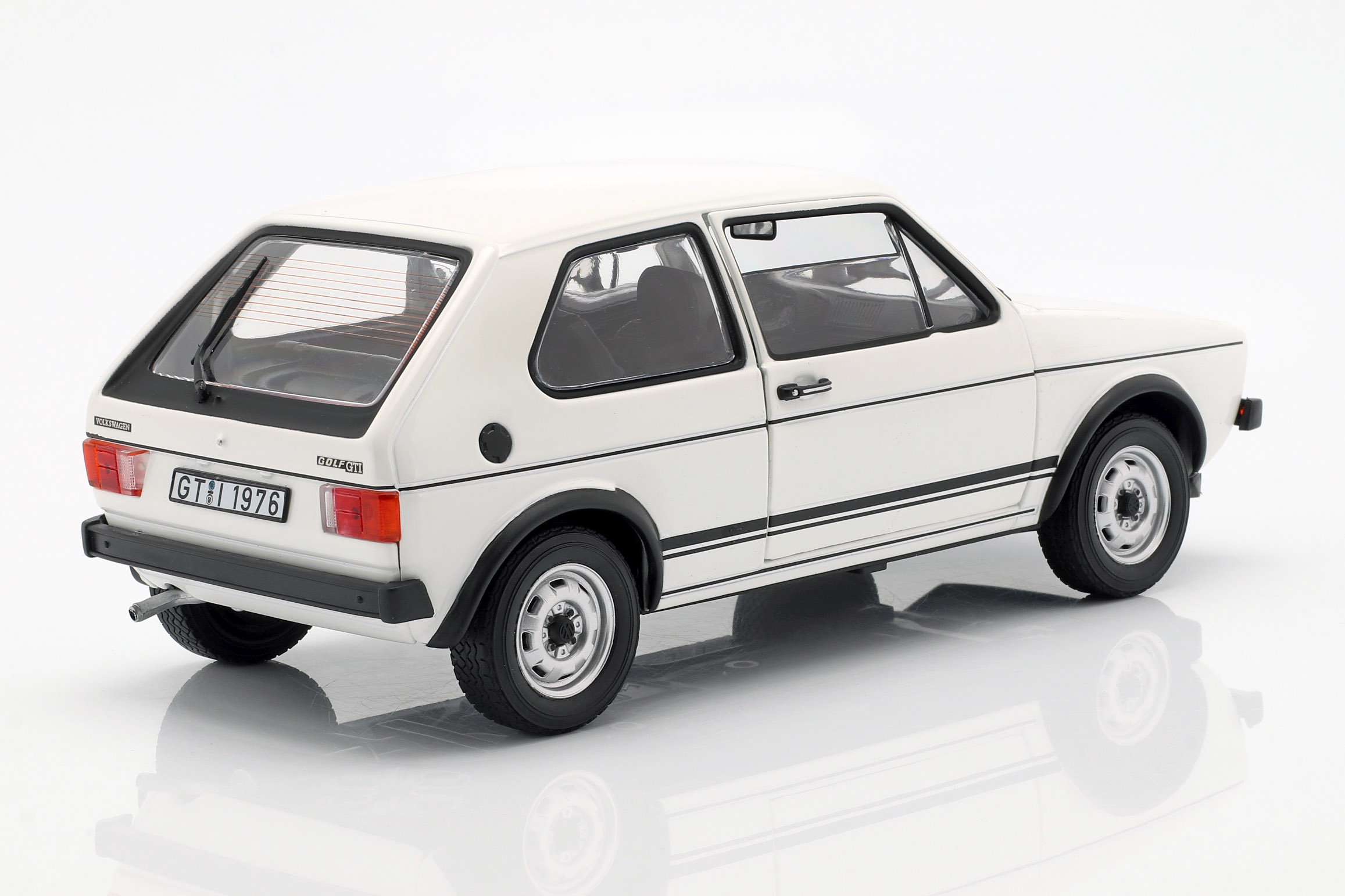 Kolekcjonerski model metalowy z elementami plastikowymi samochodu VOLKSWAGEN GOLF MkI GTI z roku 1976 w kolorze Alpine White.