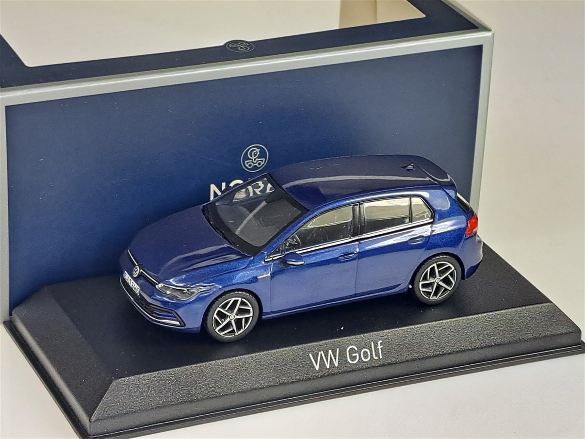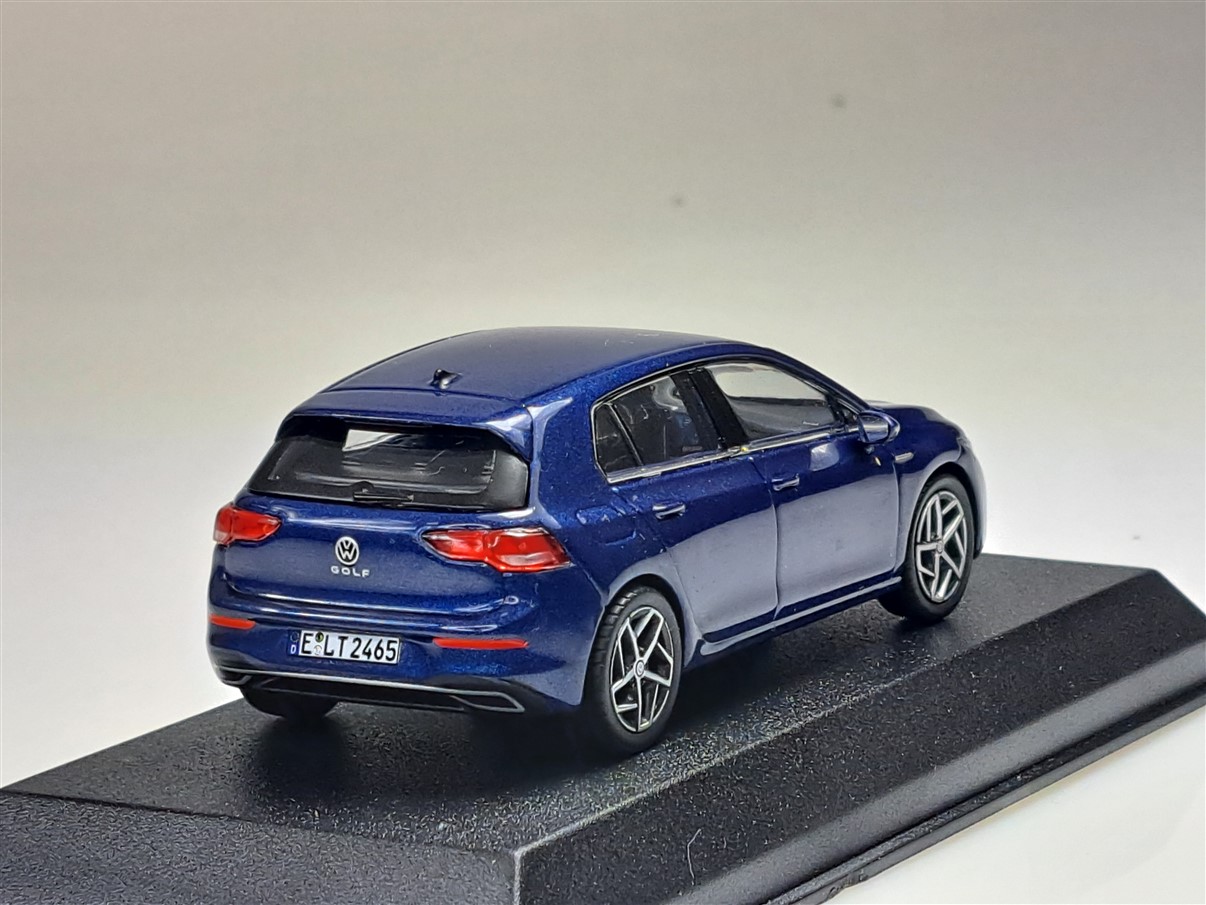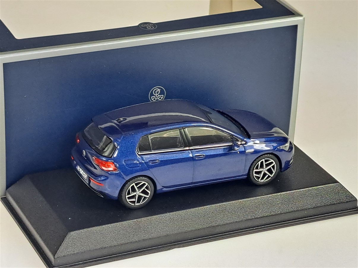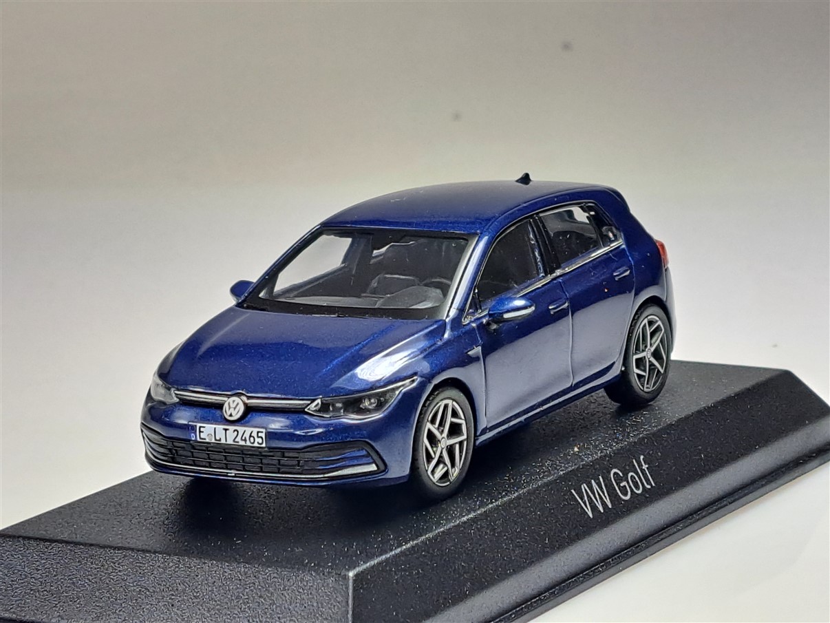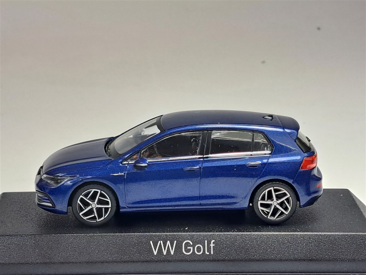 Kolekcjonerski model metalowy z elementami plastikowymi samochodu VOLKSWAGEN GOLF VIII z roku 2020 w kolorze Niebieski metallic.