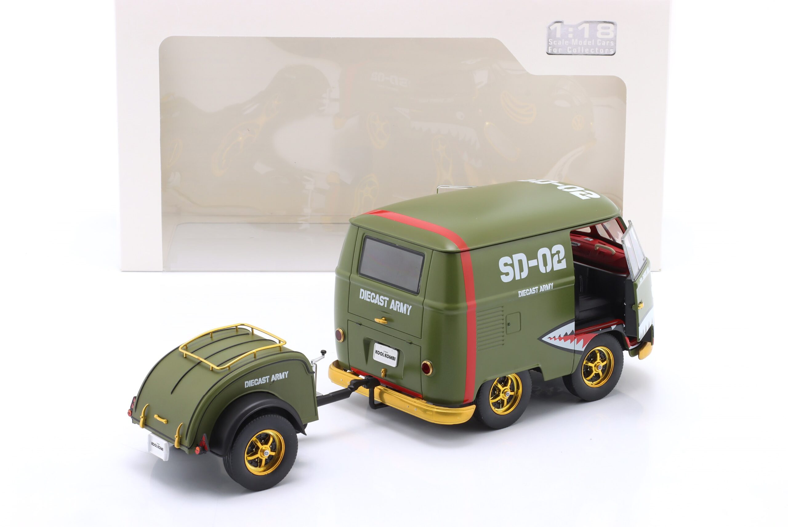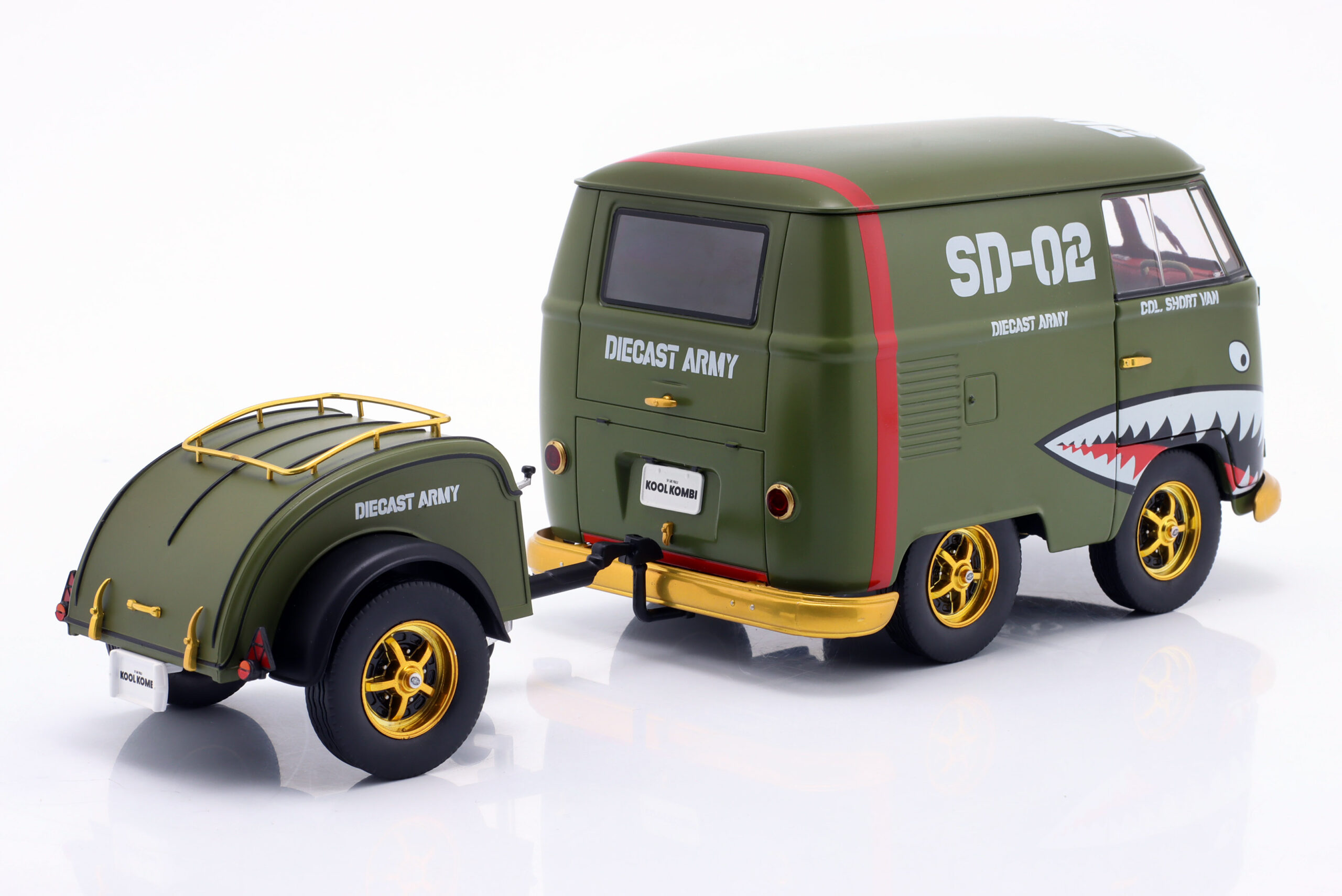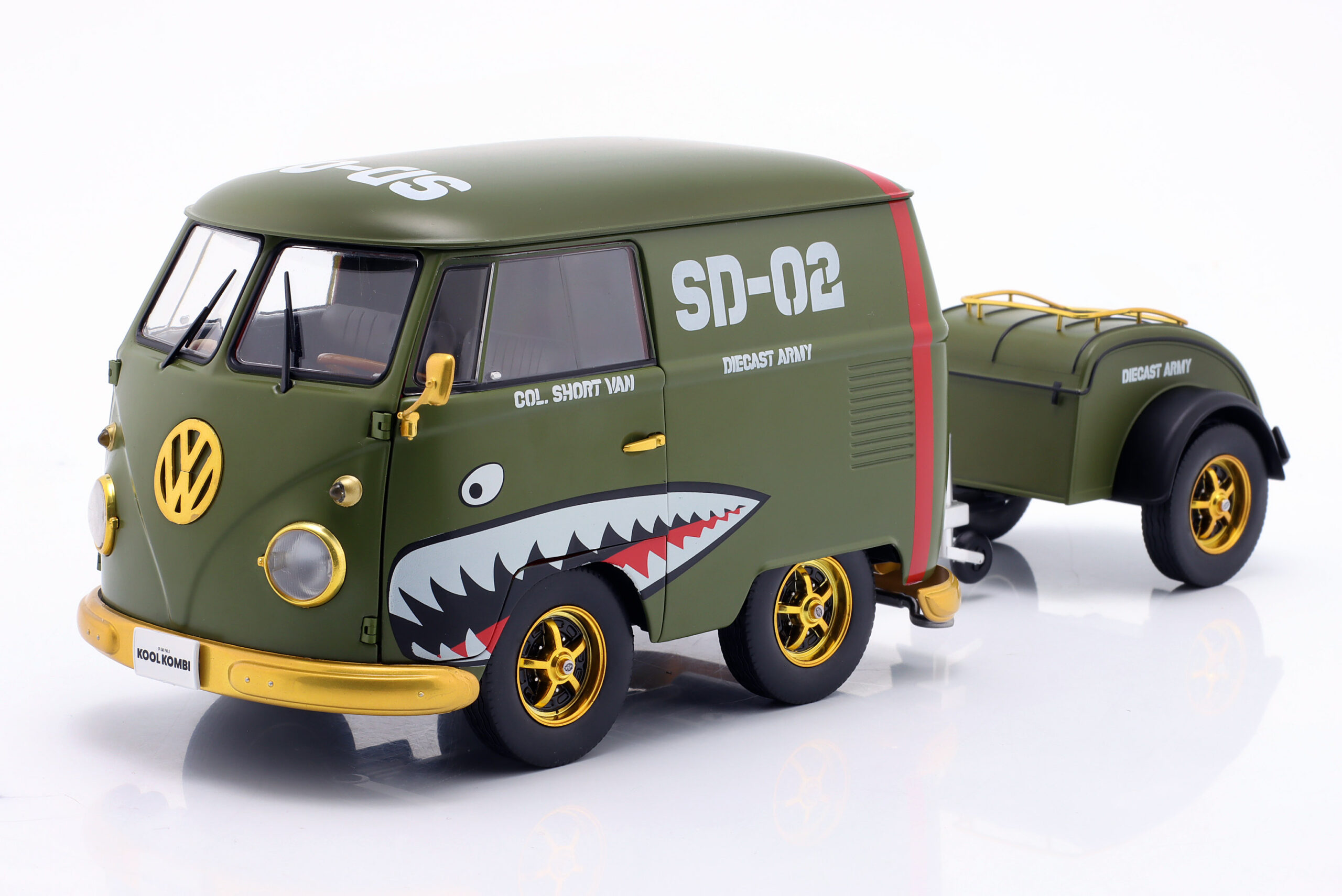 Kolekcjonerski model metalowy z elementami plastikowymi samochodu VOLKSWAGEN Kool Kombi Army Fighter roku 2023 w kolorze Oliwkowo zielonym.