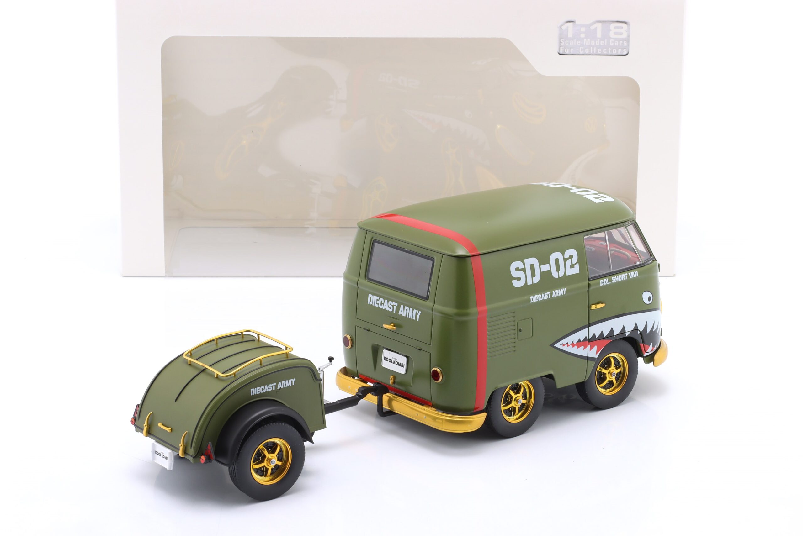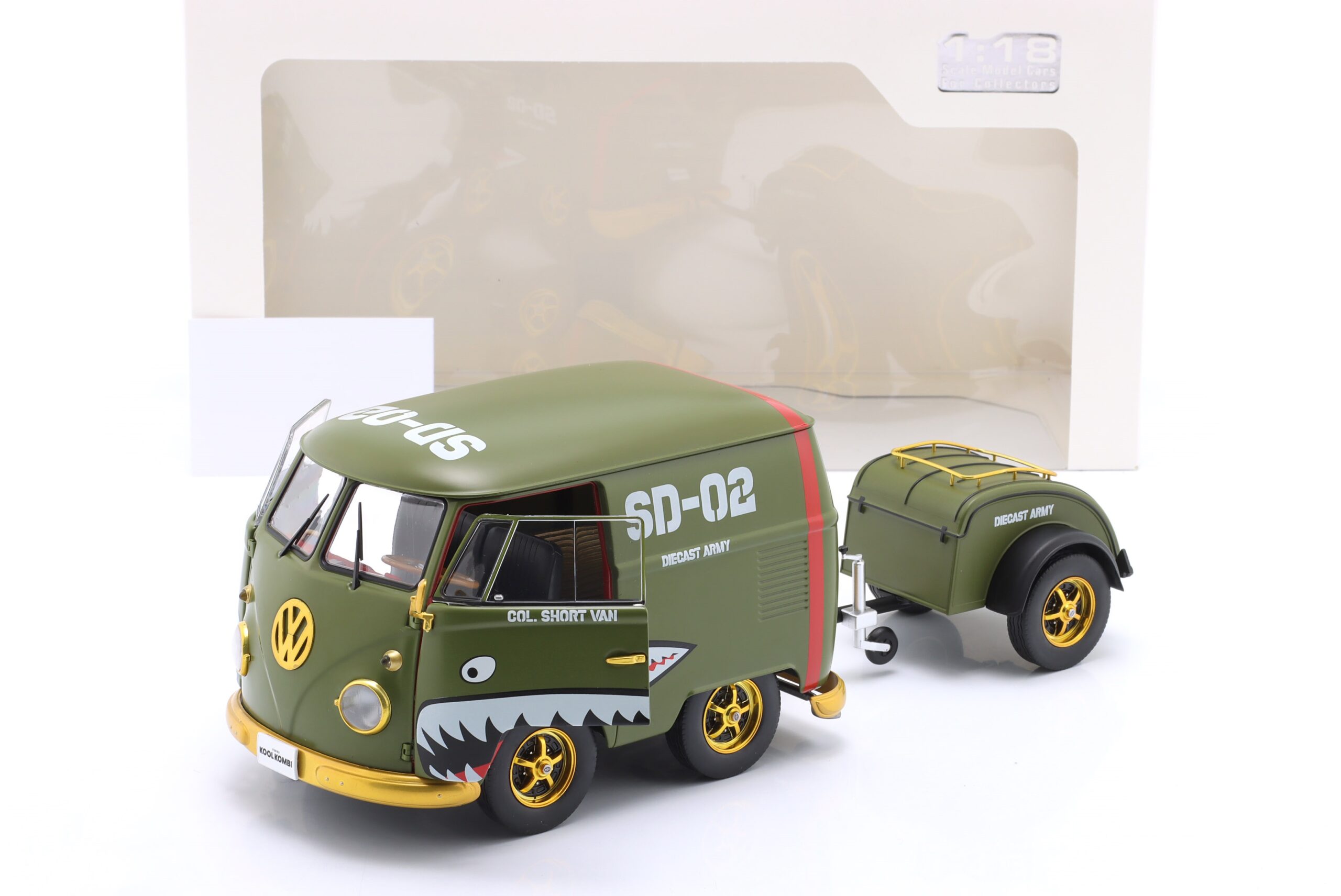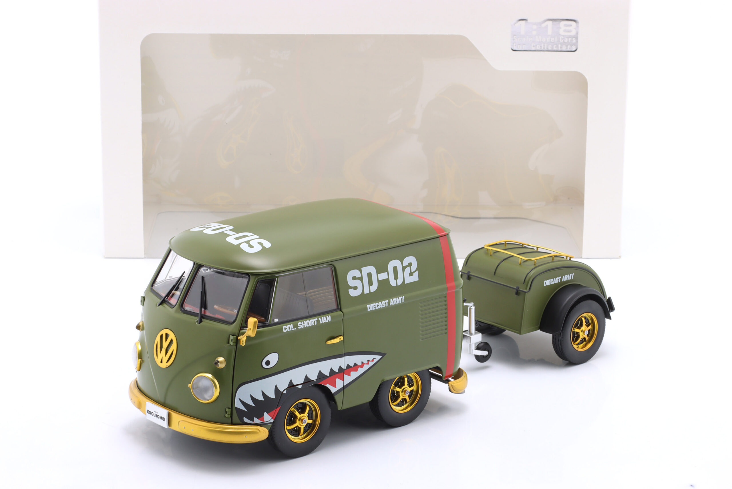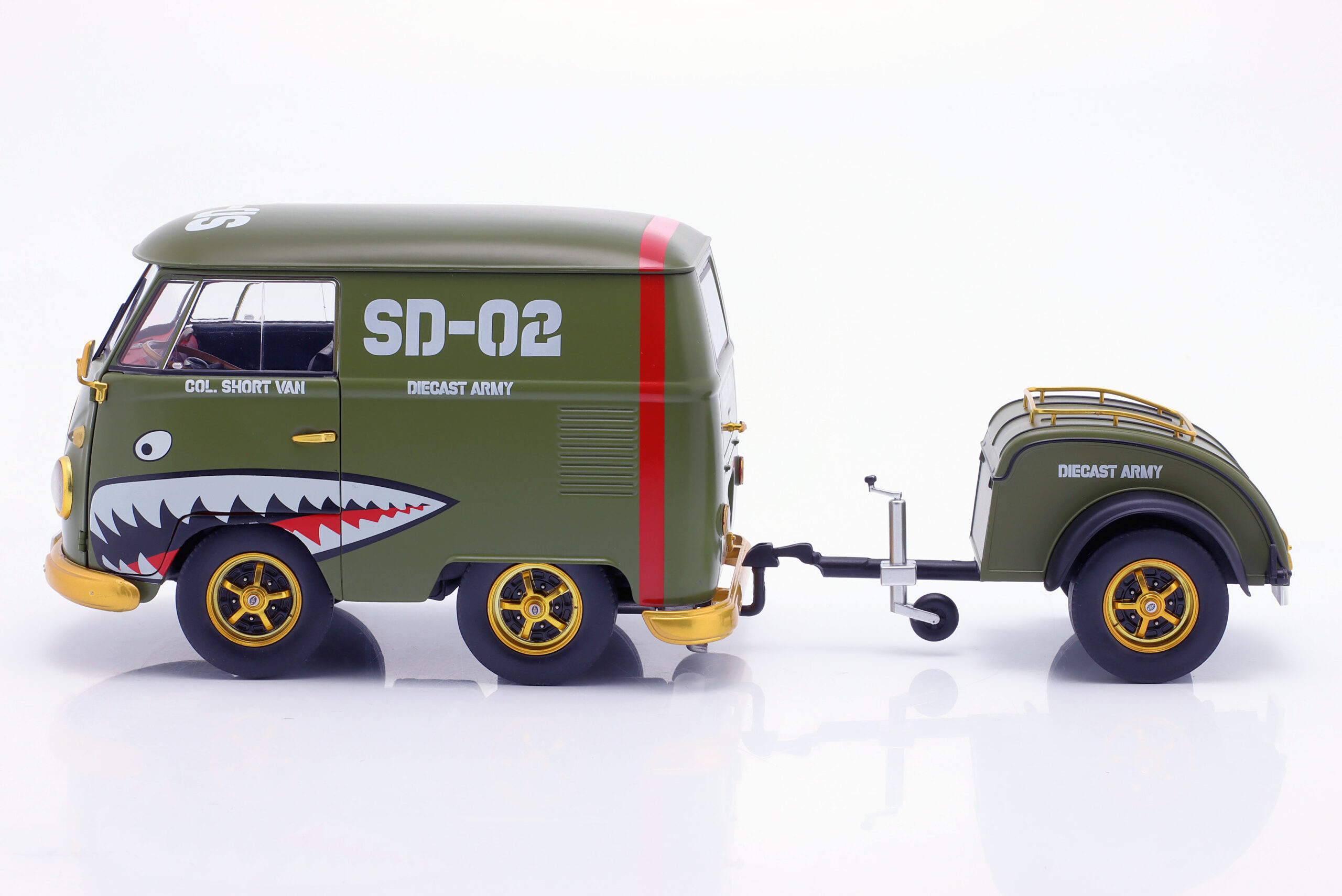 Kolekcjonerski model metalowy z elementami plastikowymi samochodu VOLKSWAGEN Kool Kombi Army Fighter roku 2023 w kolorze Oliwkowo zielonym.
