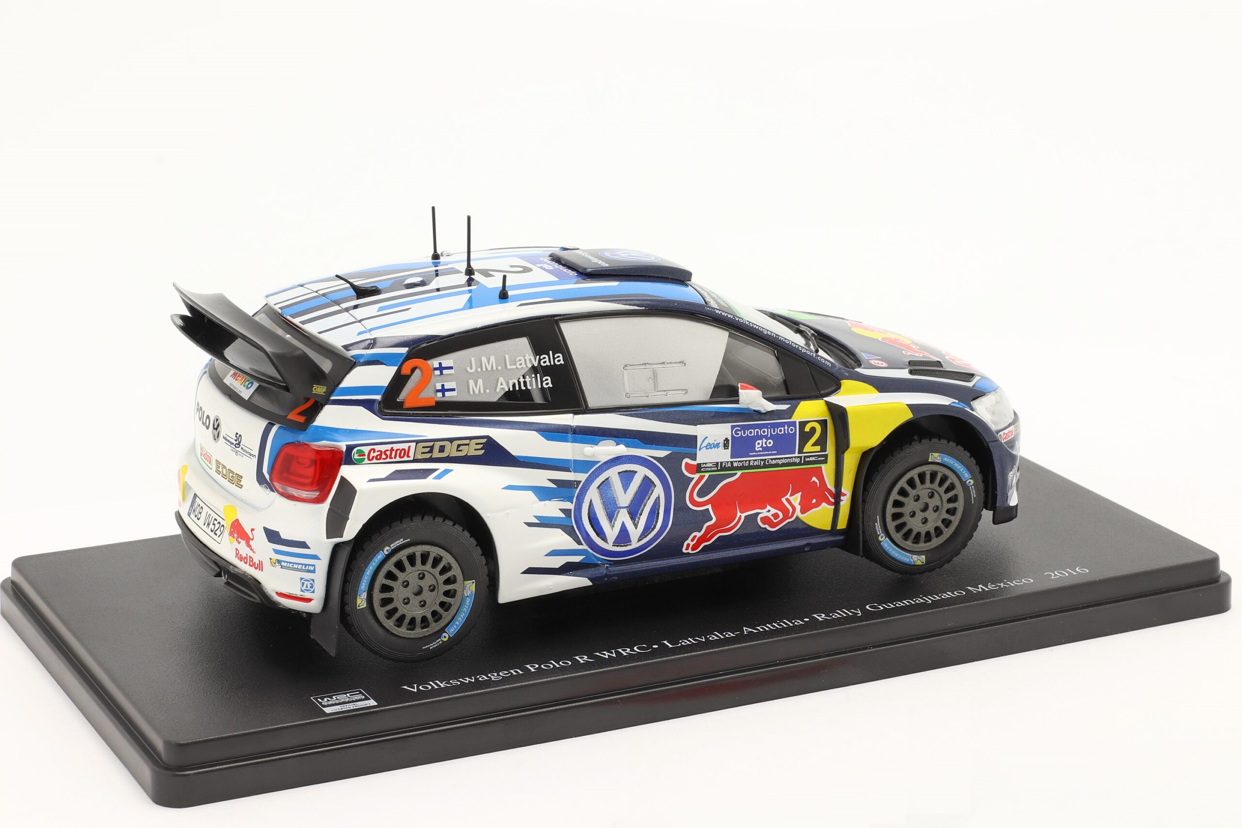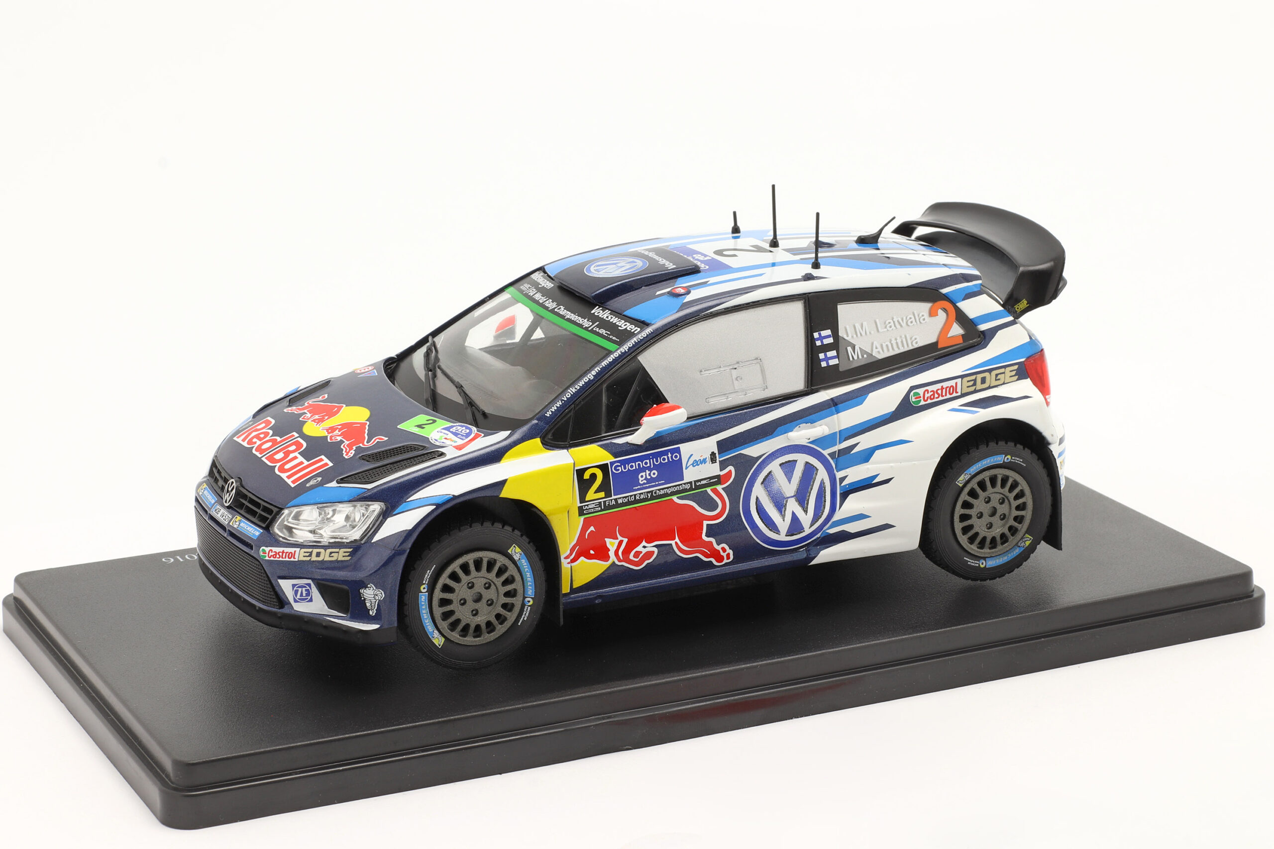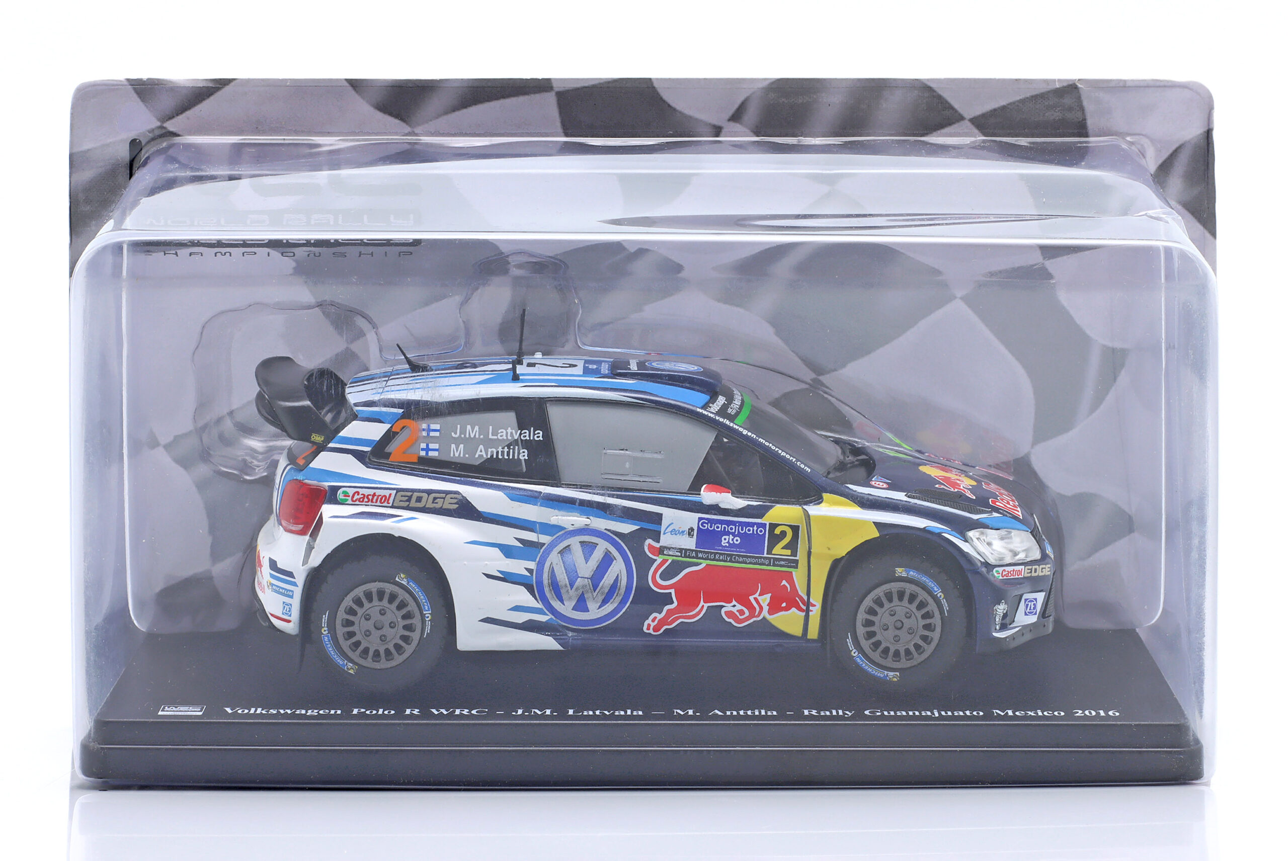 Kolekcjonerski model metalowy z elementami plastikowymi samochodu rajdowego VOLKSWAGEN POLO R WRC #2 zwycięskiej załogi J-M.Latvala/M.Anttila z Rajdu Meksyku z roku 2016.Model firmy ALTAYA.Model na podstawce,zapakowany w blister.
