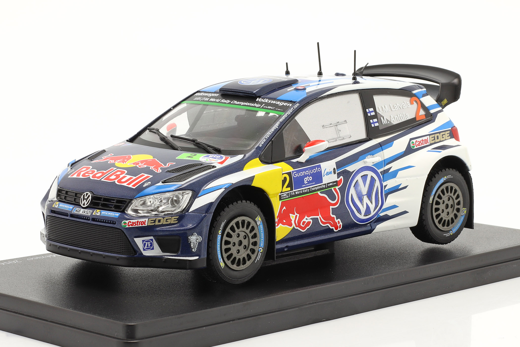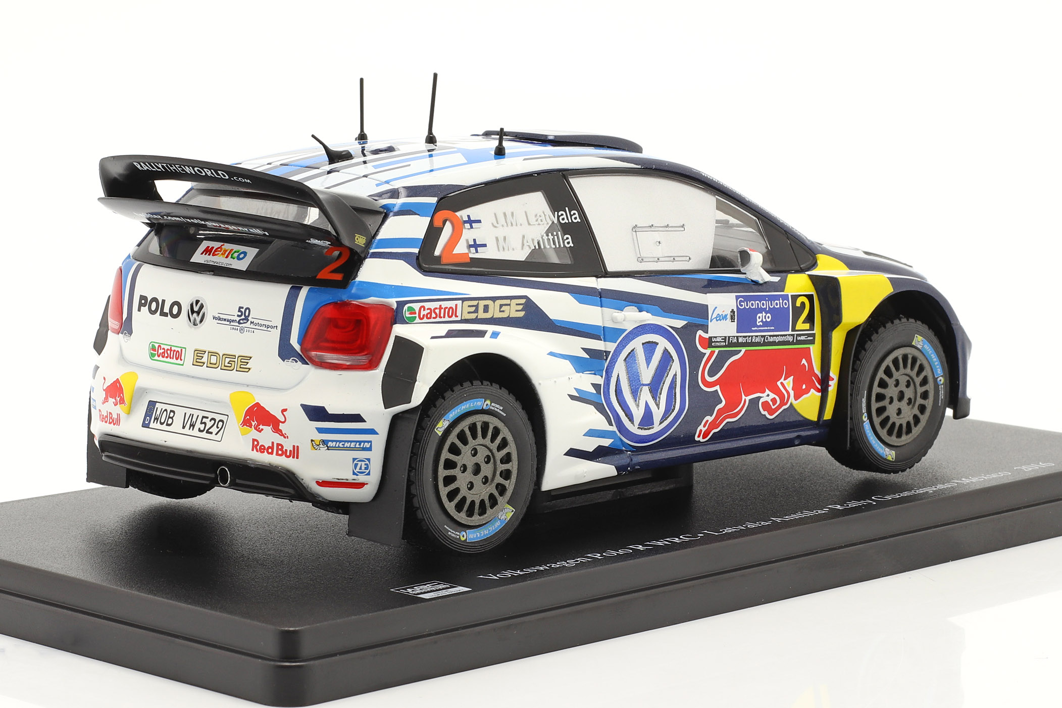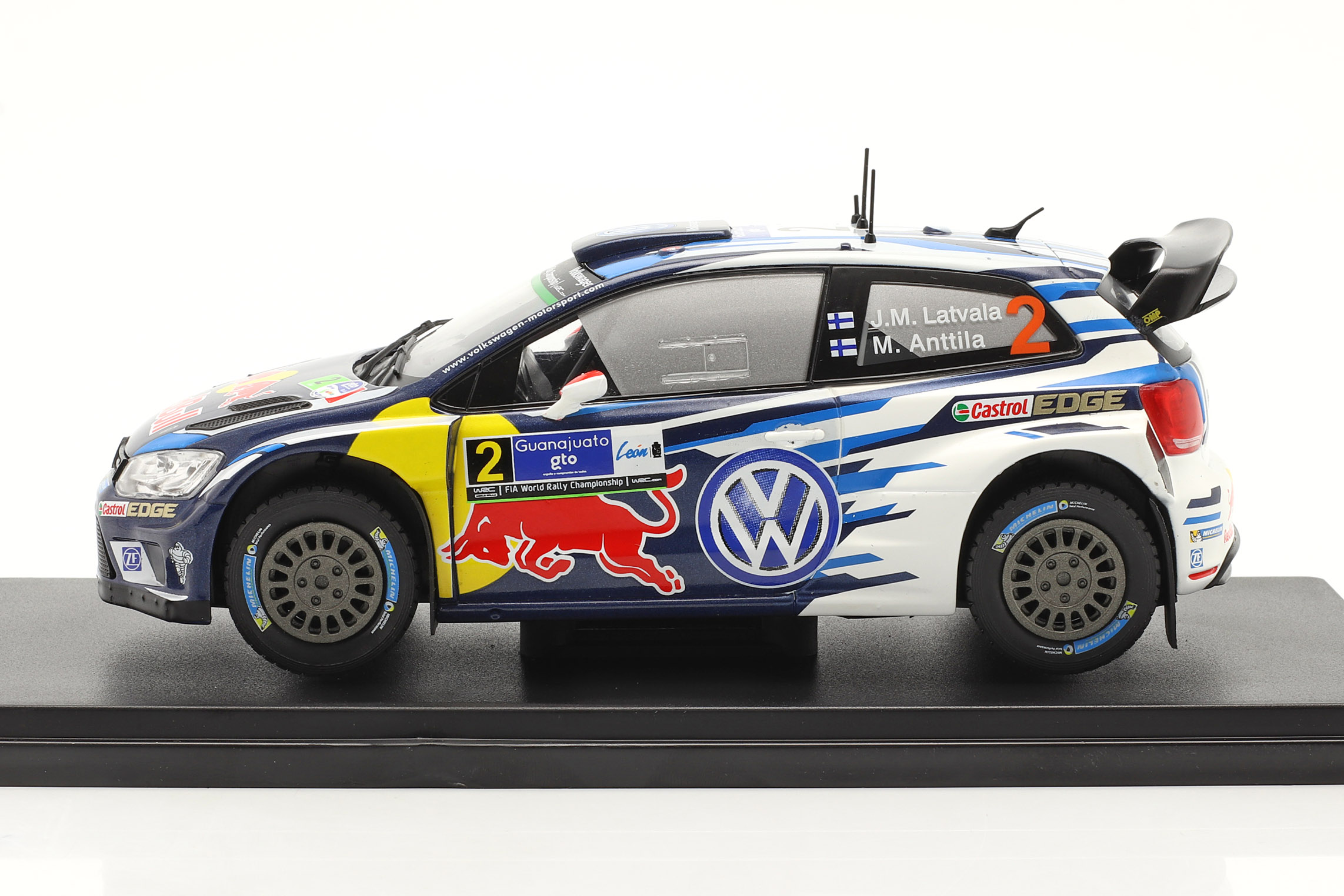 Kolekcjonerski model metalowy z elementami plastikowymi samochodu rajdowego VOLKSWAGEN POLO R WRC #2 zwycięskiej załogi J-M.Latvala/M.Anttila z Rajdu Meksyku z roku 2016.Model firmy ALTAYA.Model na podstawce,zapakowany w blister.