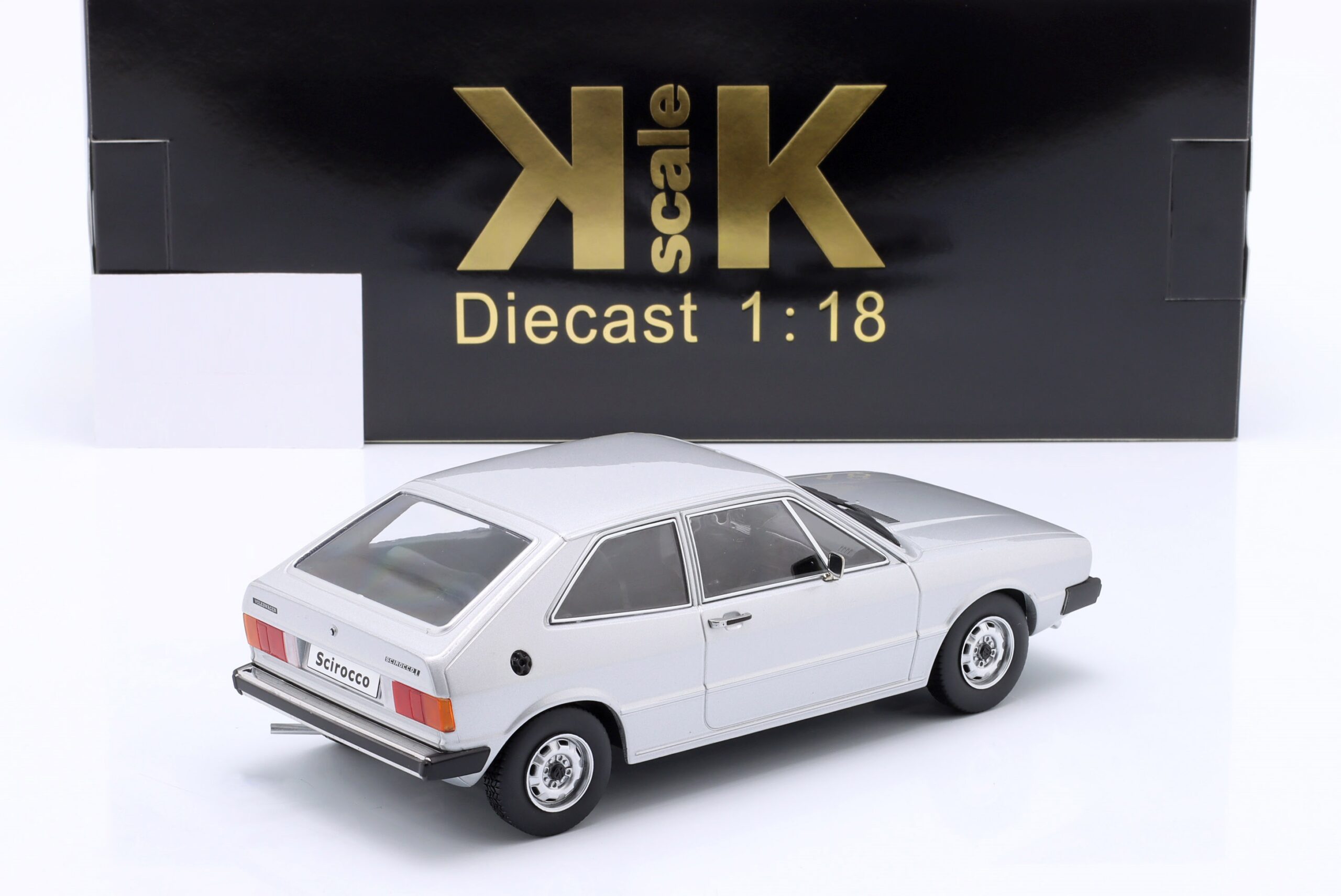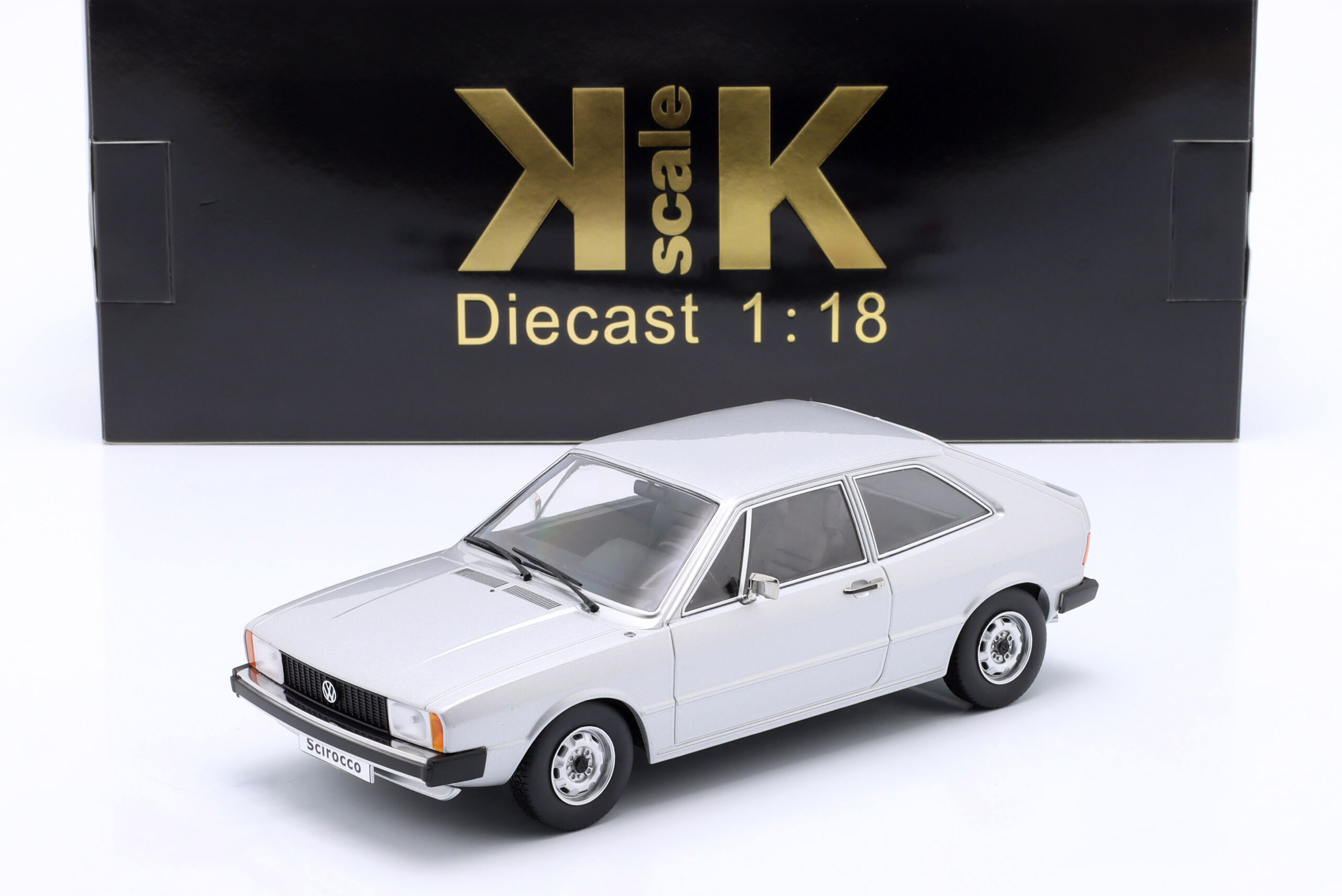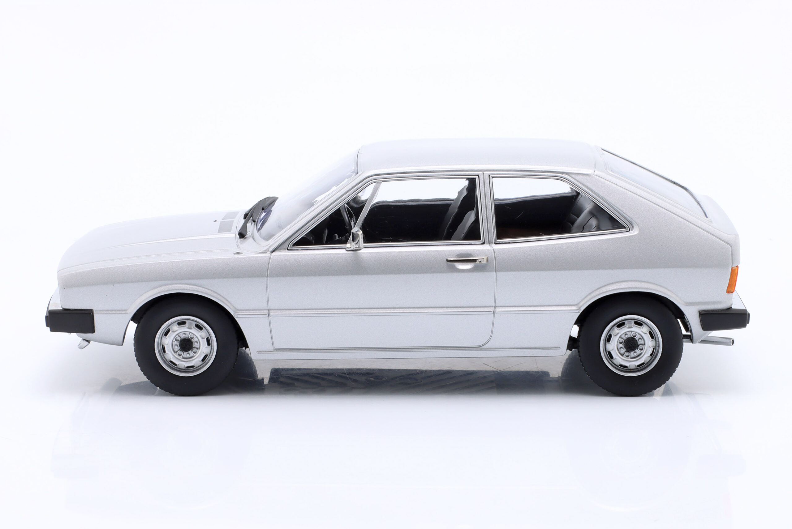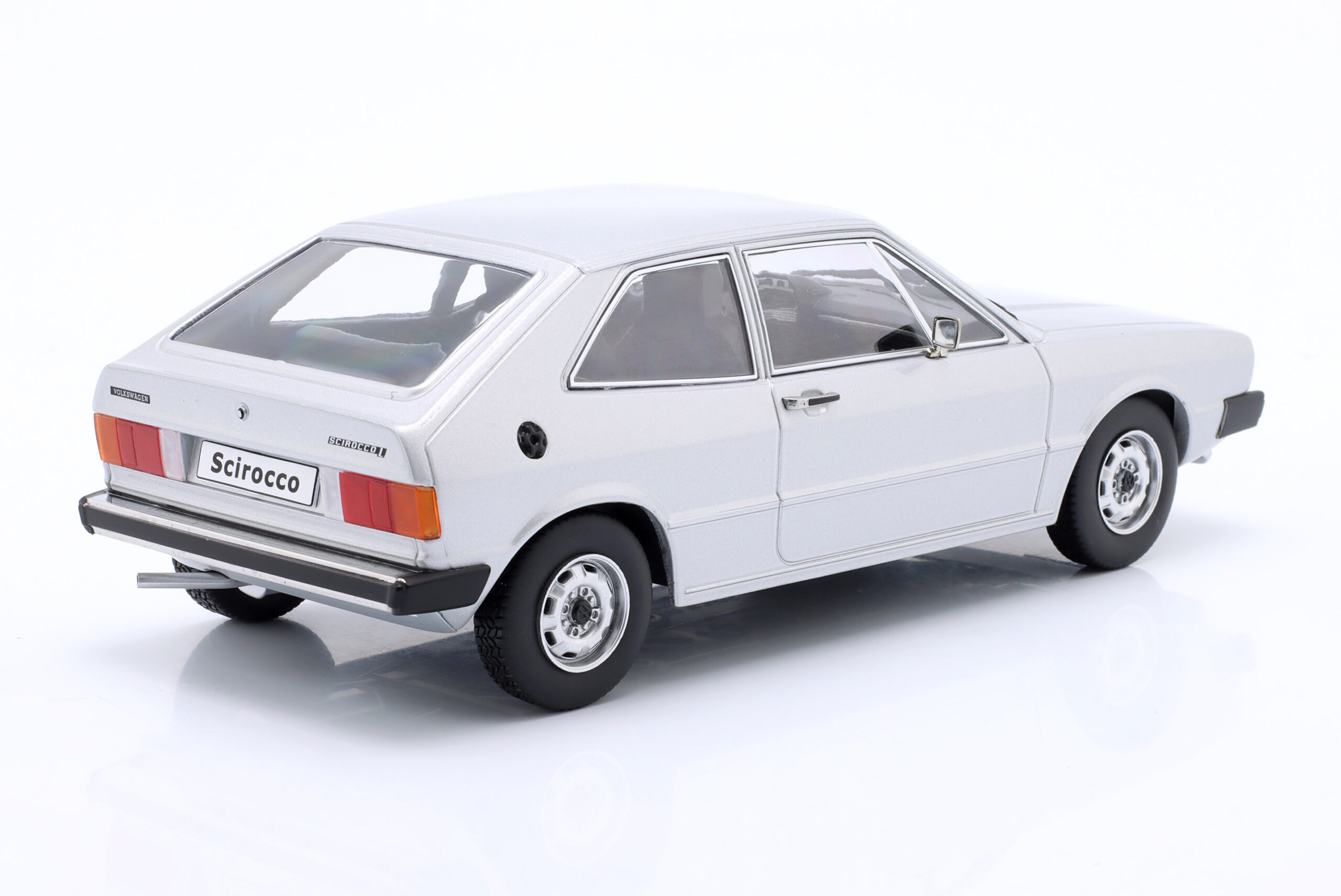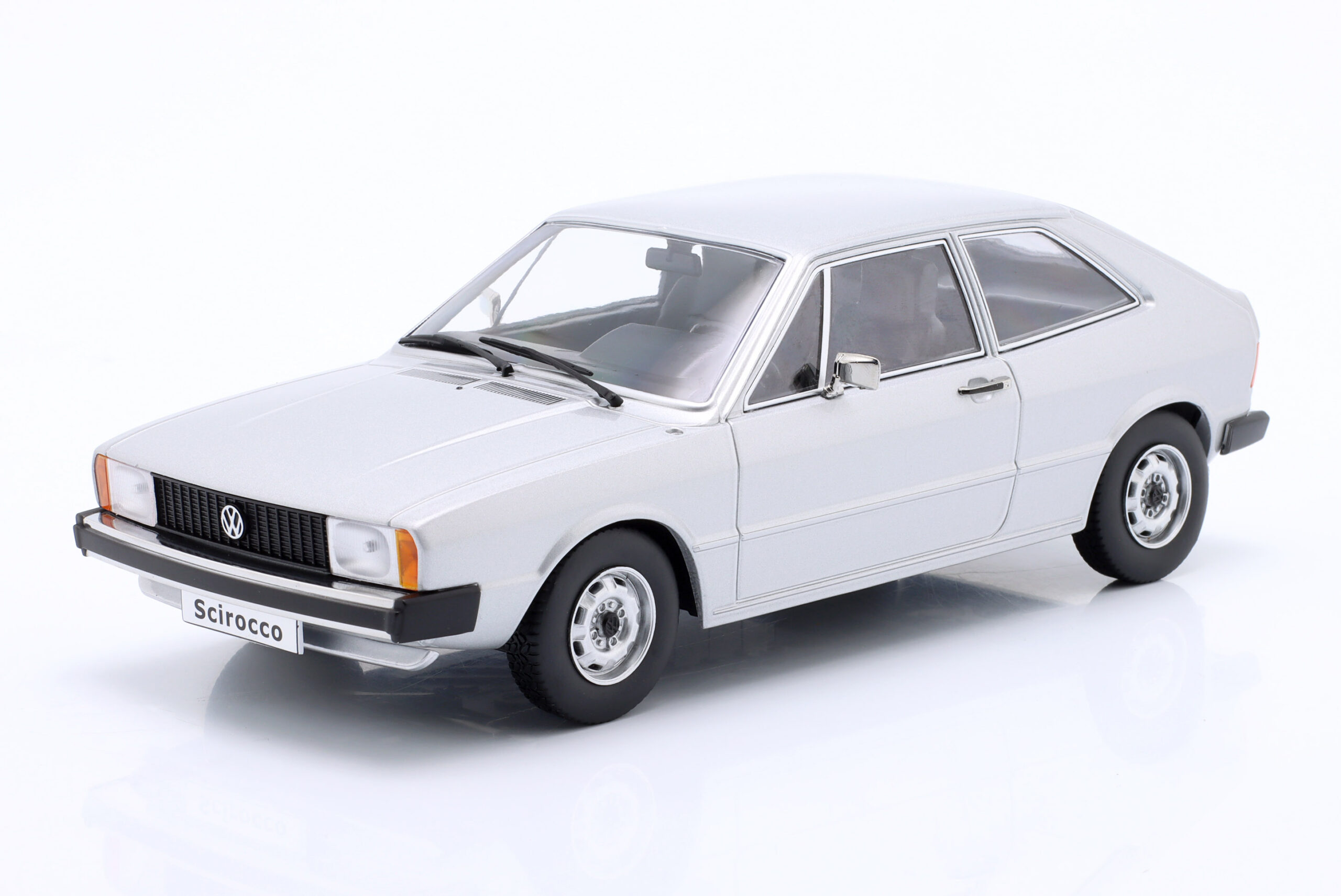 Kolekcjonerski model metalowy z elementami plastikowymi samochodu VOLKSWAGEN SCIROCCO L MkI z roku 1975 w kolorze Srebrnym. Model nie posiada otwieranych elementów.