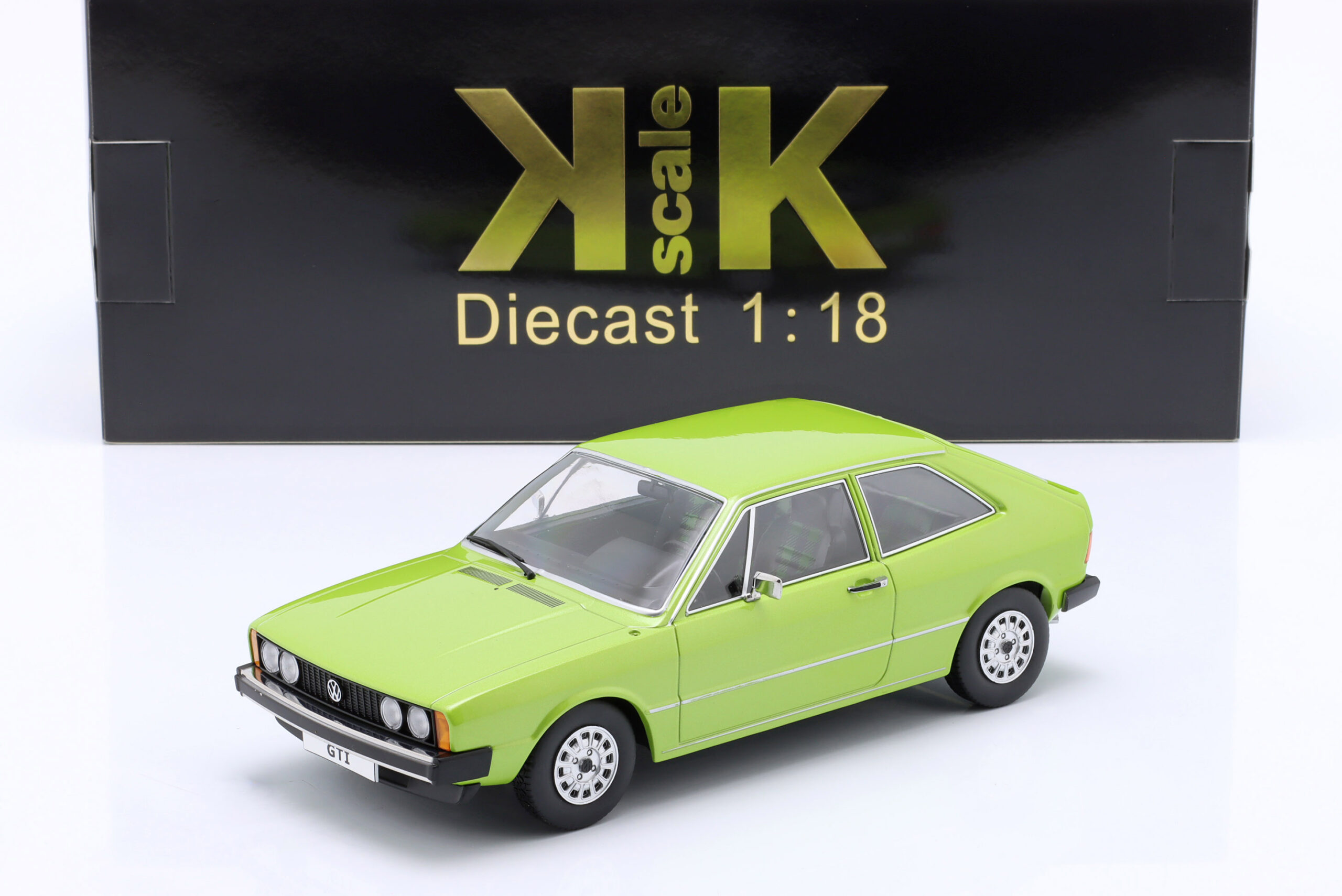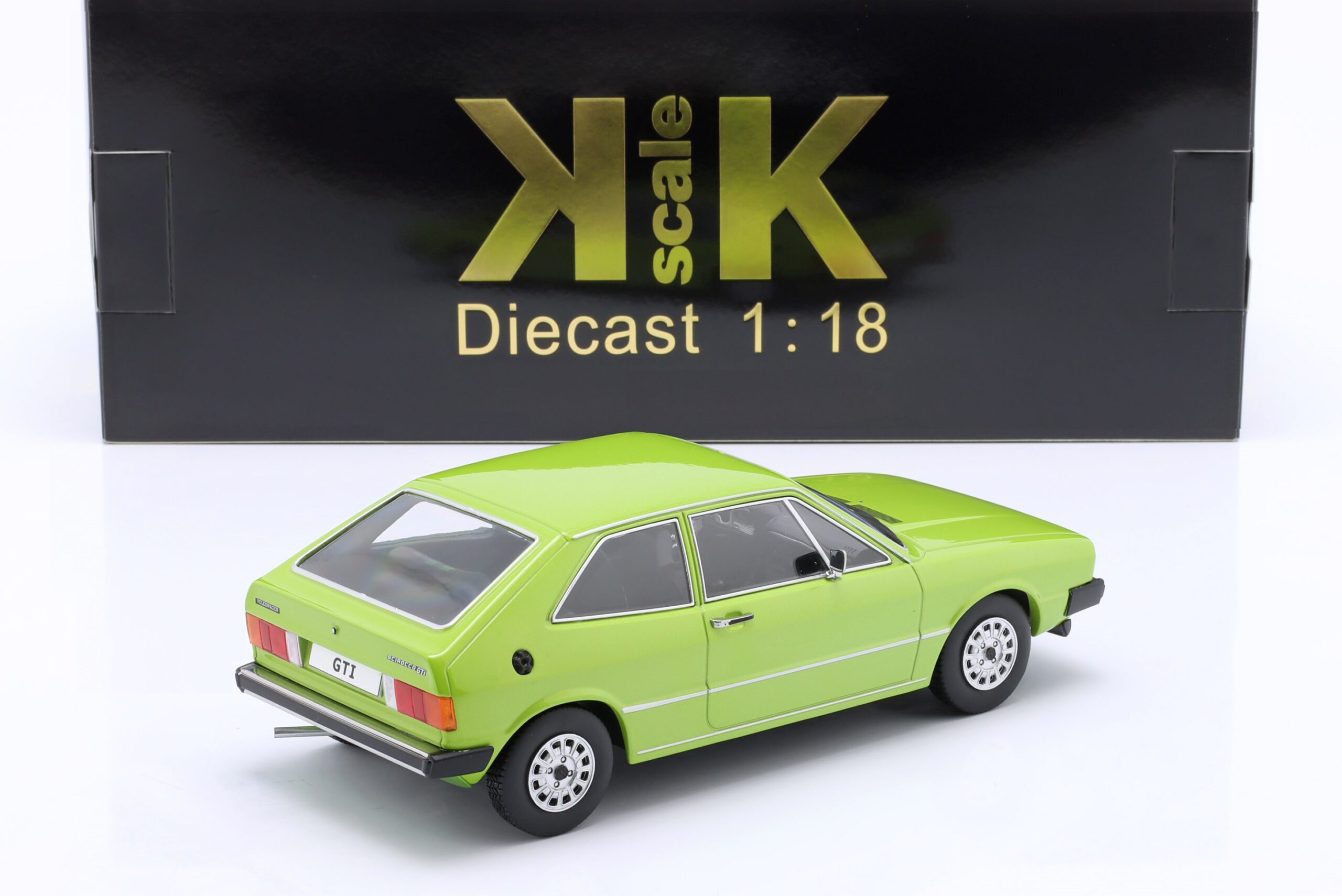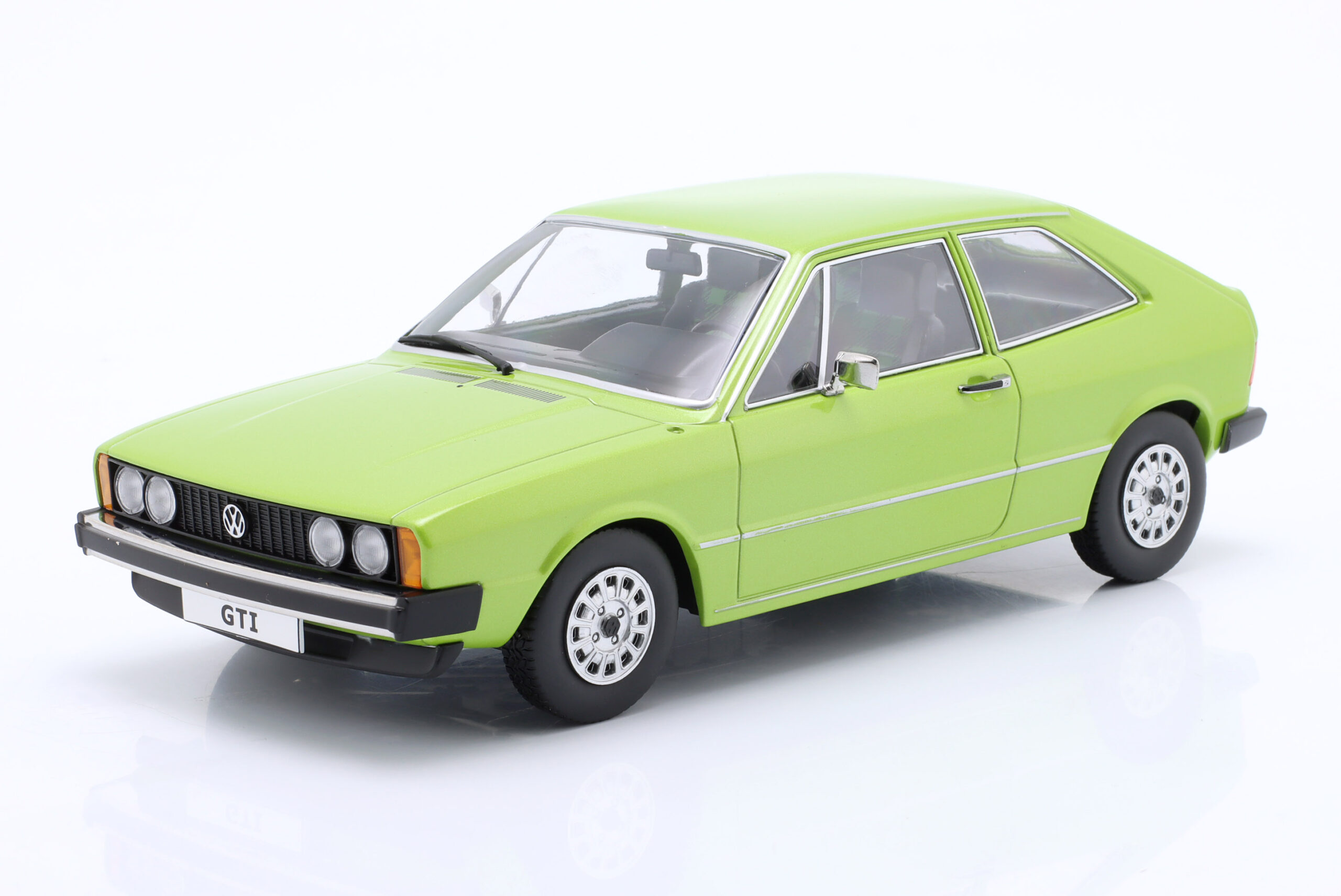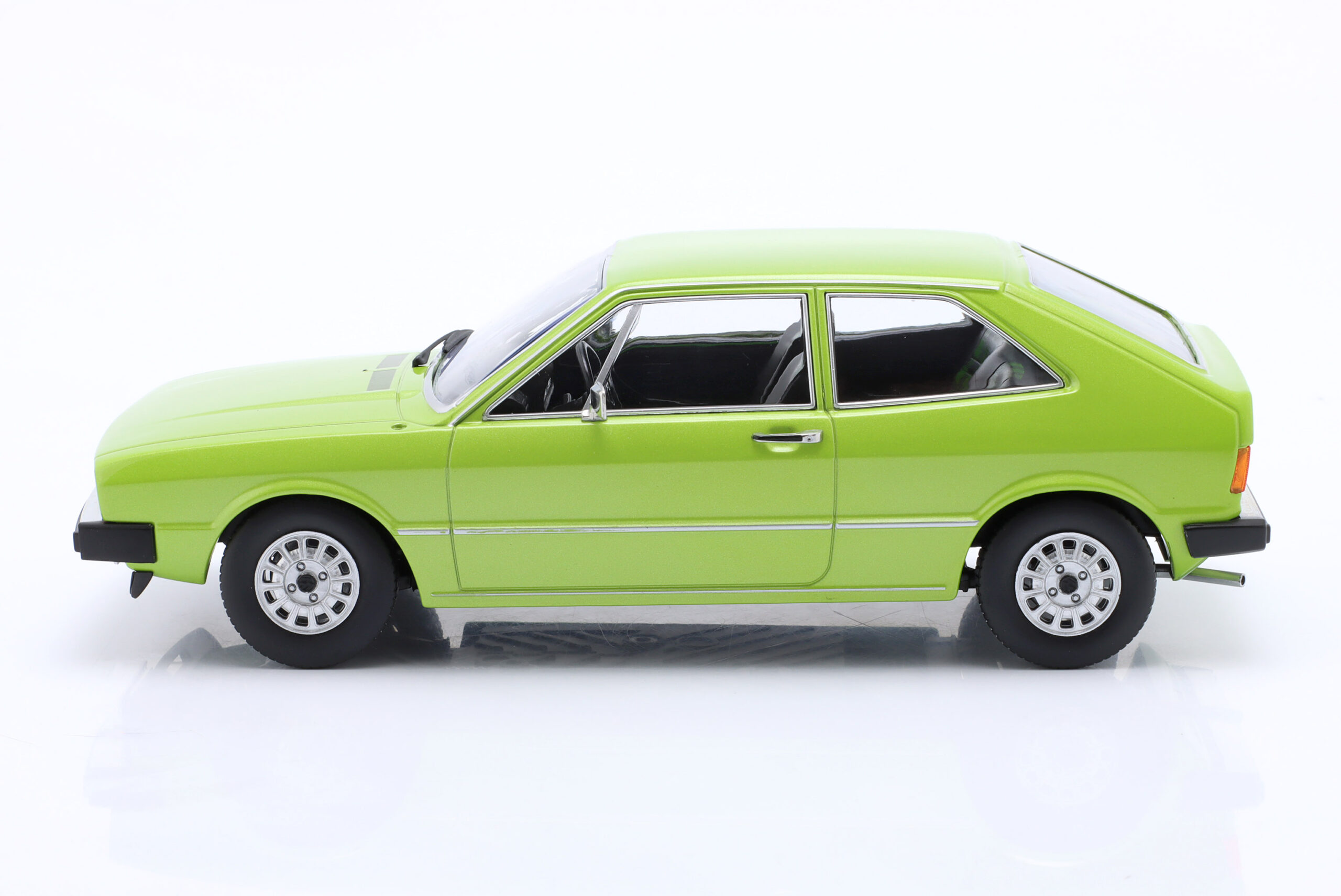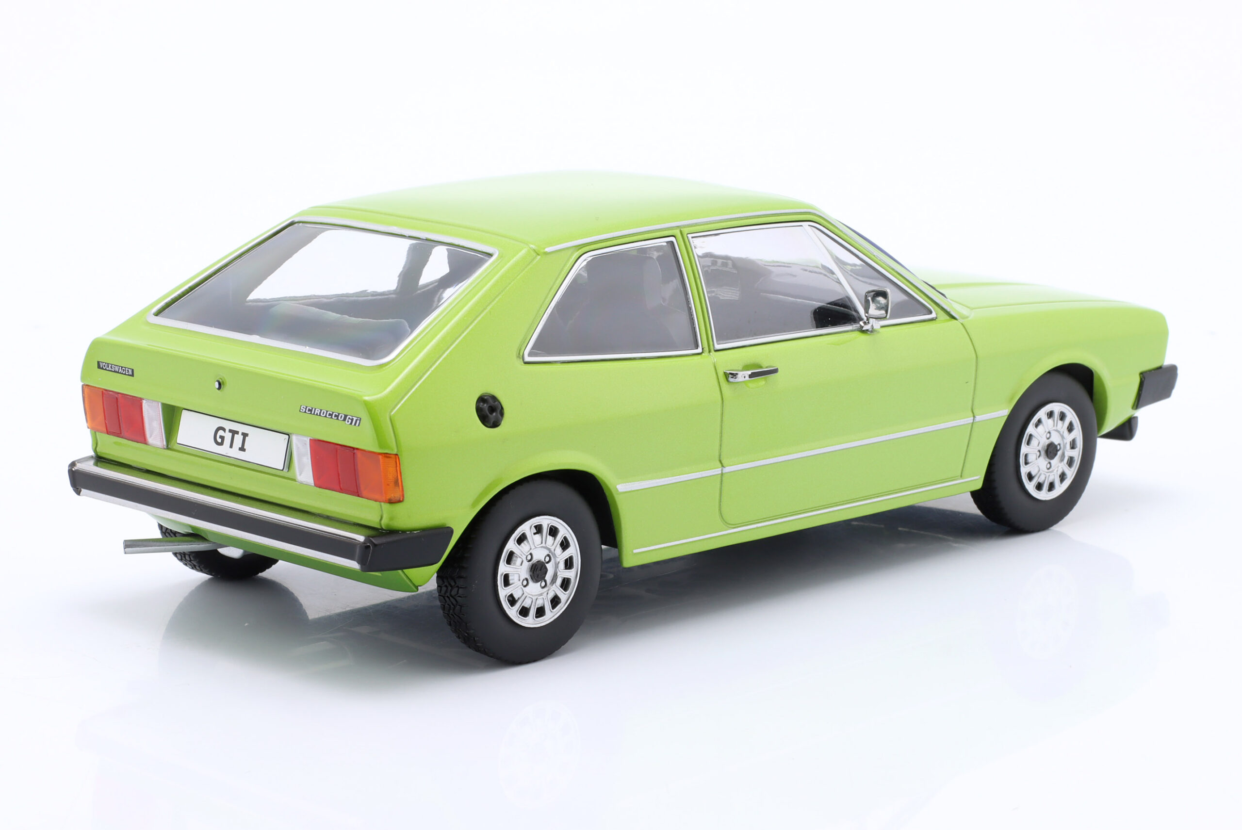 Kolekcjonerski model metalowy z elementami plastikowymi samochodu VOLKSWAGEN SCIROCCO L MkI z roku 1976 w kolorze Jasnozielony metallic. Model nie posiada otwieranych elementów.