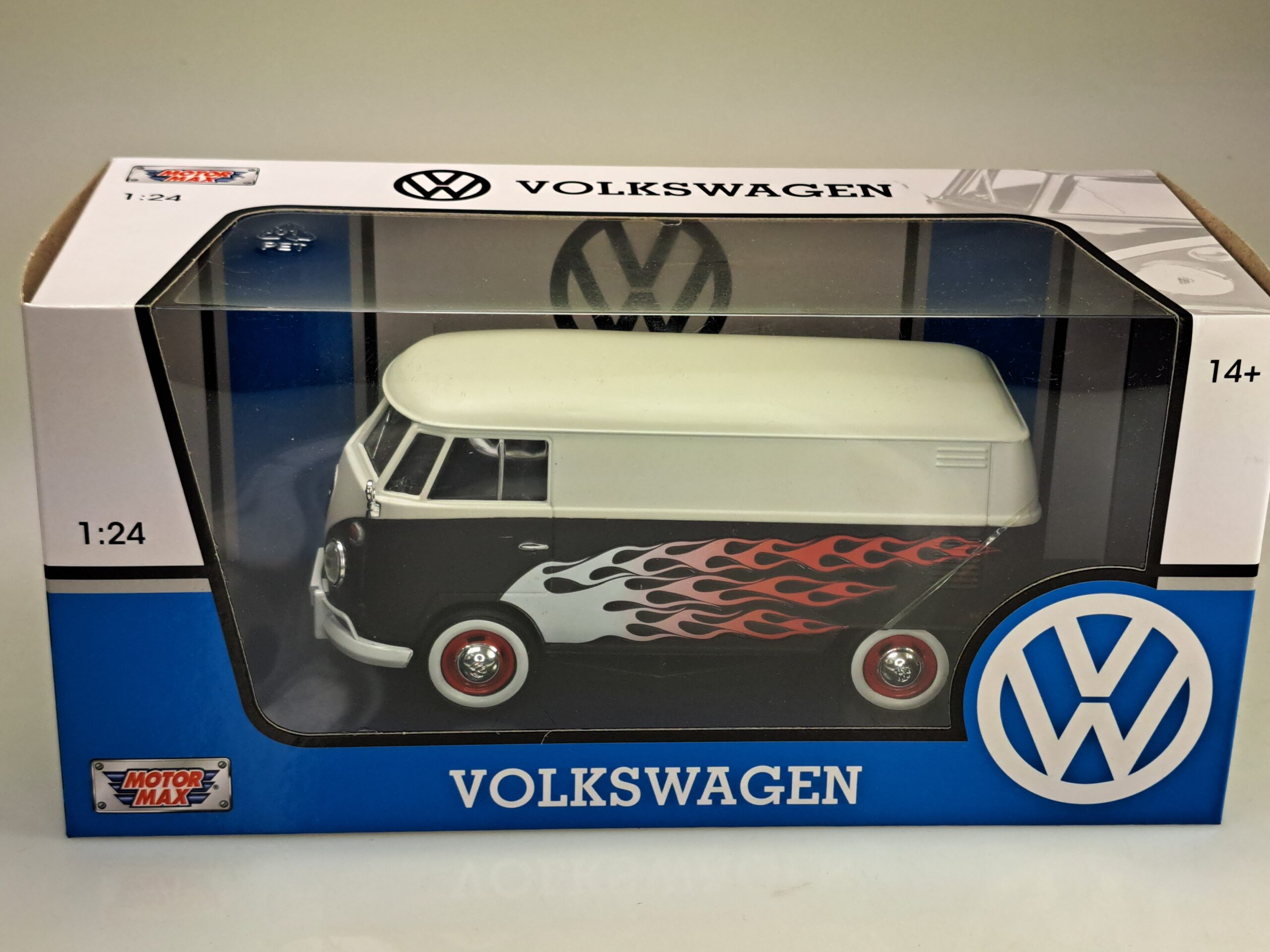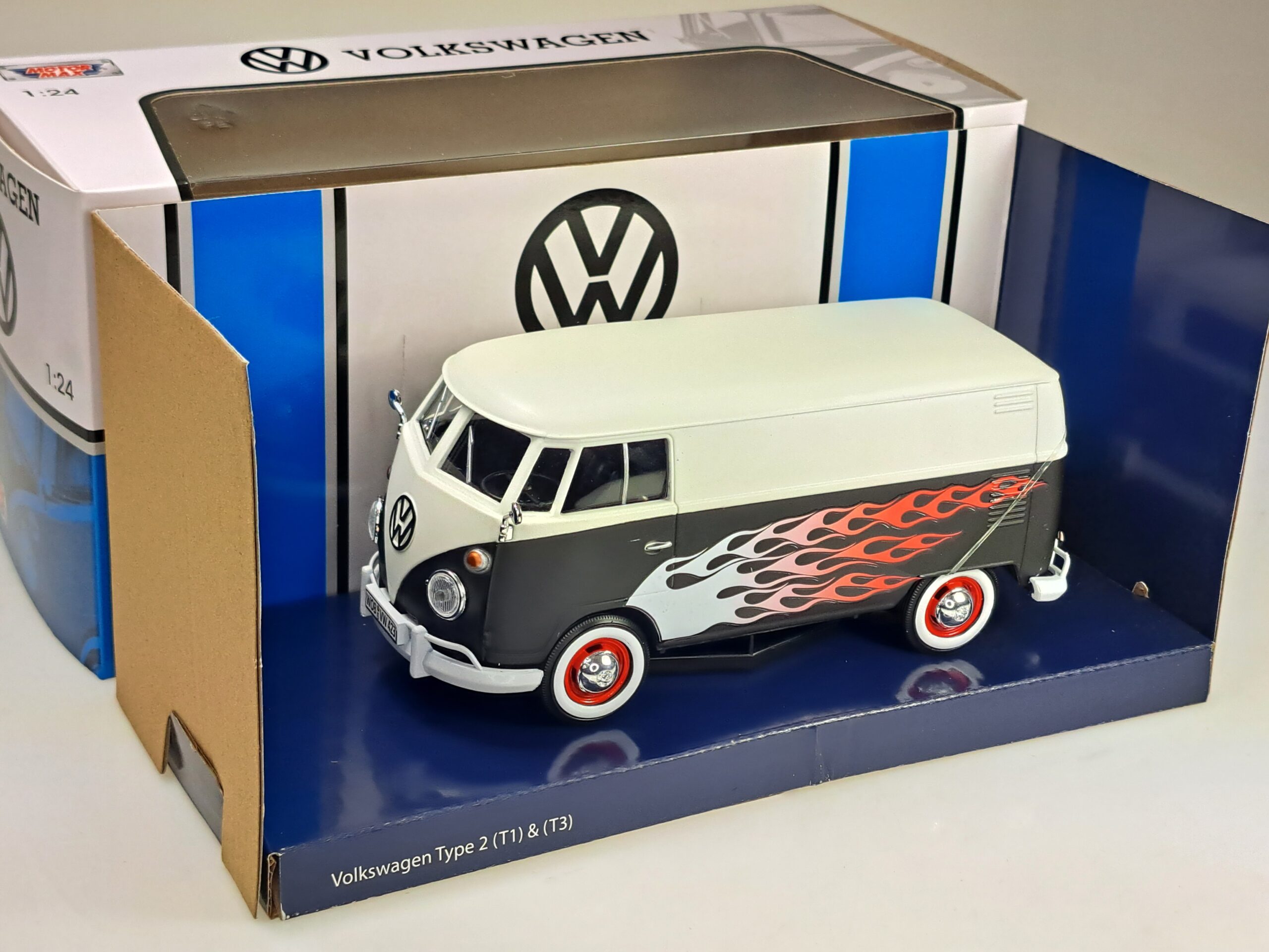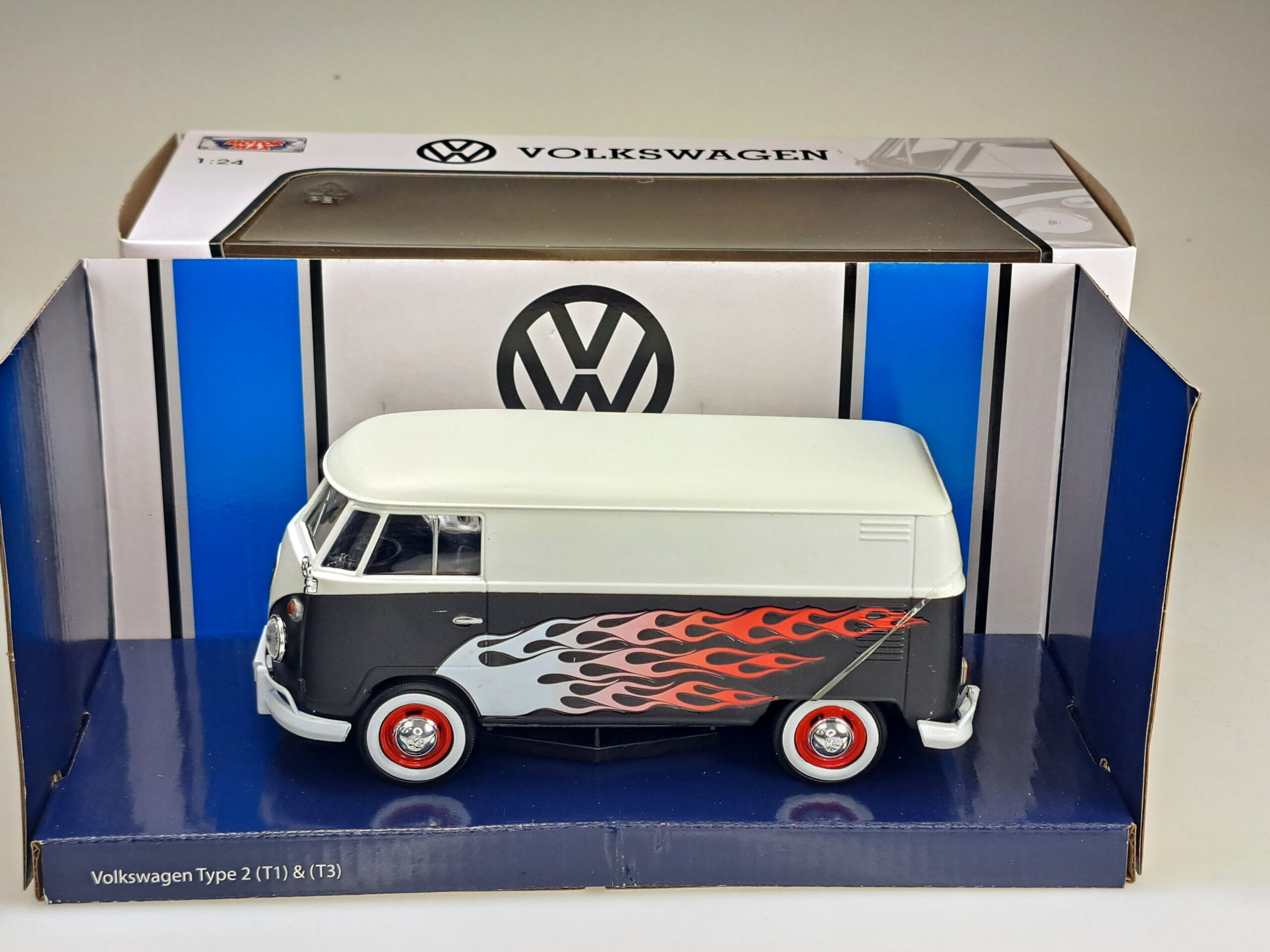 Kolekcjonerski model metalowy z elementami plastikowymi samochodu VOLKSWAGEN T1 (Type 2) Delivery van Hot Rod w kolorze Czarnym z grafiką.Posiada otwieraną tylną klapę.Model zapakowany w kartonowe pudełko witrynką.