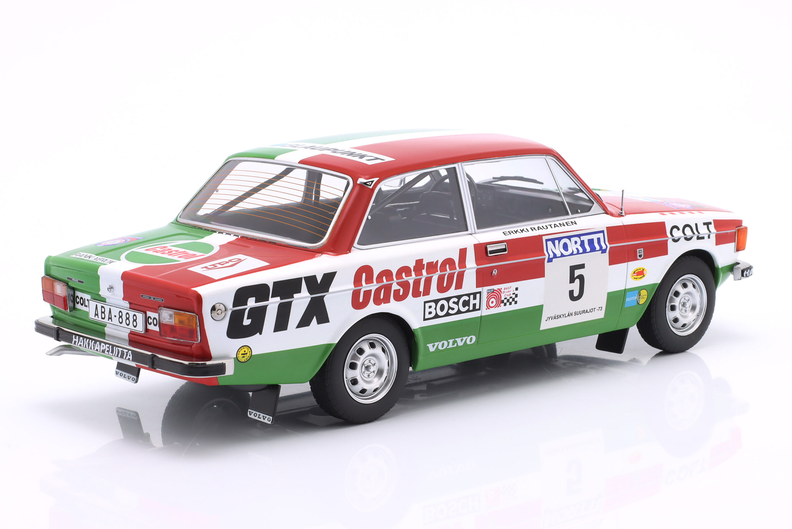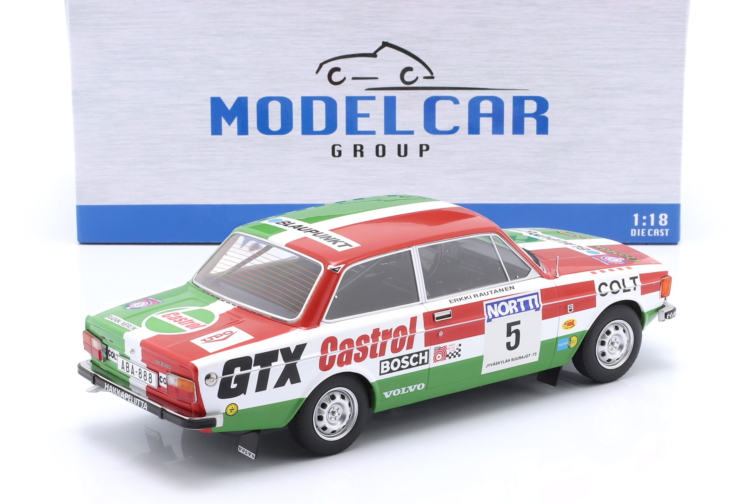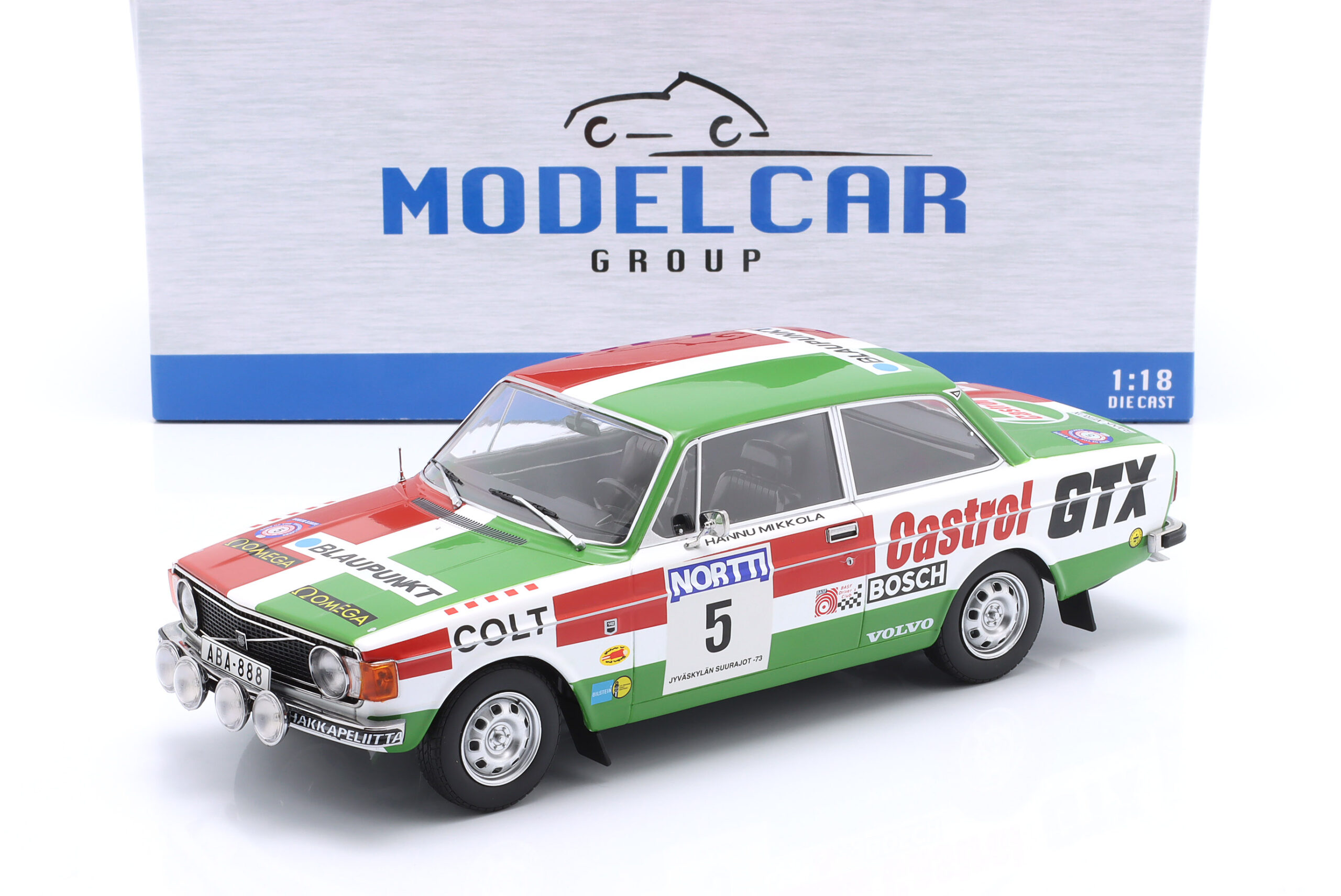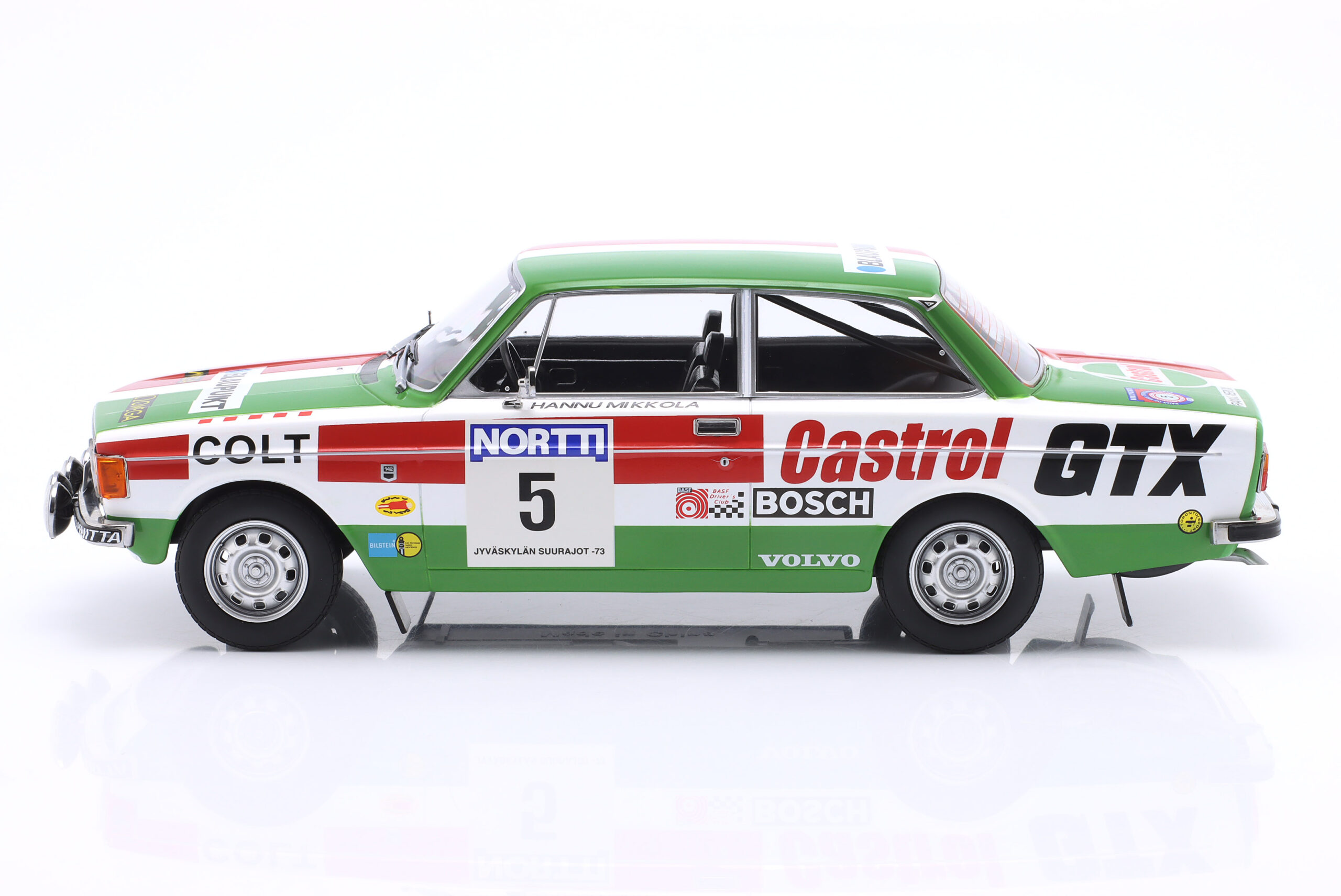Kolekcjonerski model metalowy z elementami plastikowymi samochodu rajdowego VOLVO 142 #5 w którym załoga H.Mikkola/E.Rautanen startowała w Rajdzie 1000 jezior (Rajd Finlandii) w roku 1973.Model metalowy,nie posiada otwieranych elementów.