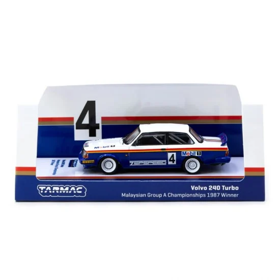 Kolekcjonerski model metalowy z elementami plastikowymi samochodu wyścigowego VOLVO 240 Turbo #4 za kierownicą którego Per Gunnar Andersson zwyciężył Mistrzostwach Malezji w roku 1987.Model na podstawce posiada akrylową gablotkę ekspozycyjną.