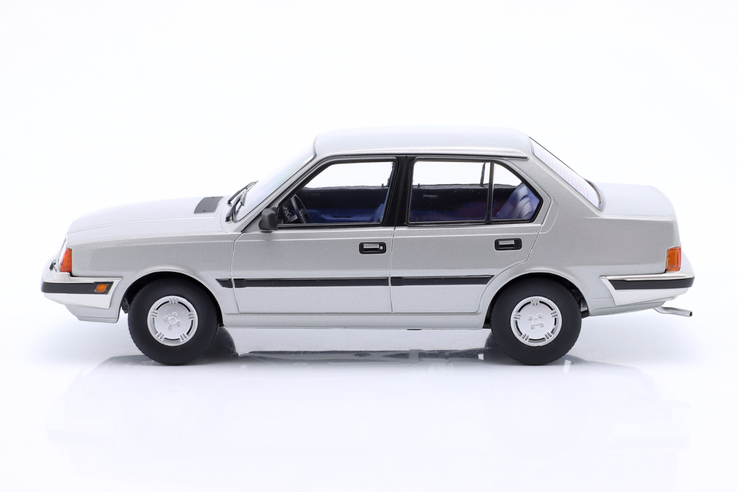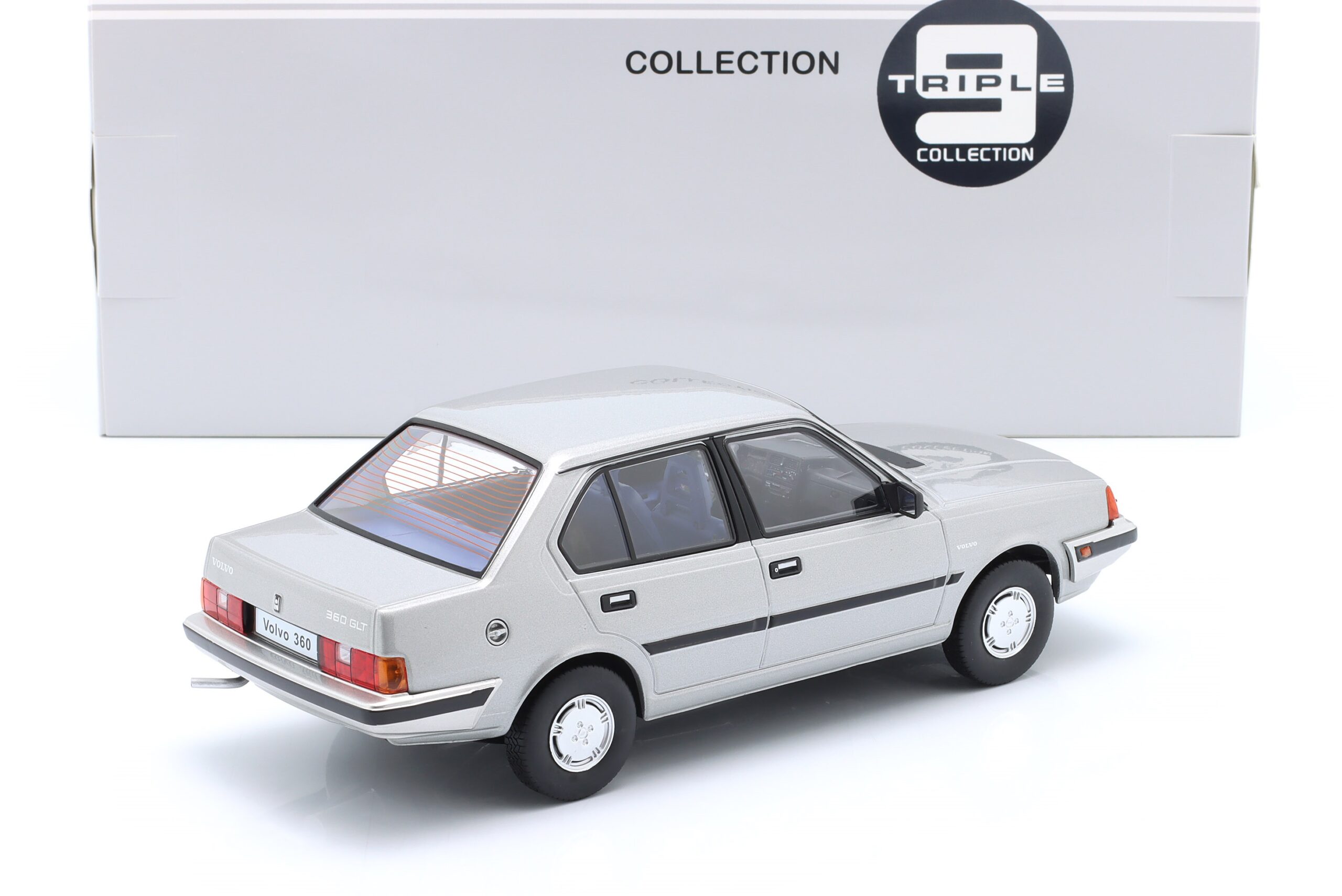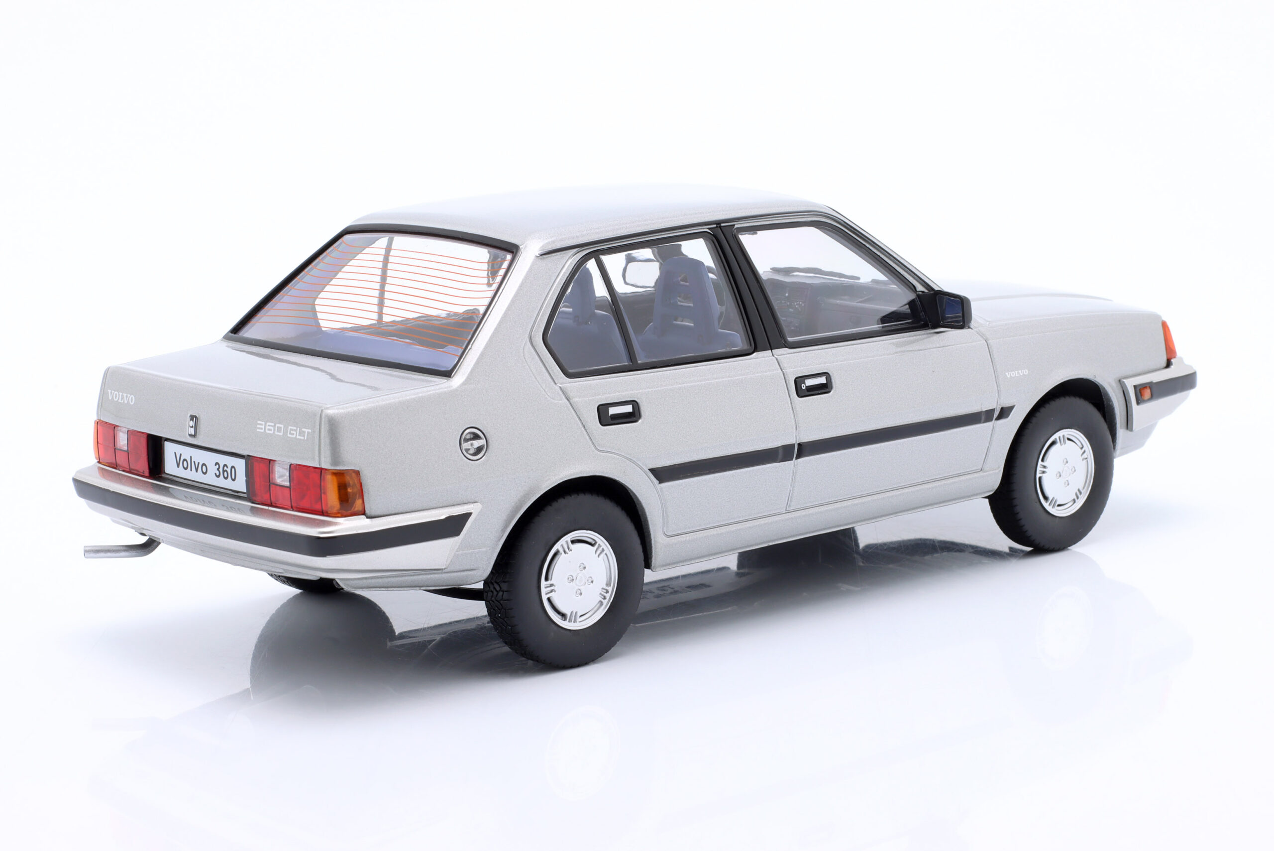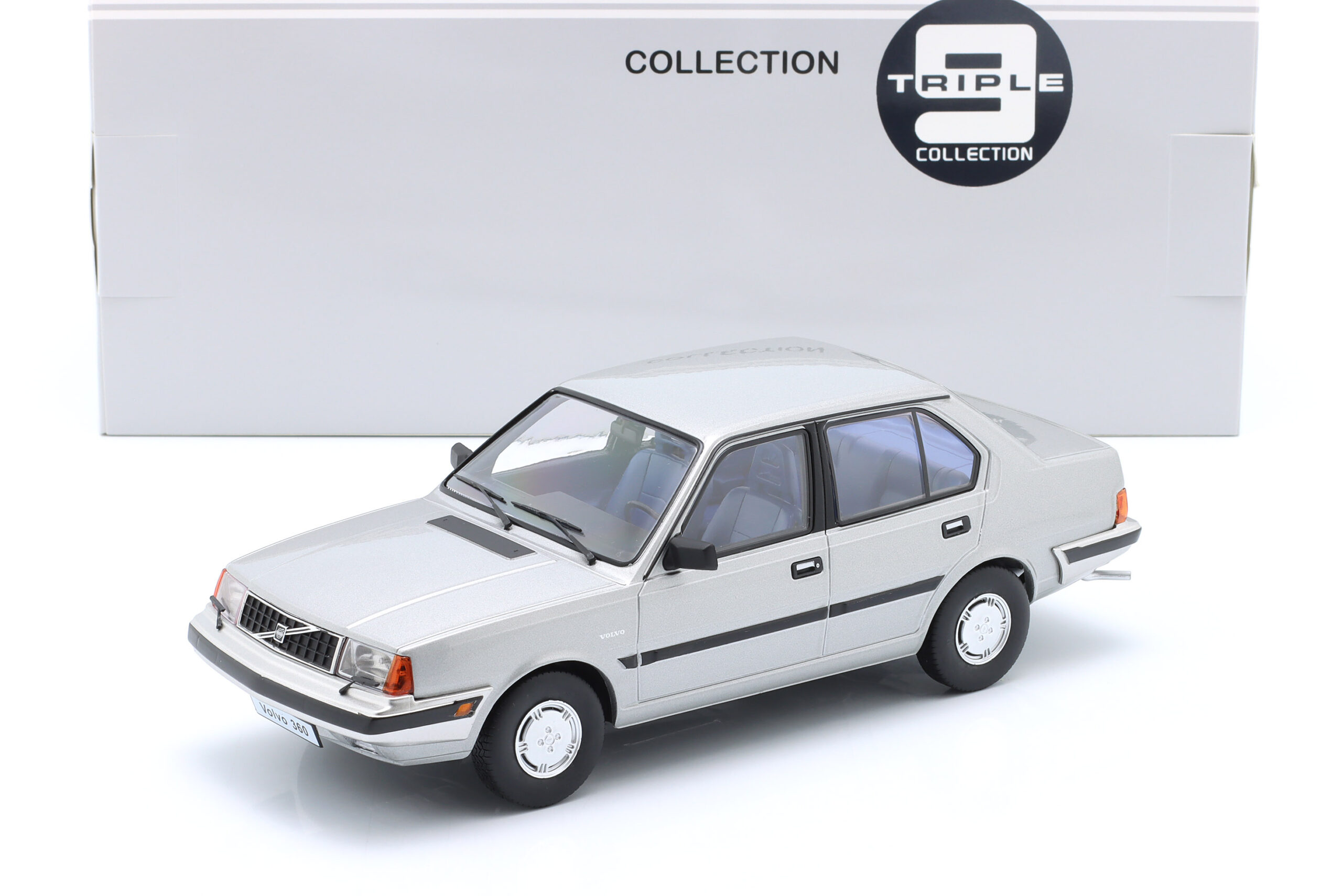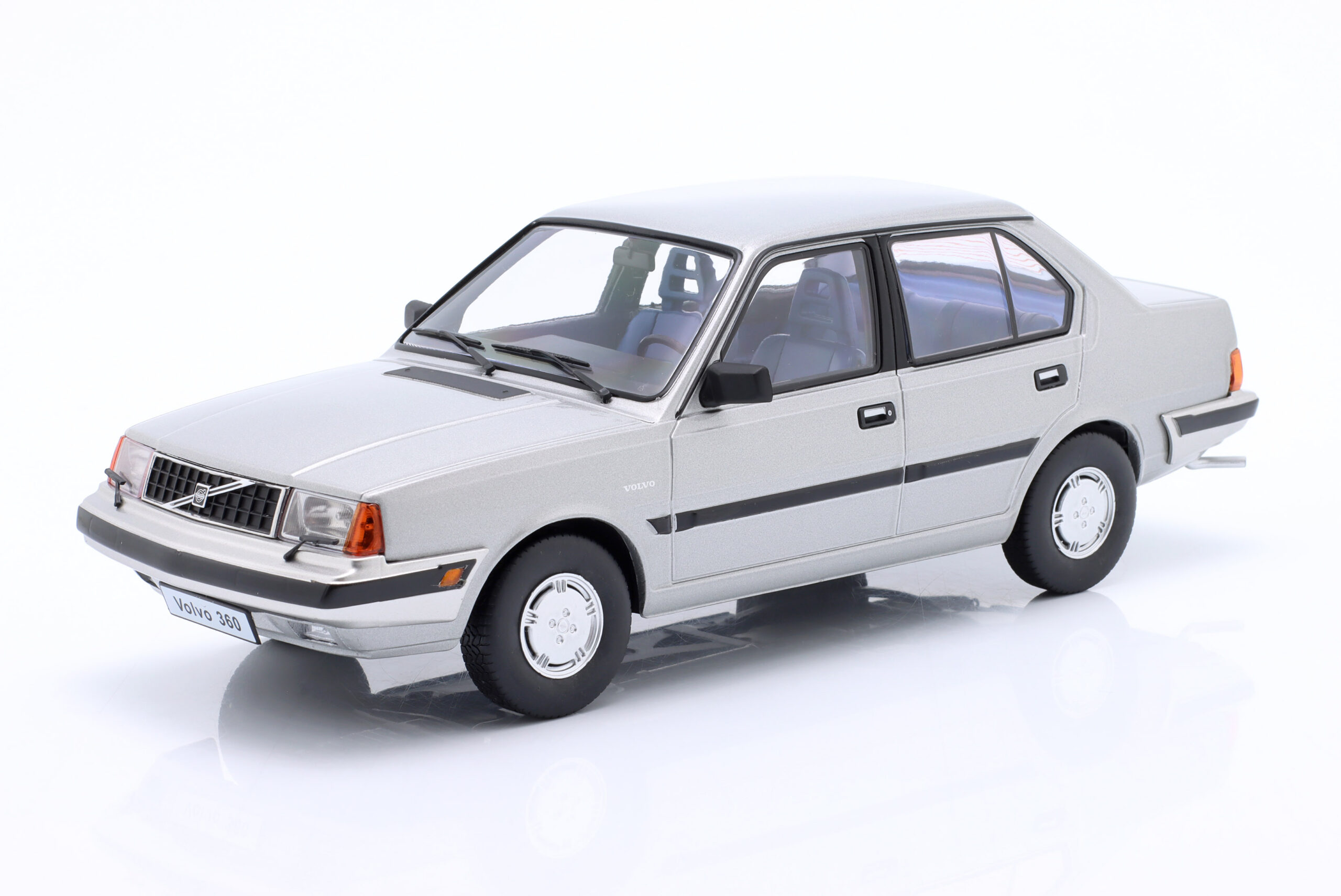 Kolekcjonerski model metalowy z elementami plastikowymi samochodu VOLVO 360 z roku 1987 w kolorze Srebrnoszary metallic.