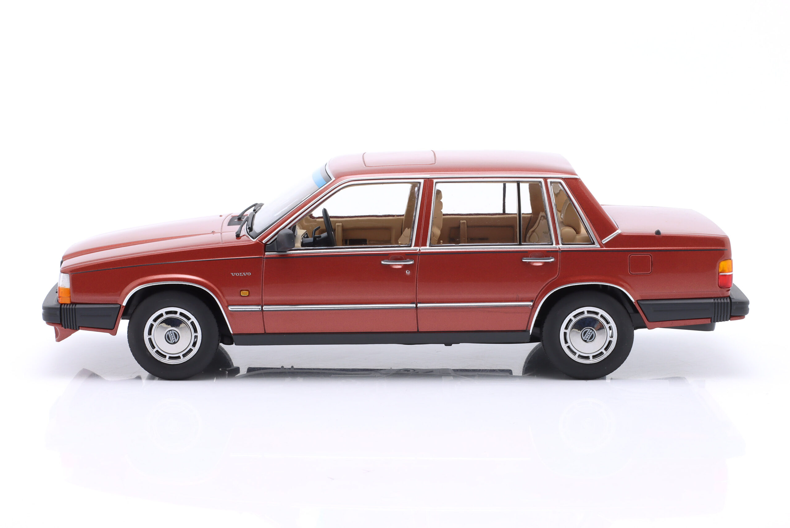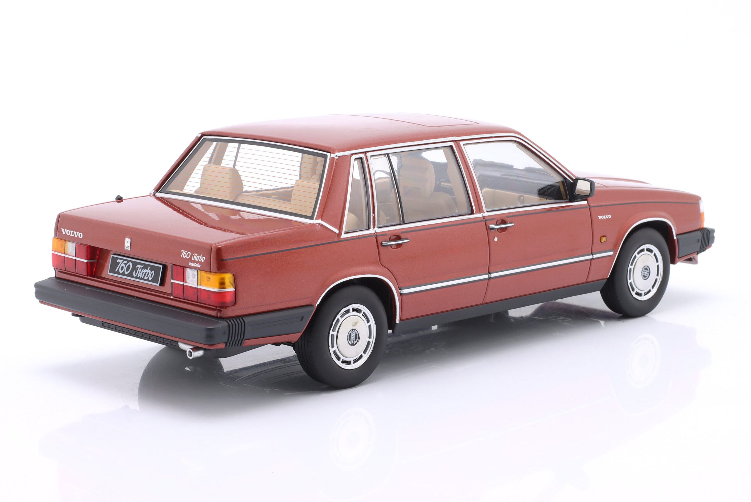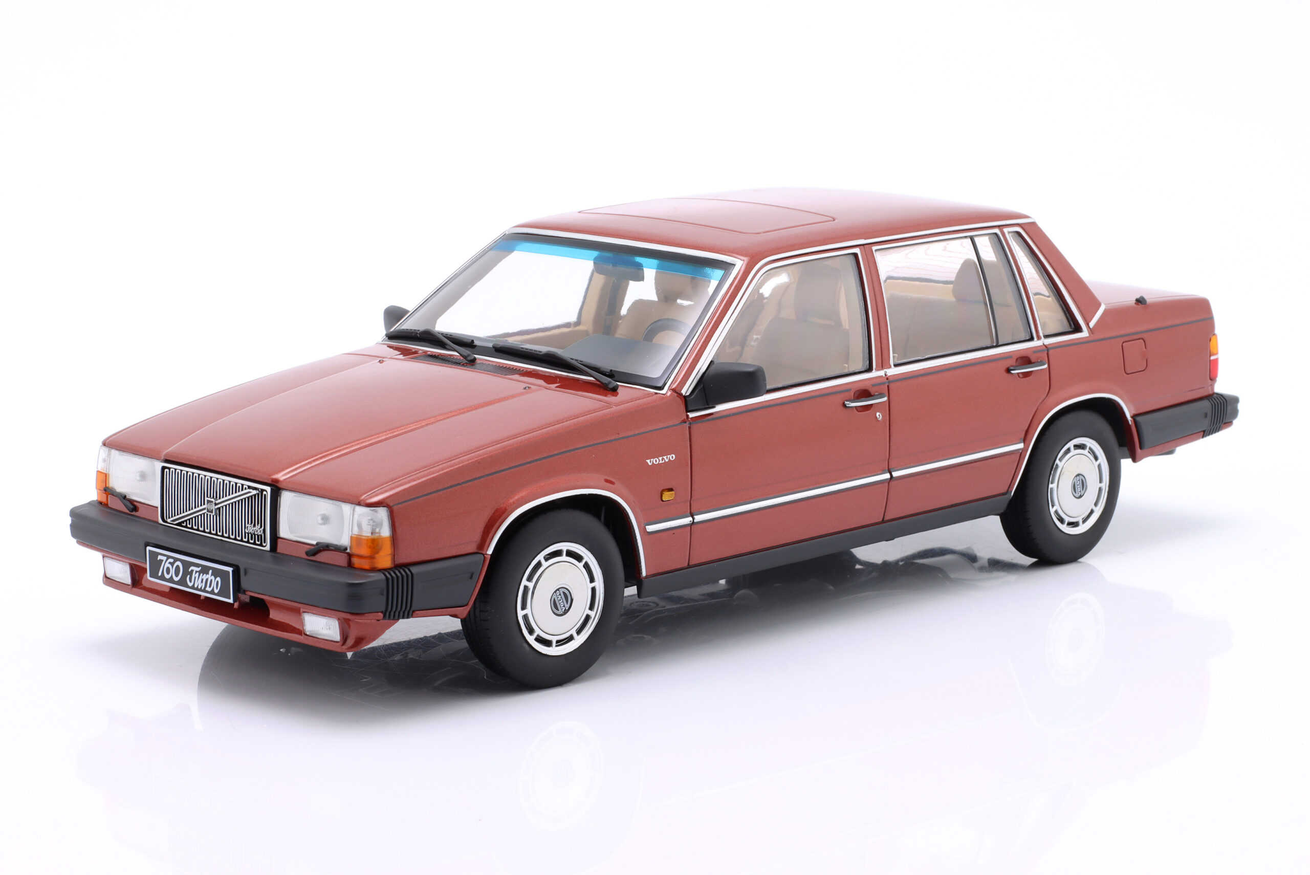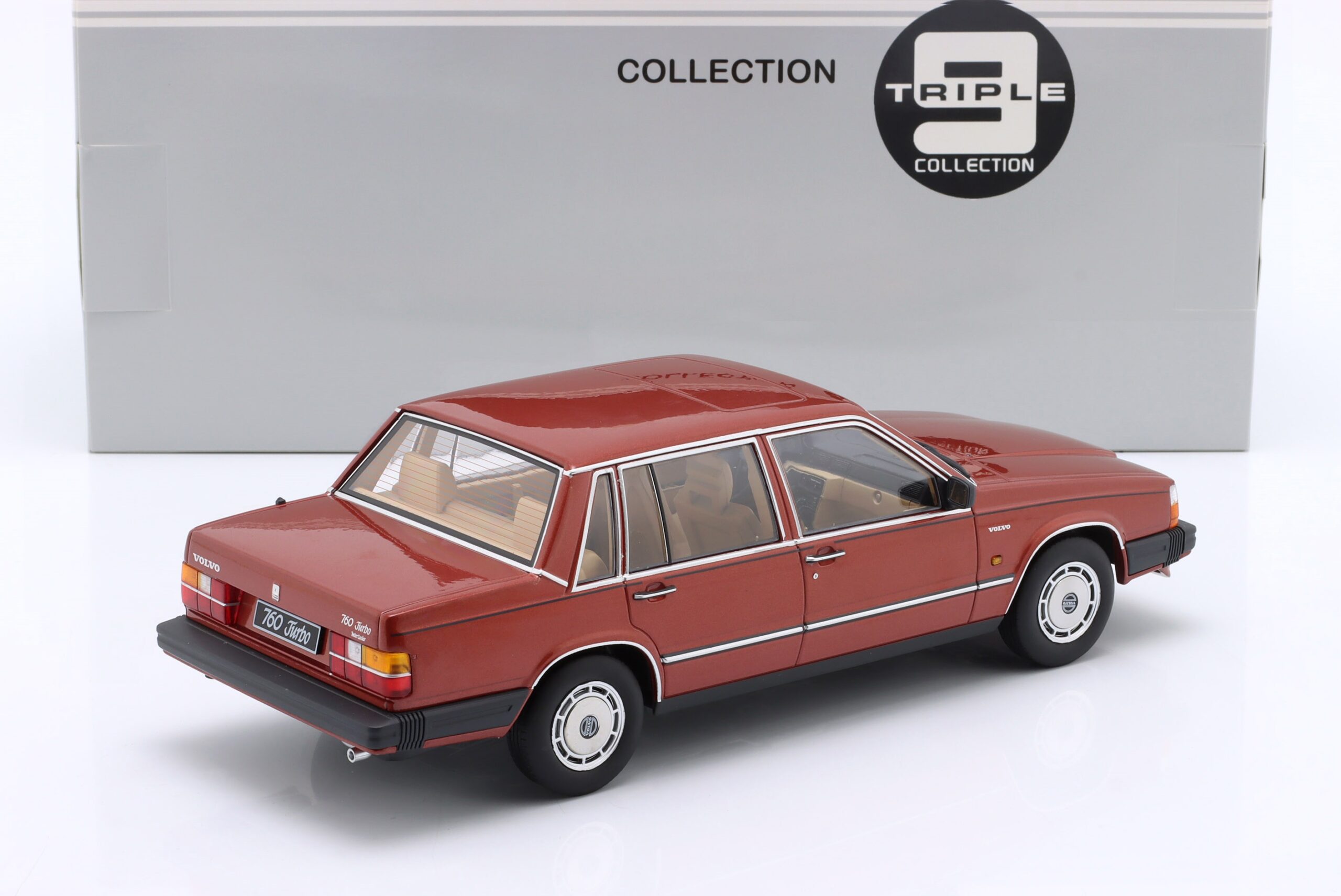 Kolekcjonerski model metalowy z elementami plastikowymi samochodu VOLVO 760 z roku 1985 w kolorze Ciemnoczerwony metallic.Model nie posiada otwieranych elementów.