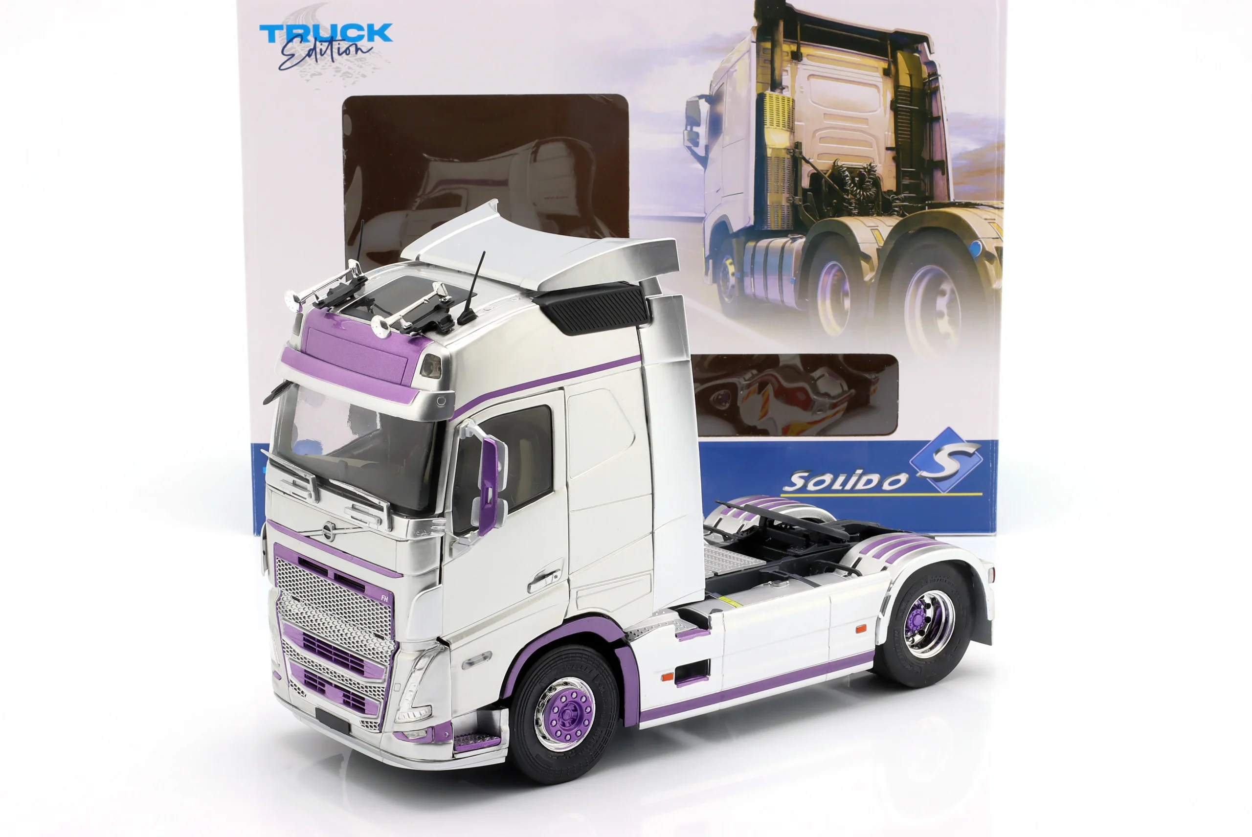 Kolekcjonerski model metalowy z elementami plastikowymi ciągnika siodłowego VOLVO FH GLOBETROTTER XL SZM z roku 2023 w kolorze Srebrny/fioletowy.