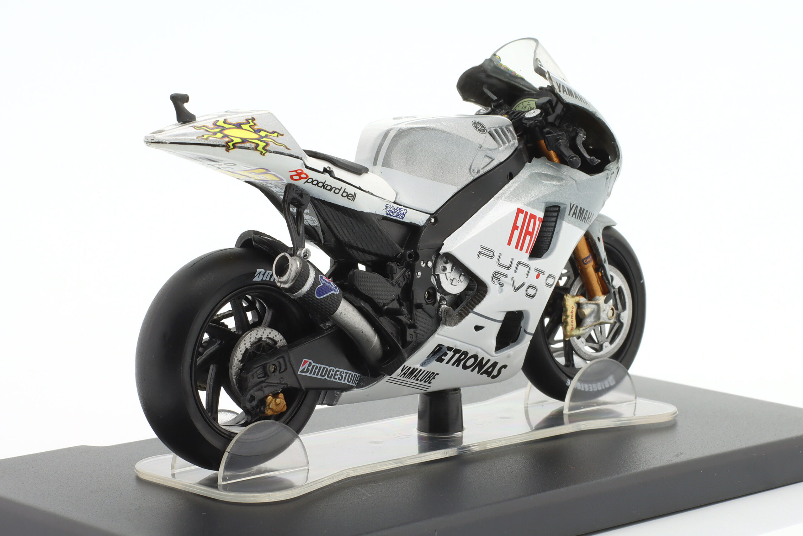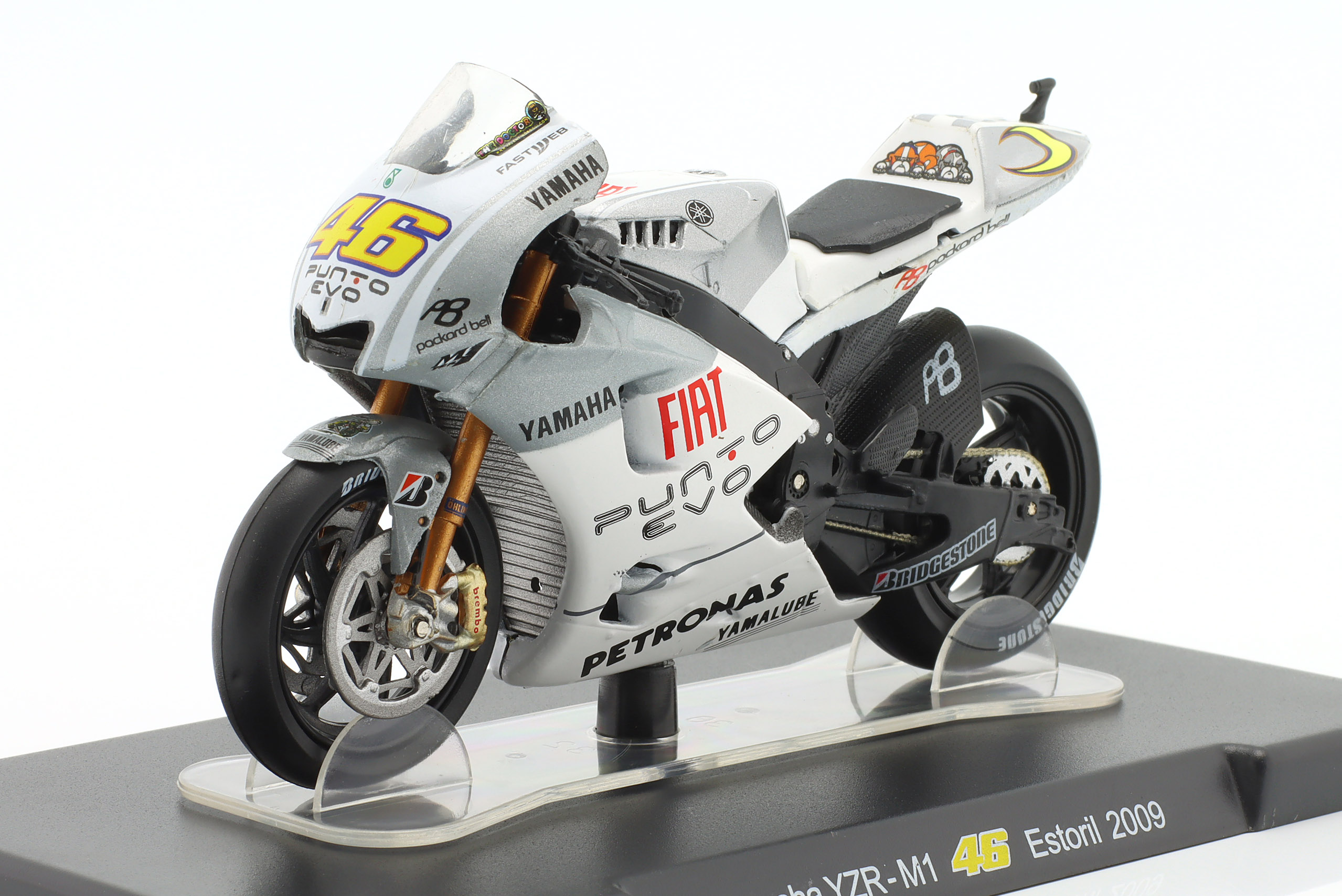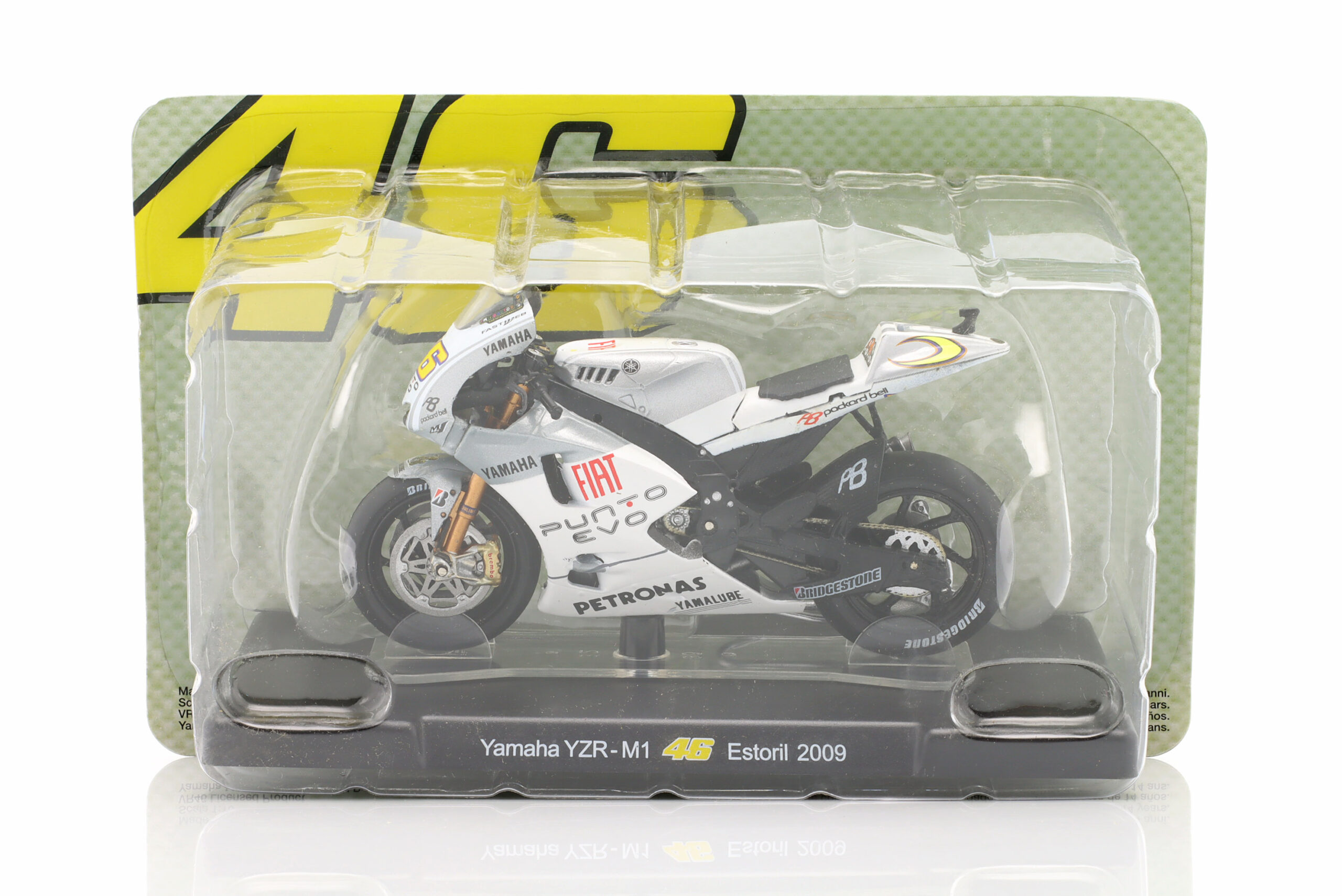 Kolekcjonerski model metalowy z elementami plastikowymi motocykla wyścigowego YAMAHA YZR-M1 #46,na którym Valentino Rossi ścigał się w Motocyklowych Mistrzostwach Świata na Torze Estoril w sezonie 2009.Model z serii VALENTINO ROSSI Colection.Model na podstawce,zapakowany w blister.