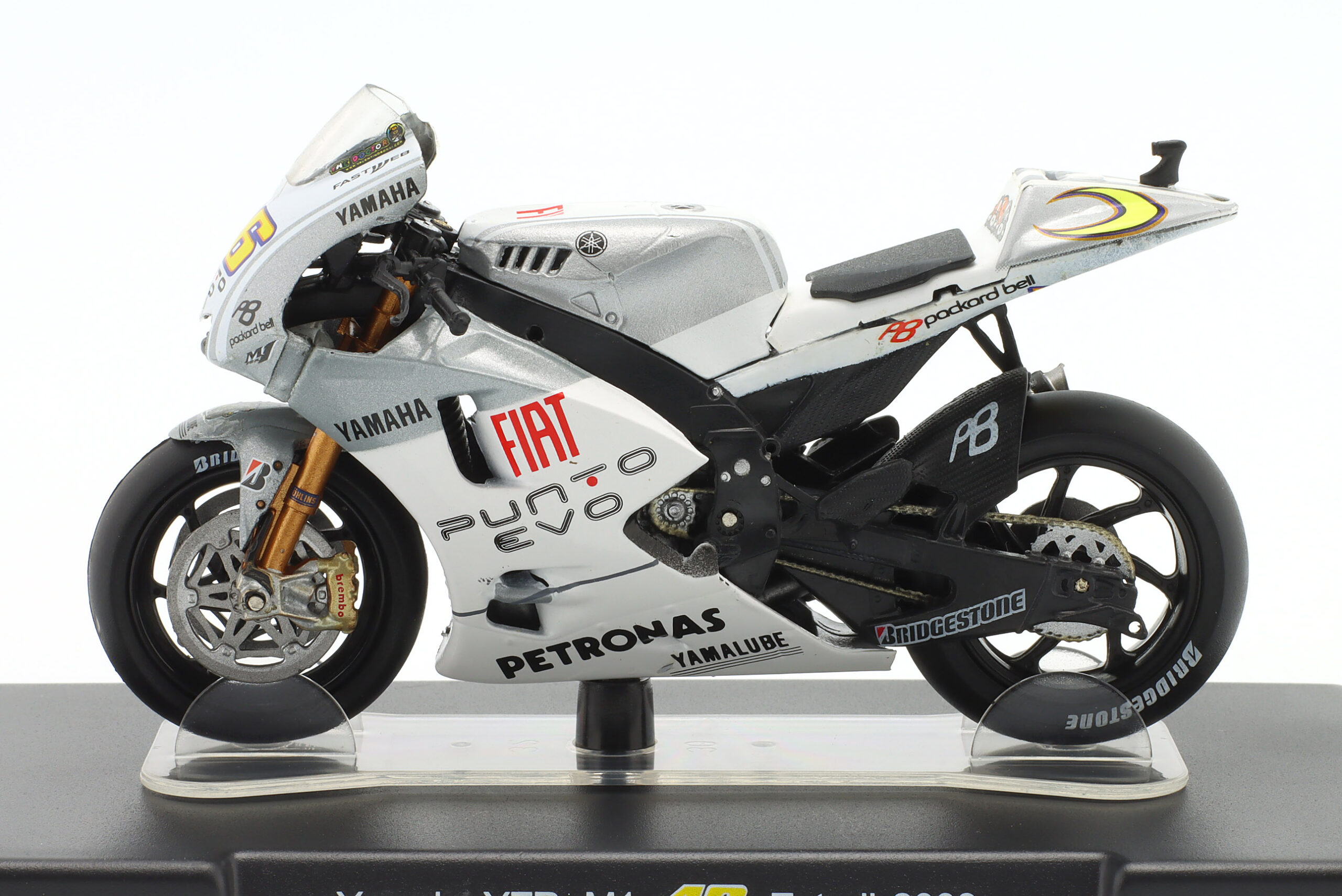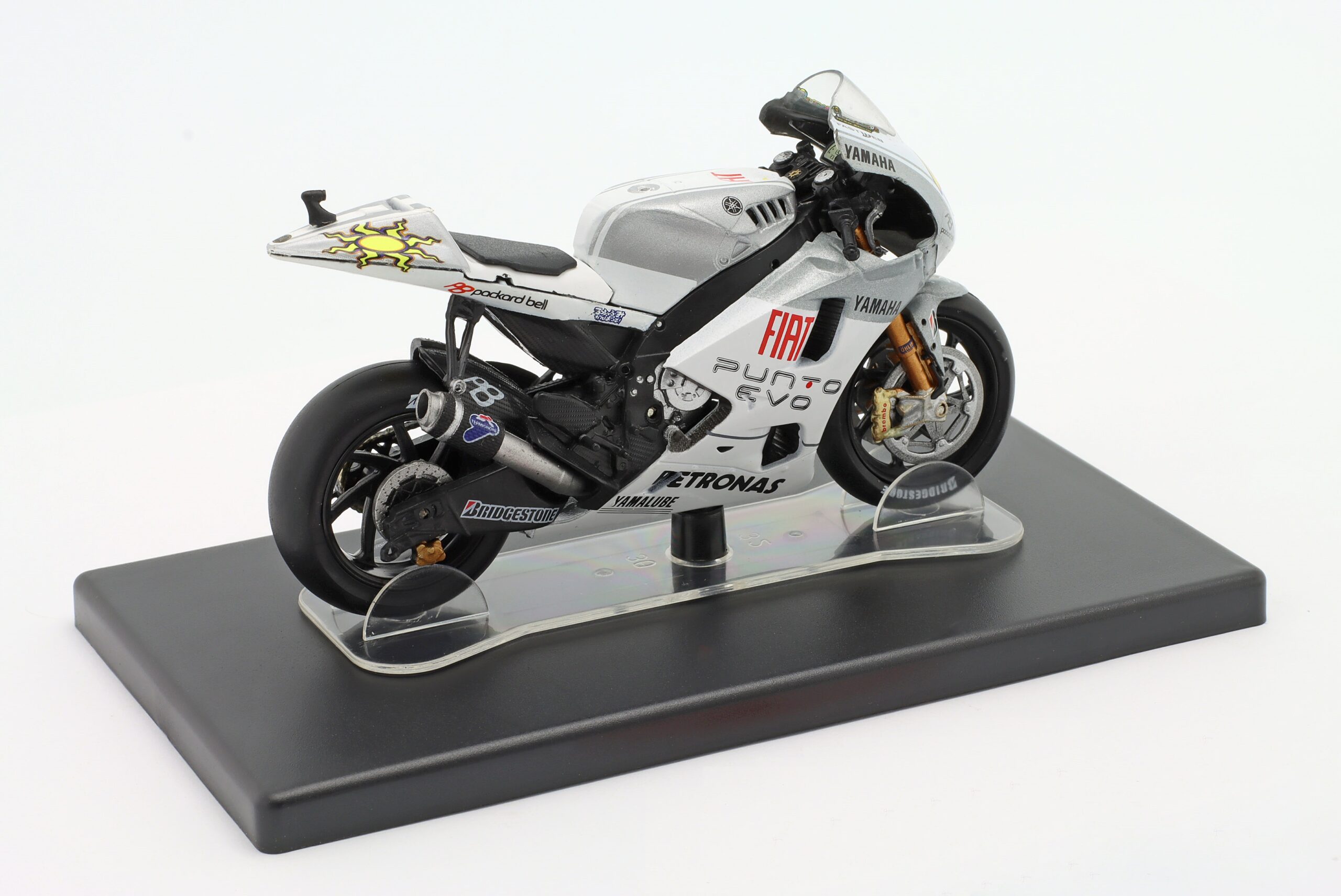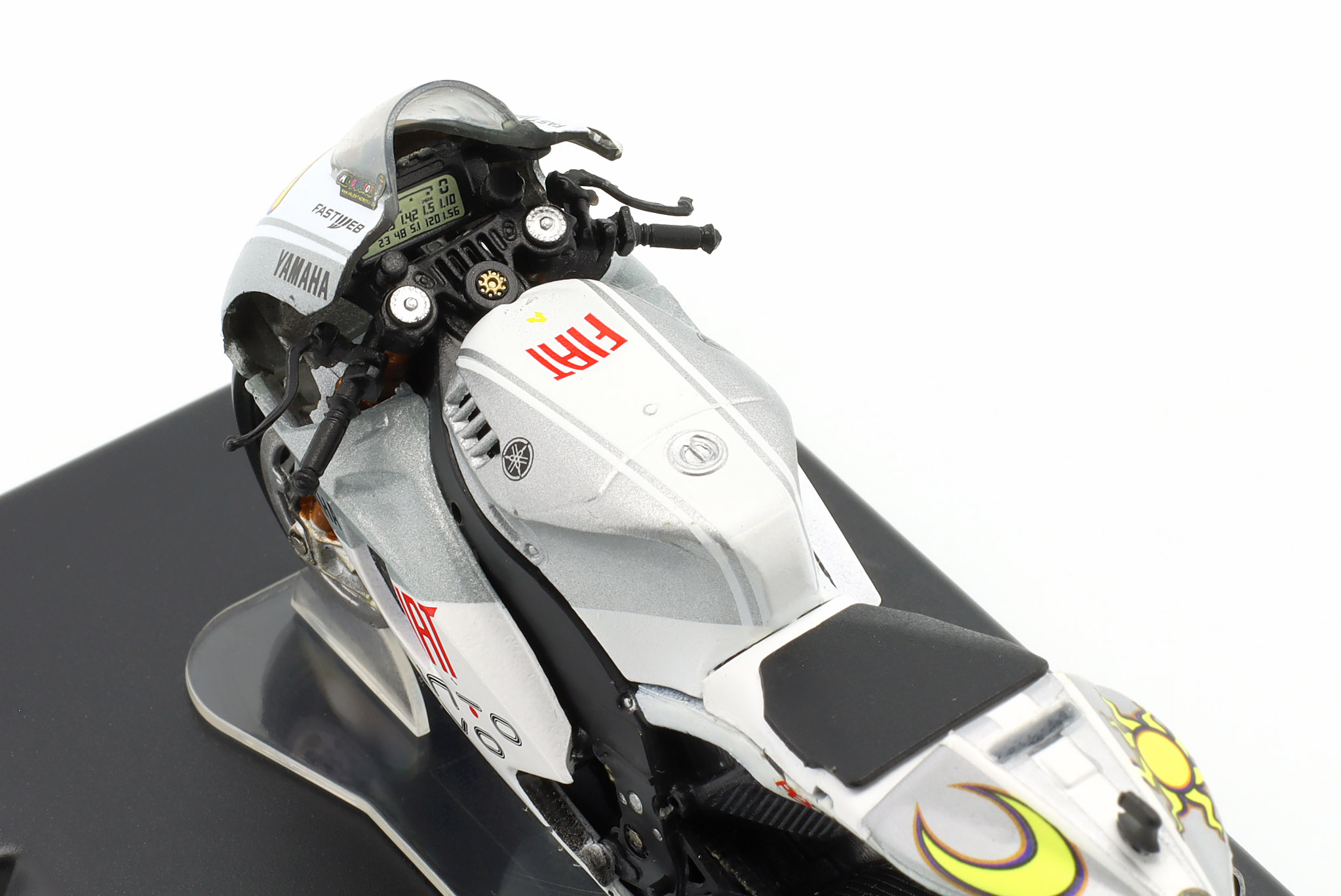 Kolekcjonerski model metalowy z elementami plastikowymi motocykla wyścigowego YAMAHA YZR-M1 #46,na którym Valentino Rossi ścigał się w Motocyklowych Mistrzostwach Świata na Torze Estoril w sezonie 2009.Model z serii VALENTINO ROSSI Colection.Model na podstawce,zapakowany w blister.