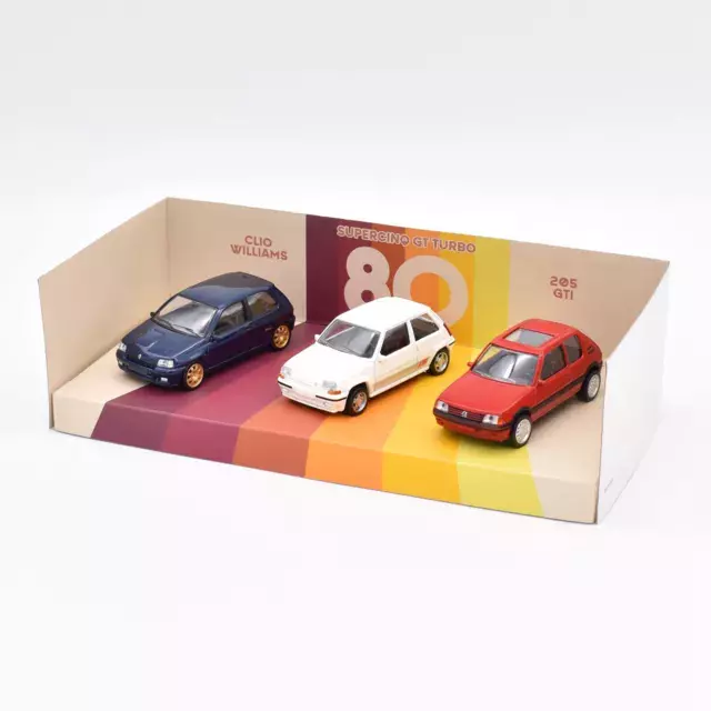 Kolekcjonerski zestaw modeli kolekcjonerskich wykonanych z metalu (1993 Renault Clio Williams,1988 Renault 5 GT,1984 Peugeot 205 GTi).Modele z serii JET-CAR
